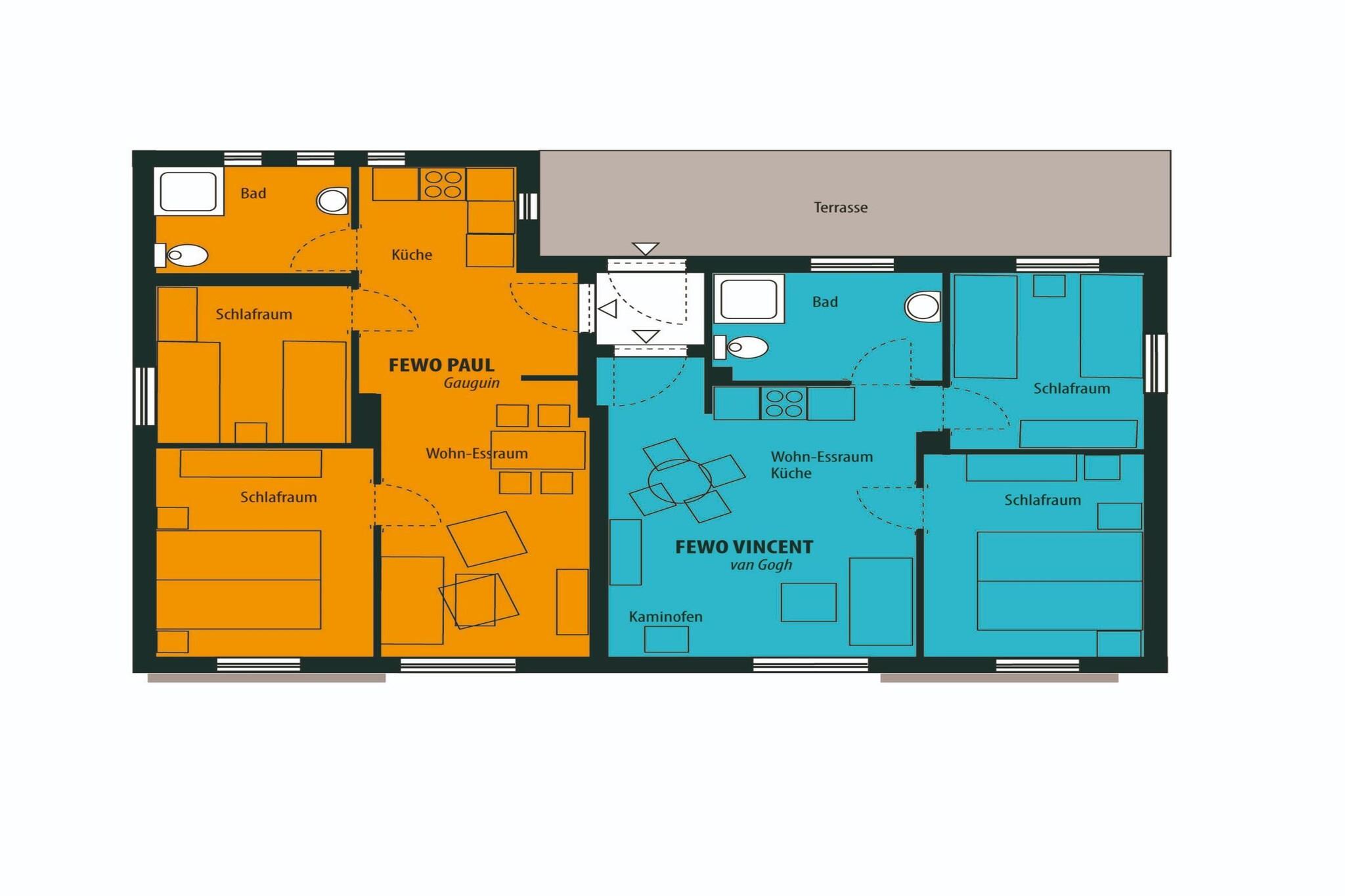 Parterre: (offene Küche(Wasserkocher, Kochherd, Kaffeemaschine, Backofen, Kühlschrank), Wohn/Esszimmer(TV, Esstisch, Kaminofen, Sitzecke), Schlafzimmer(Doppelbett), Schlafzimmer(Einzelbett, Einzelbett), Badezimmer(Dusche, Waschbecken, Toilette), Balkon oder Terrasse, Heizung(Fußbodenheizung)) Garten, Gartenmöbel, Grill, Parkplatz, Kinderbett, Hochstuhl