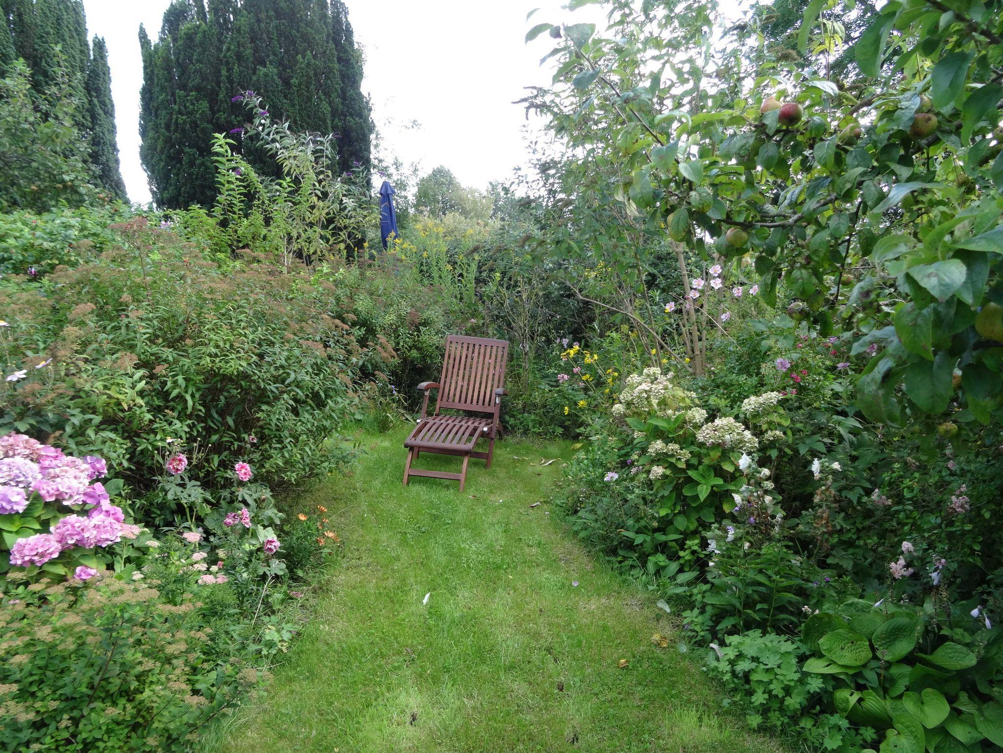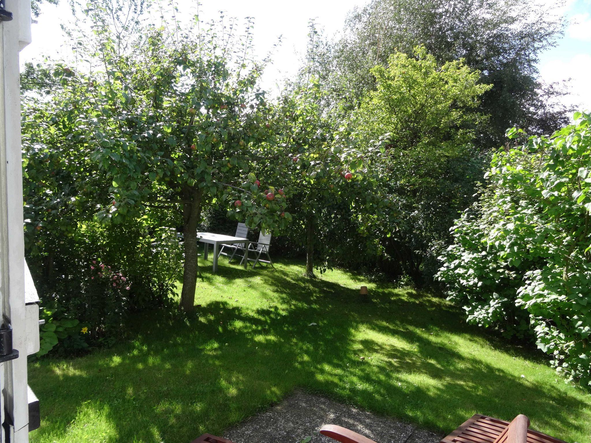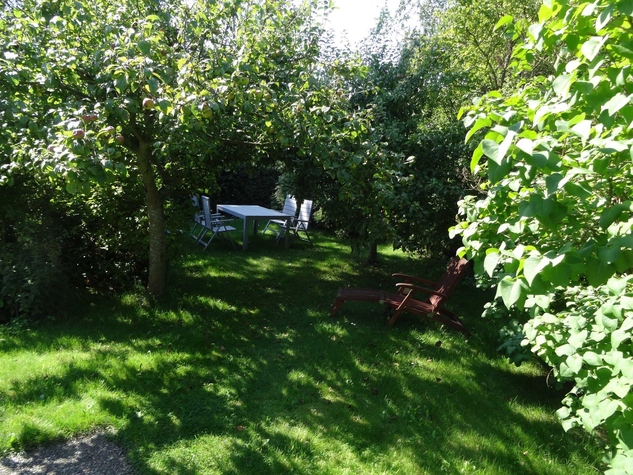 Im schönen Garten hat jede Ferienwohnug eine separate Sitzgelegenheit mit Gartenmöbeln, Grill und Sonnenschirm. Der Gast sitzt inmitten von blühenden Planzen und Obstbäumen.