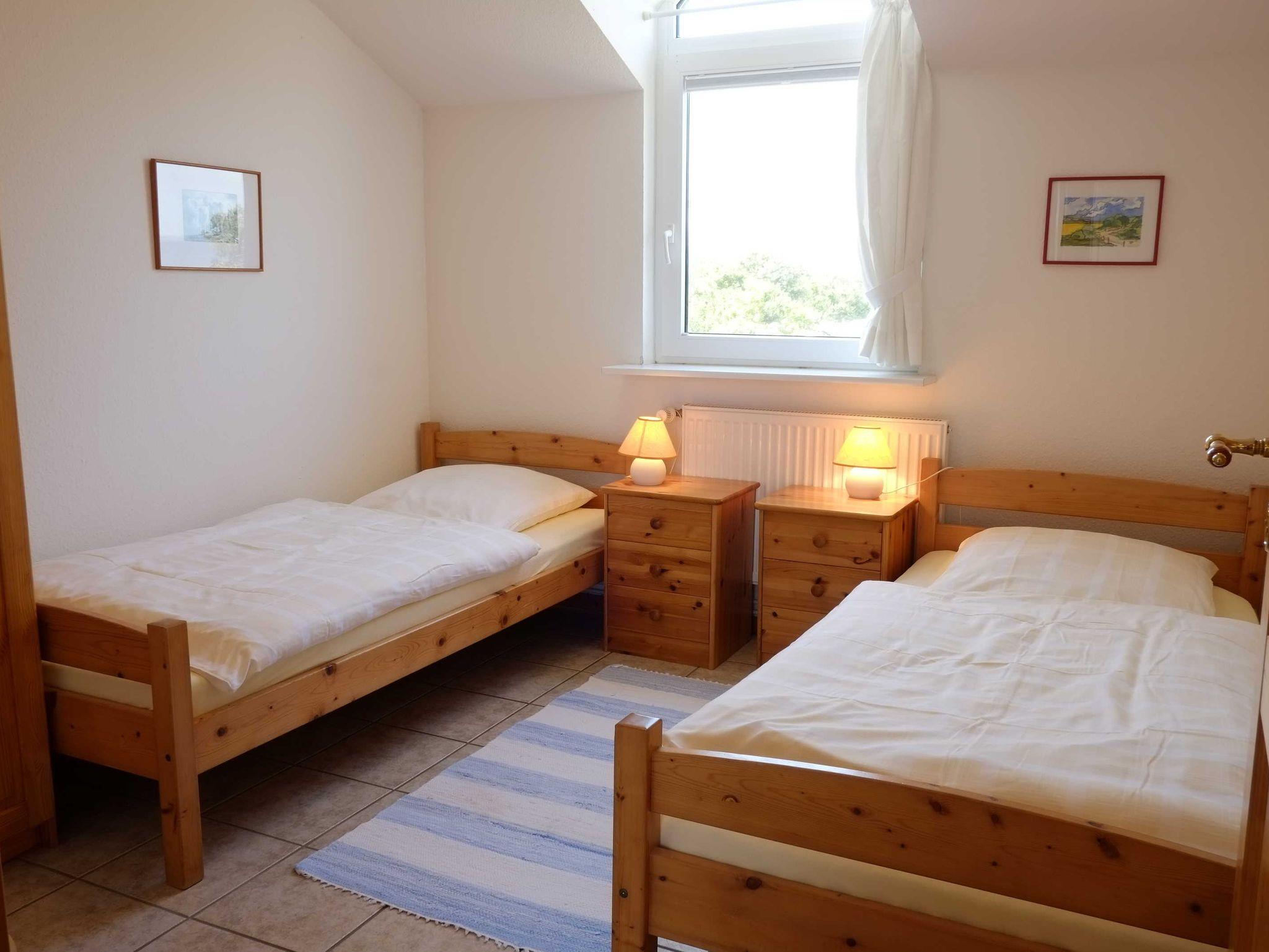 zwei Einzelbetten, einen großzügigen Wohnraum und ein Duschbad. Im
