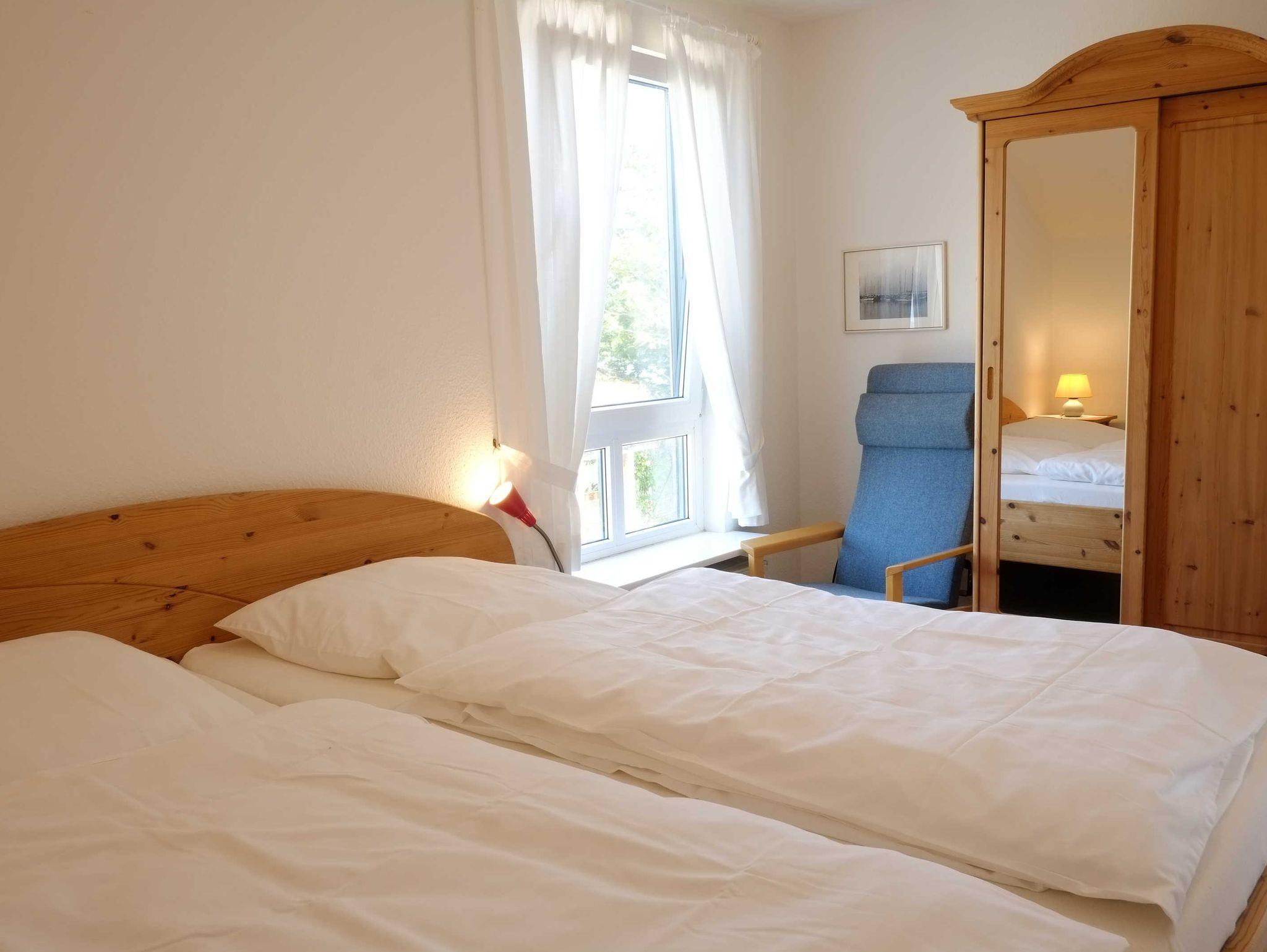 Die Fenster des Wohnraumes blicken nach Süden, die der Schlafzimmer nach Norden, aus allen Fenstern blickt man auf die Ostsee. Die Wohnungen sind Nichtraucherwohnungen, vor den Wohnungen auf der Südseite gibt es eine kleine Balustrade mit Sitzmöglichkeit und mit Blick auf die Ostsee. Der Fußboden der Wohnungen ist komplett gefliest. Die Wohnungen verfügen über jeweils zwei Schlafzimmer, eines mit Doppelbett, eines mit zwei Einzelbetten, einen großzügigen Wohnraum und ein Duschbad. Im Wohnraum gibt es eine Fernsehecke mit einem Ecksofa, einen Essplatz für vier Personen und eine kleine Küchenzeile. Die Pantry-Küche ist ausgestattet mit ausreichend Geschirr und Kochgeschirr, es gibt zwei Kochplatten sowie eine Mikrowelle mit Heißluftfunktion, Toaster, Eierkocher, Kaffeemaschine und Wasserkocher. Die Wohnungen sind freundlich und individuell eingerichtet.