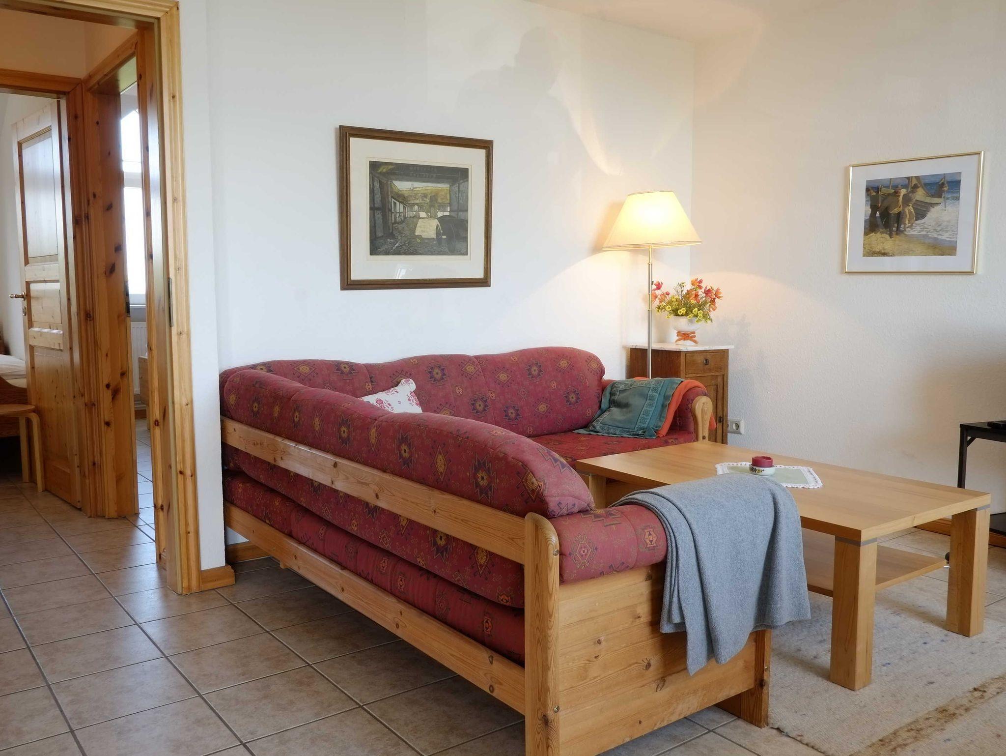 Unsere Wohnungen sind Nichtraucherwohnungen, vor den Wohnungen auf der Südseite gibt es eine kleine Balustrade mit Sitzmöglichkeit und mit Blick auf die Ostsee. Der Fußboden der Wohnungen ist komplett gefliest. Die Wohnungen verfügen über jeweils zwei Schlafzimmer, eines mit Doppelbett, eines mit zwei Einzelbetten, einen großzügigen Wohnraum und ein Duschbad. Im Wohnraum gibt es eine Fernsehecke mit einem Ecksofa, einen Essplatz für vier Personen und eine kleine Küchenzeile. Die Pantry-Küche ist ausgestattet mit ausreichend Geschirr und Kochgeschirr, es gibt zwei Kochplatten sowie eine Mikrowelle, Toaster, Eierkocher, Kaffeemaschine und Wasserkocher. Die Wohnungen sind freundlich und individuell eingerichtet.