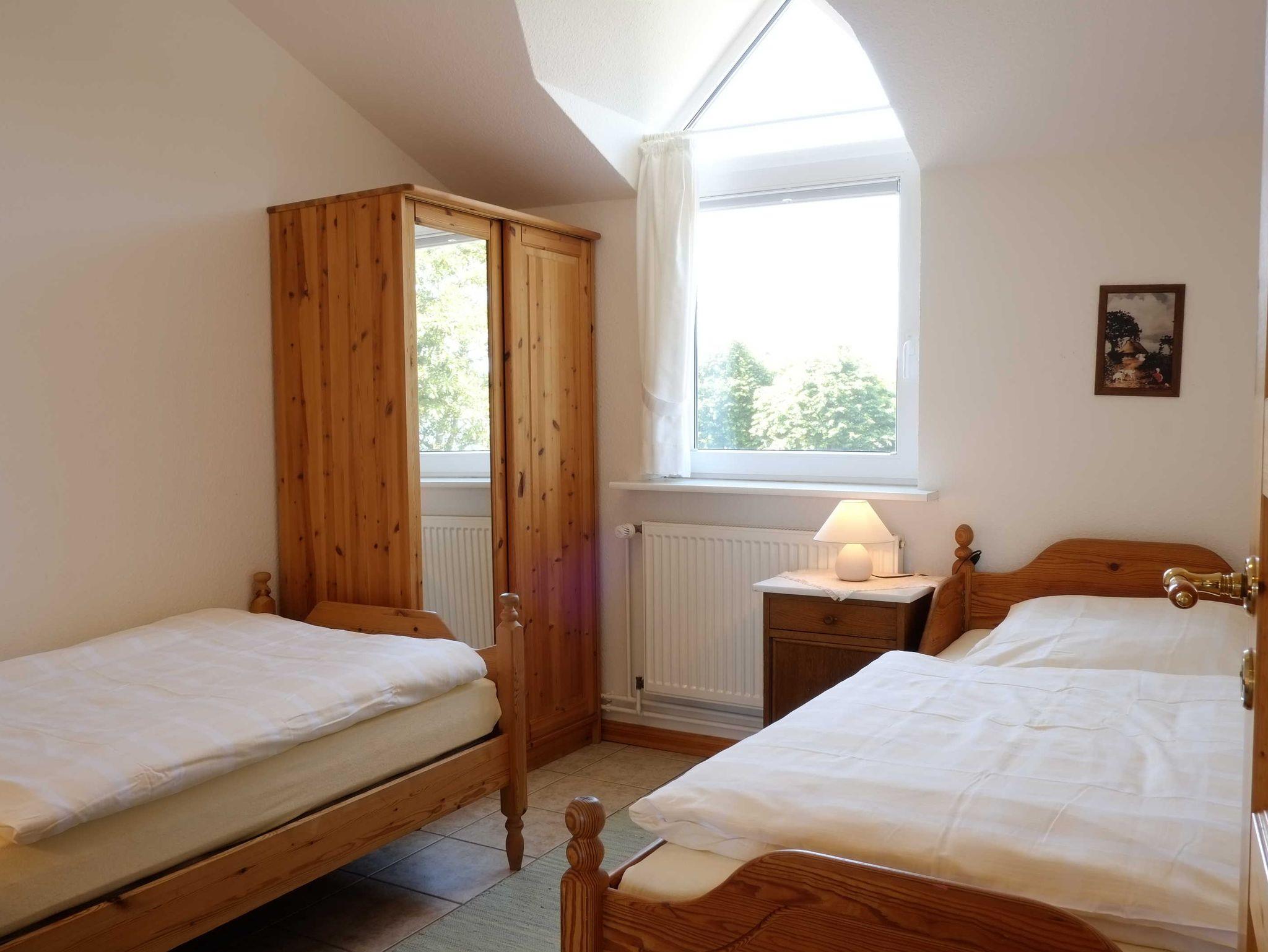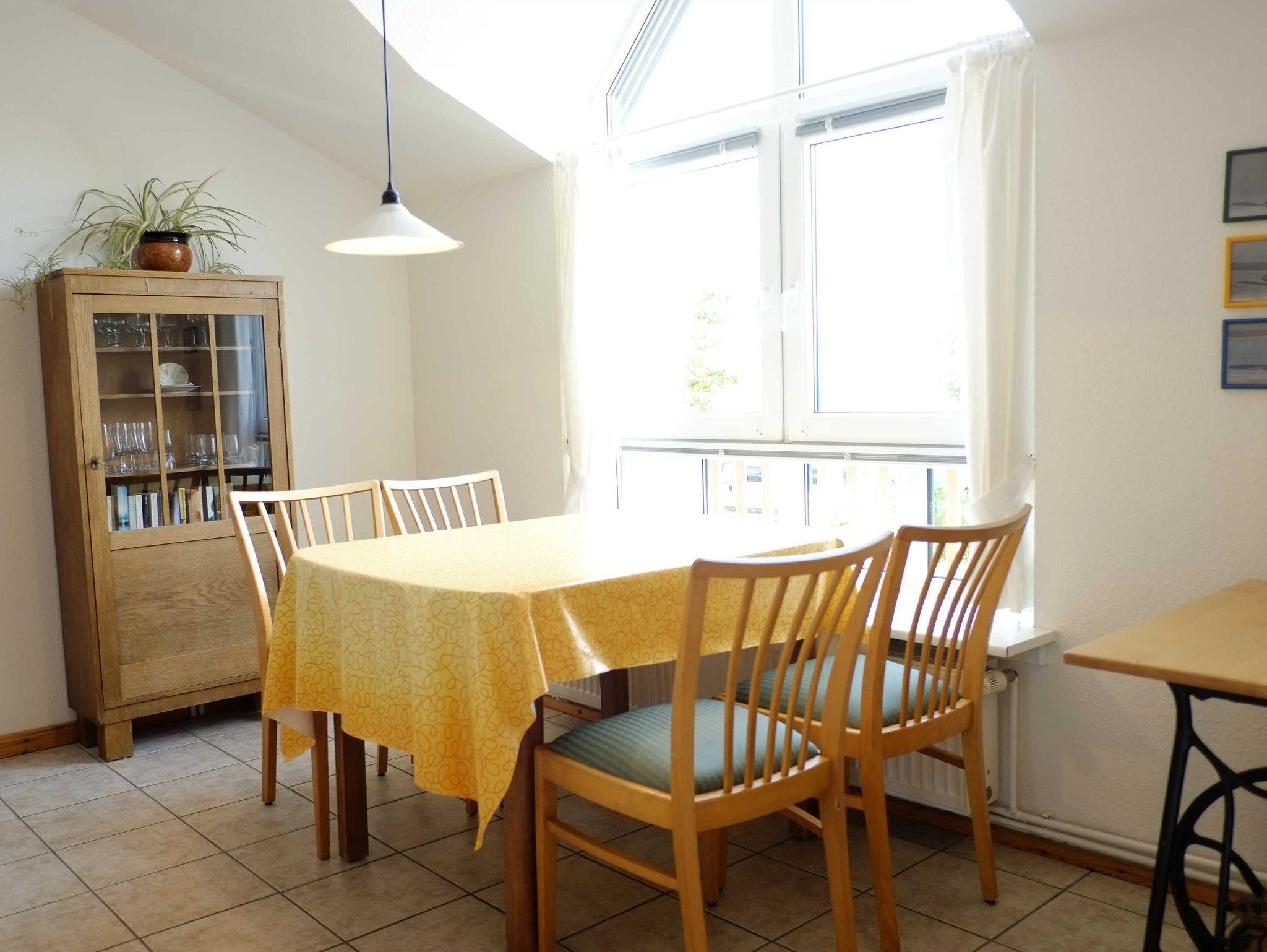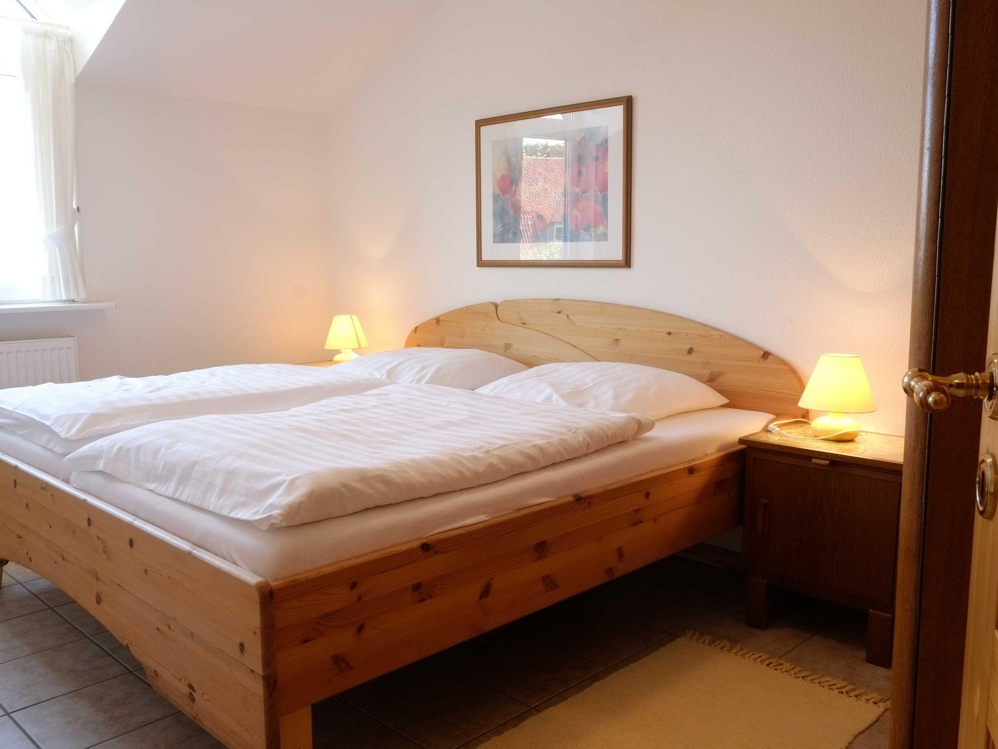 Sie liegt im ersten Stock und ist über eine Außentreppe zu erreichen. Die Fenster des Wohnraumes blicken nach Süden, die der Schlafzimmer nach Norden, aus allen Fenstern blickt man auf die Ostsee.