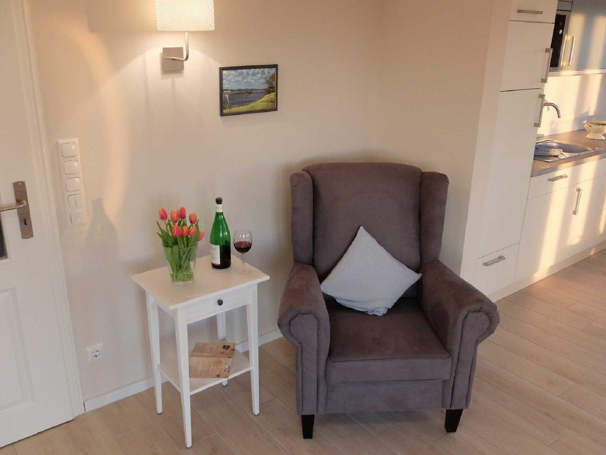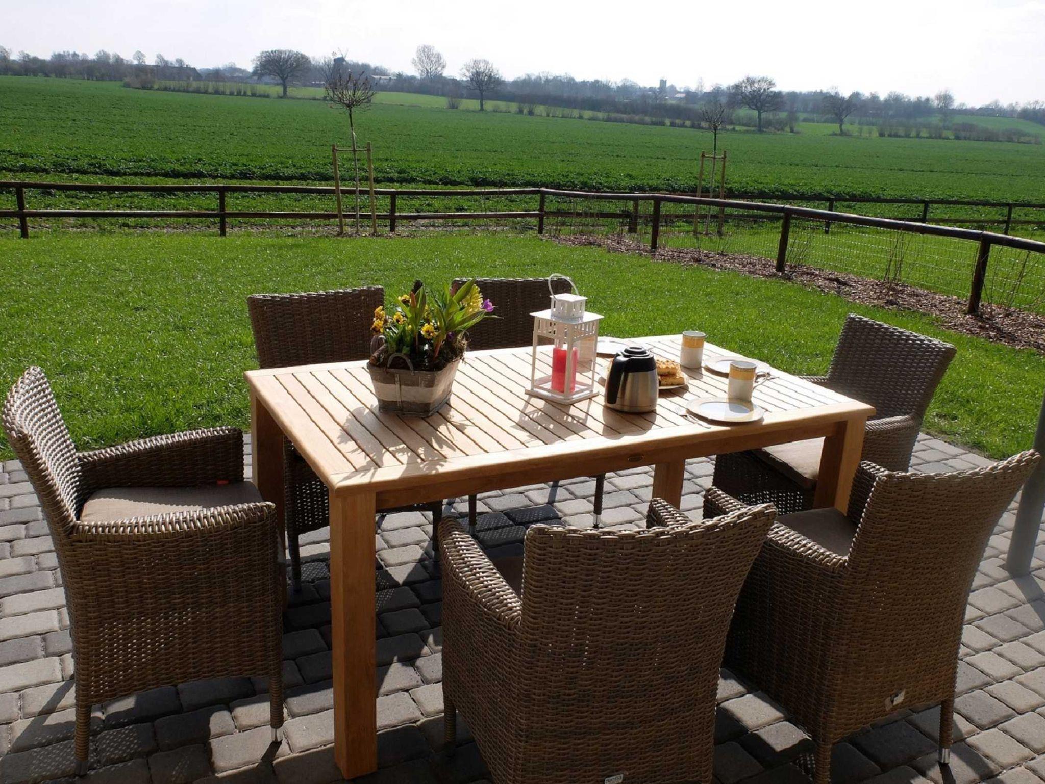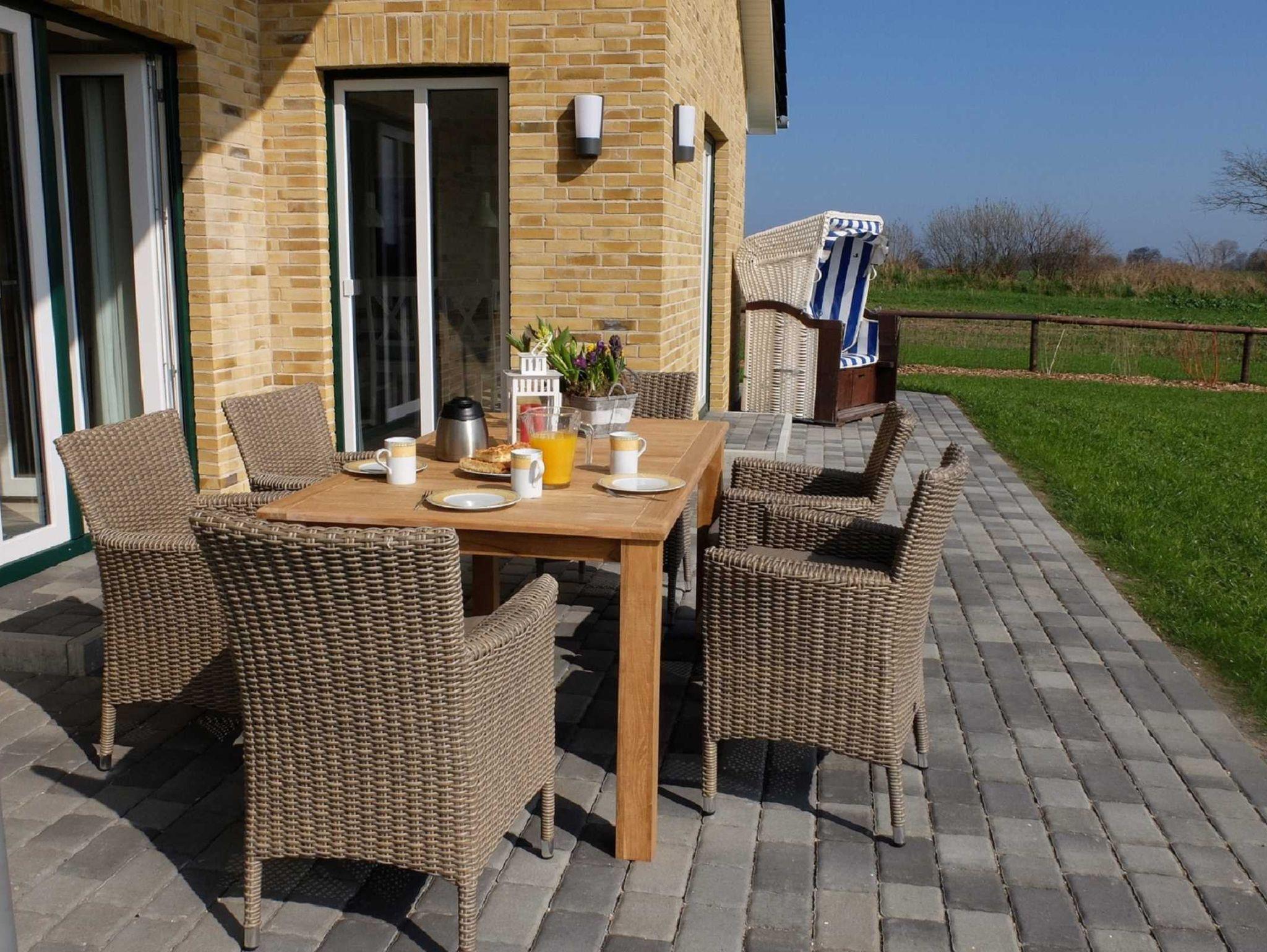 - teilweise überdachte Terrasse mit Sitzmöbeln, Strandkorb und weitem Blick über Wiesen und Felder.