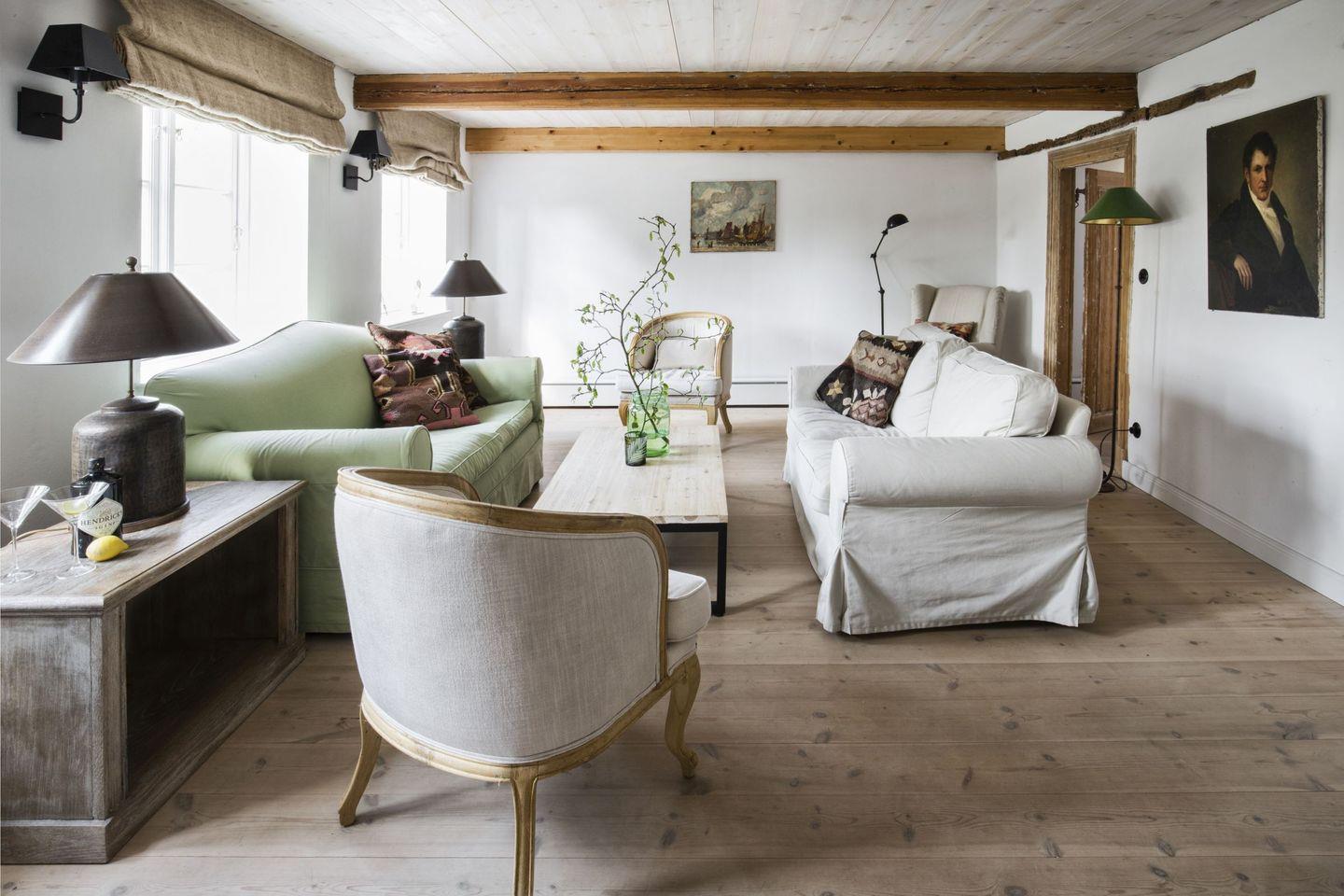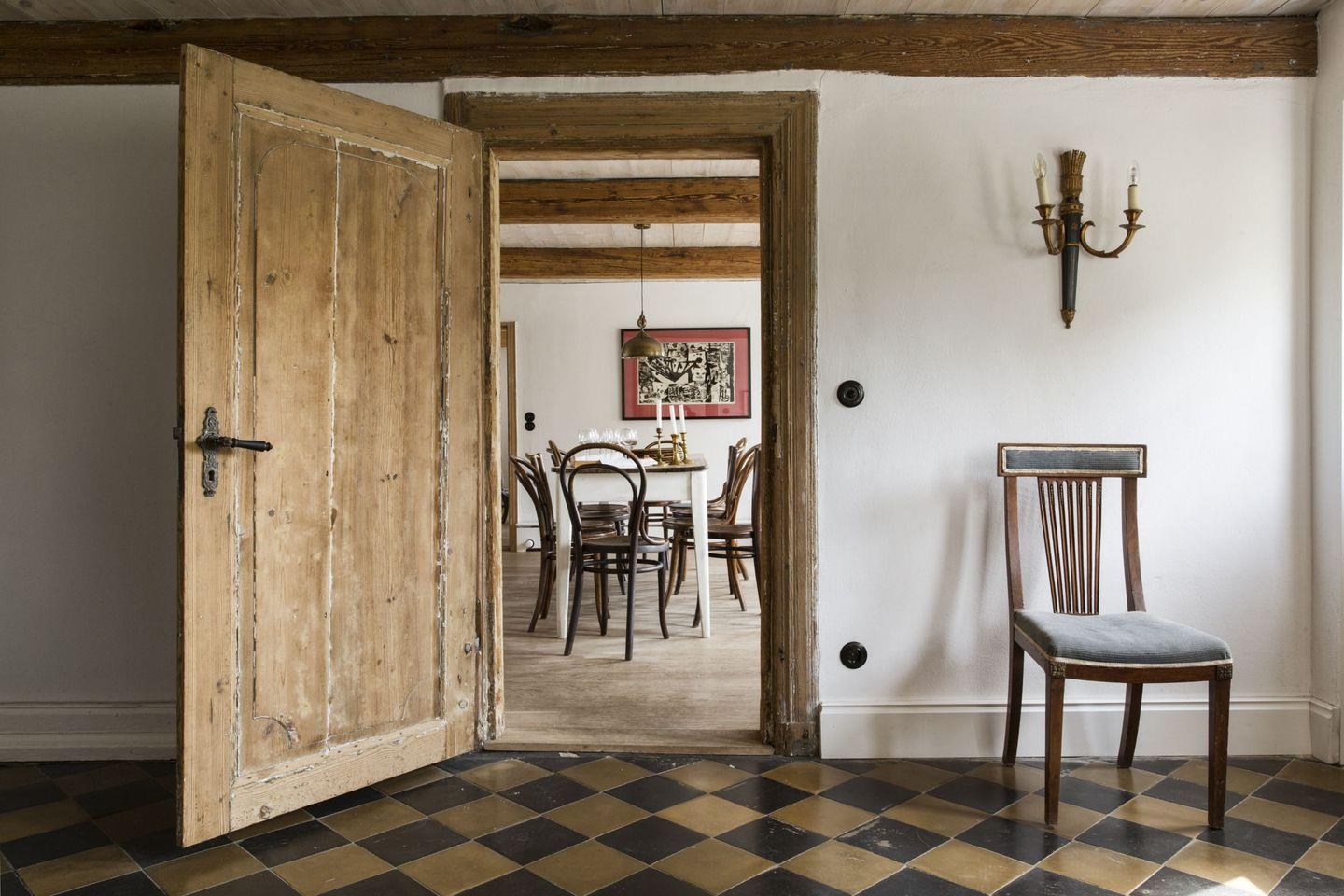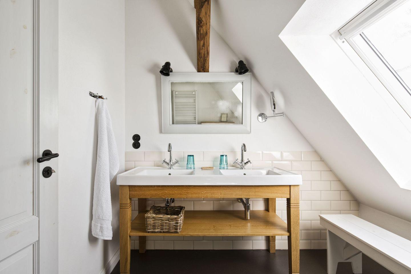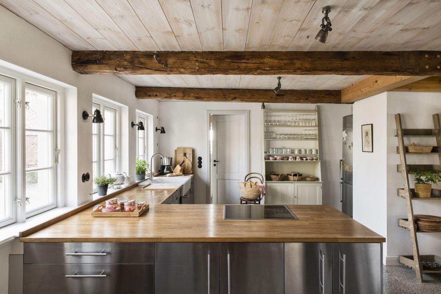 Hier trifft Tradition auf Moderne: Betonböden, Edelstahlfronten und moderne Lampen sind kombiniert mit Türen aus dem 18. Jahrhundert, alten Fliesen und antiken Möbeln. Der perfekte Ort für eine Auszeit an der Ostsee, umgeben von Natur und Geschichte.