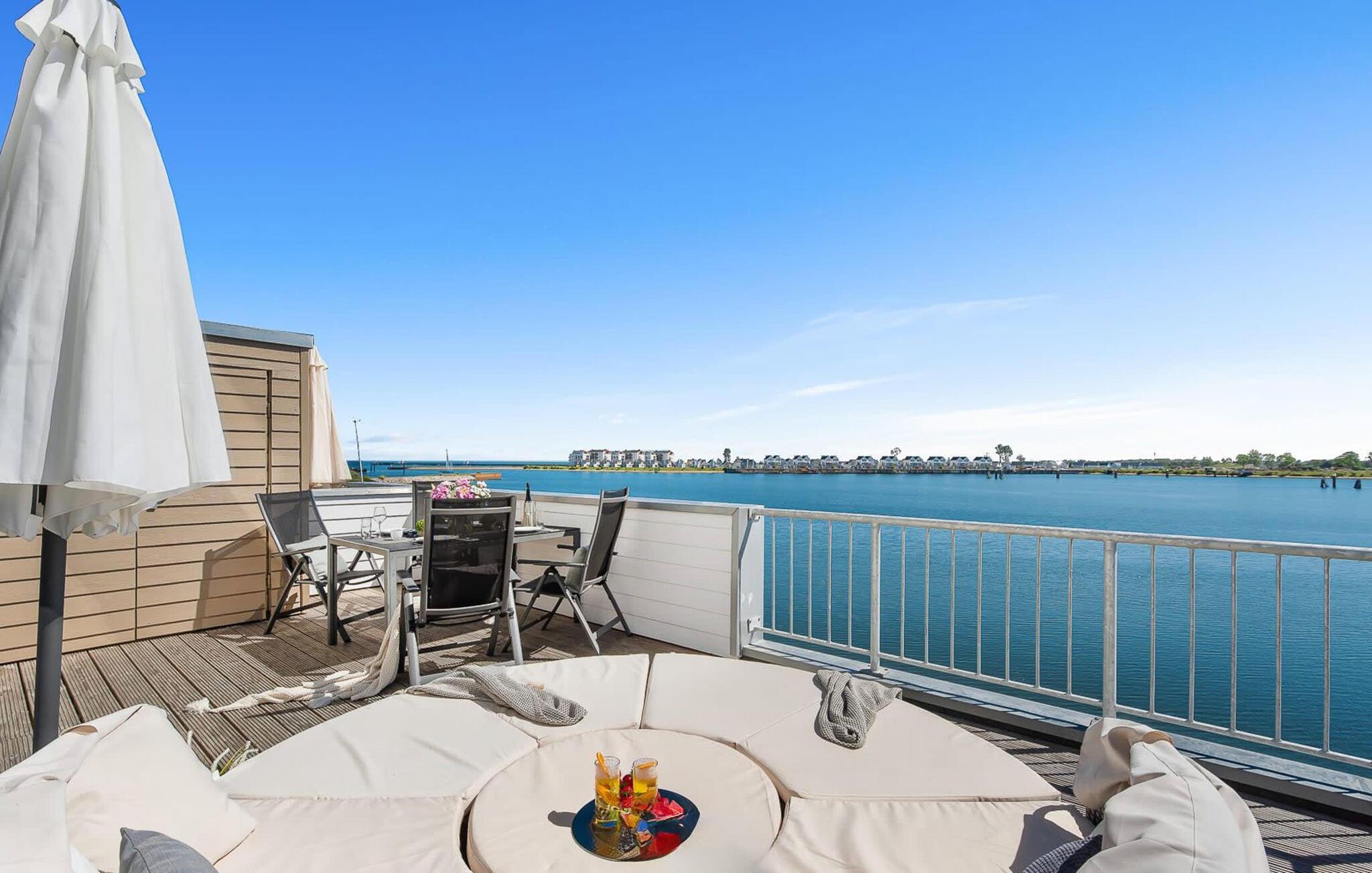 Die voll ausgestattete Wohnküche ist zur Hafenseite hin ausgerichtet und erlaubt einen freien Blick auf das Hafenkino. Vor bodentiefen Fenstern lädt ein massiver Esstisch für sechs Personen zu Urlaubsmahlzeiten ein. Von hier aus gelangt man auf die direkt angrenzende Terrasse mit Süd-Süd-West Ausrichtung. Highlight der großzügigen Terrasse ist die stylische Sonneninsel in Lounge-Optik mit optimalem Windschutz.