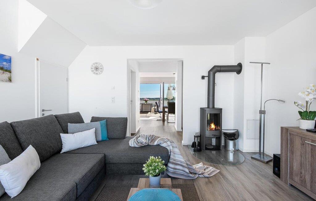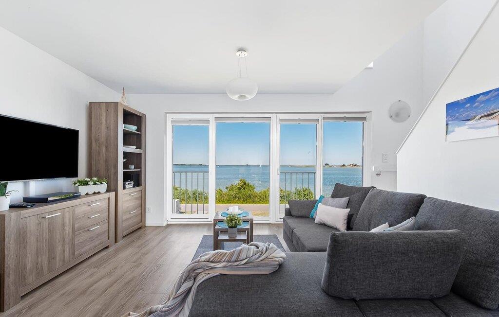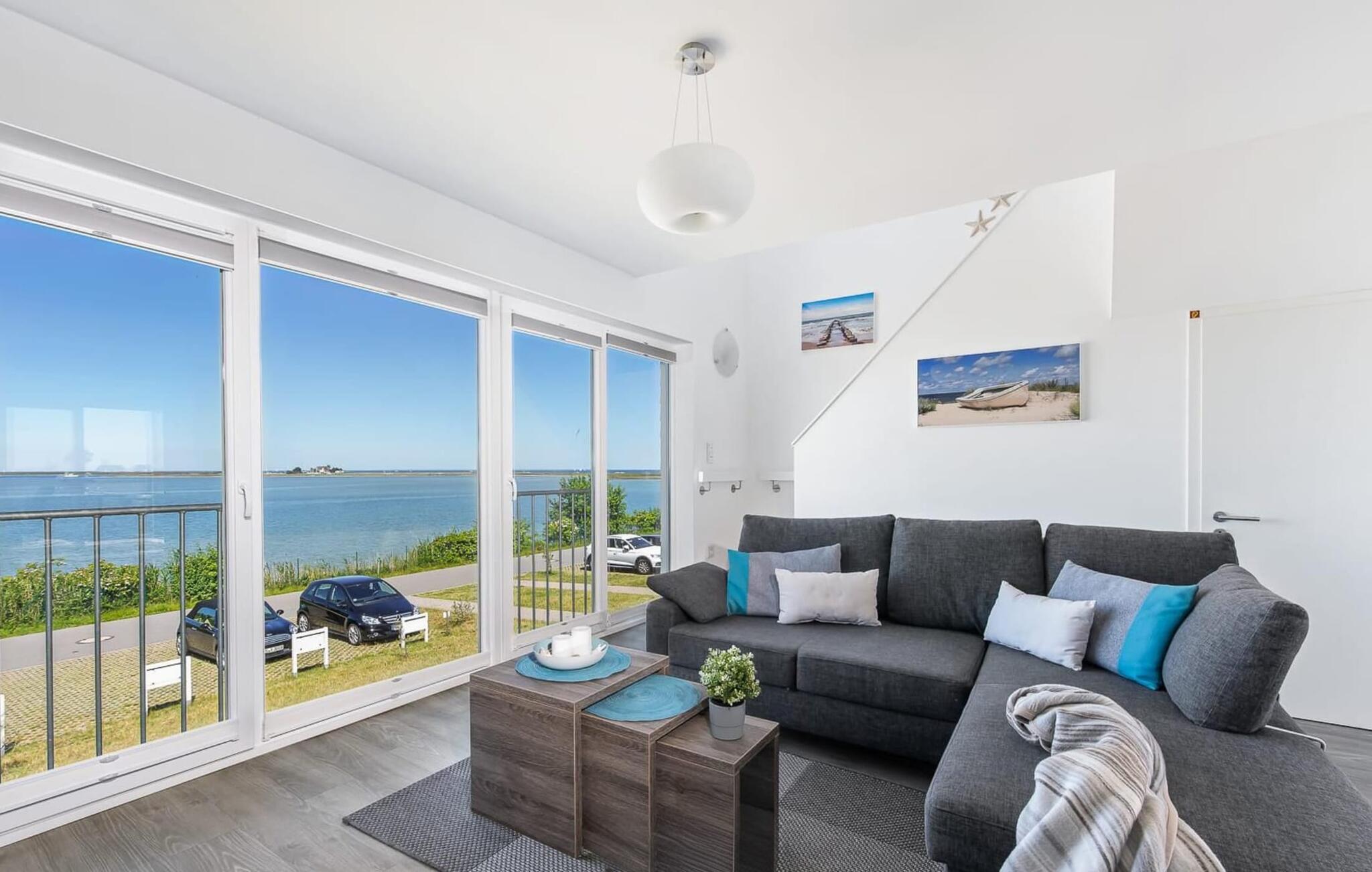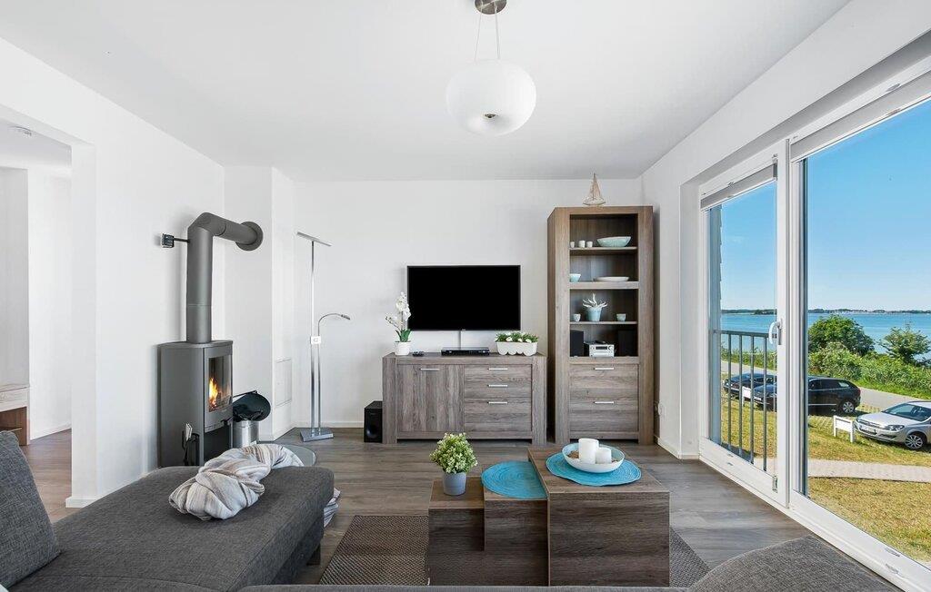 Mit bodentiefen Fenstern hin zur Schlei überzeugt das Wohnzimmer der Ferienwohnung. Auf der gemütlichen Sitzlandschaft beim gemeinsamen Abend vor dem Kaminofen lässt sich der Blick über die Schlei, ihre Mündung in die Ostsee und den Leuchtturm von Schleimünde genießen.