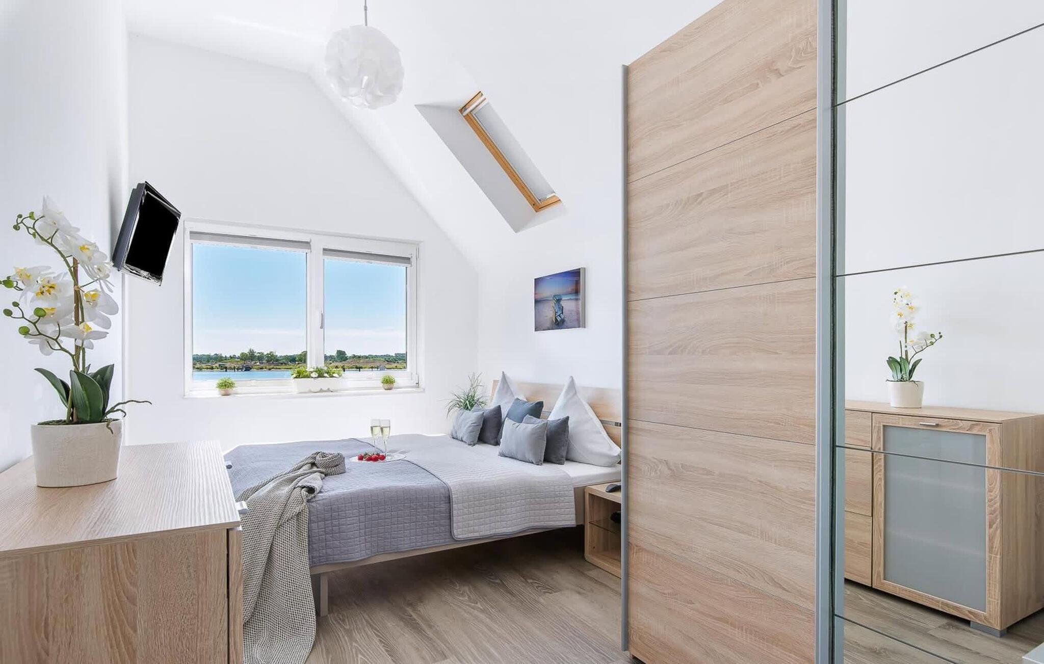 Auf der obersten Wohnebene befindet sich der Schlafbereich. Beide Schlafzimmer bieten mit Wasserblick pure Erholung, während hohe Decken und Schrägen für eine besondere Gemütlichkeit sorgen. Das Hauptschlafzimmer verfügt über einen zusätzlichen TV. Zwei weitere Schlafplätze befinden sich auf der komfortablen Schlafcouch im Wohnbereich. Wellness bei Schleiblick bietet das voll ausgestattete Badezimmer auf der oberen Ebene mit Sauna (Infrarotkabine) und Whirlpool-Badewanne. Für zusätzlichen Komfort sorgt ein Duschbad auf der ersten Wohnungsebene.