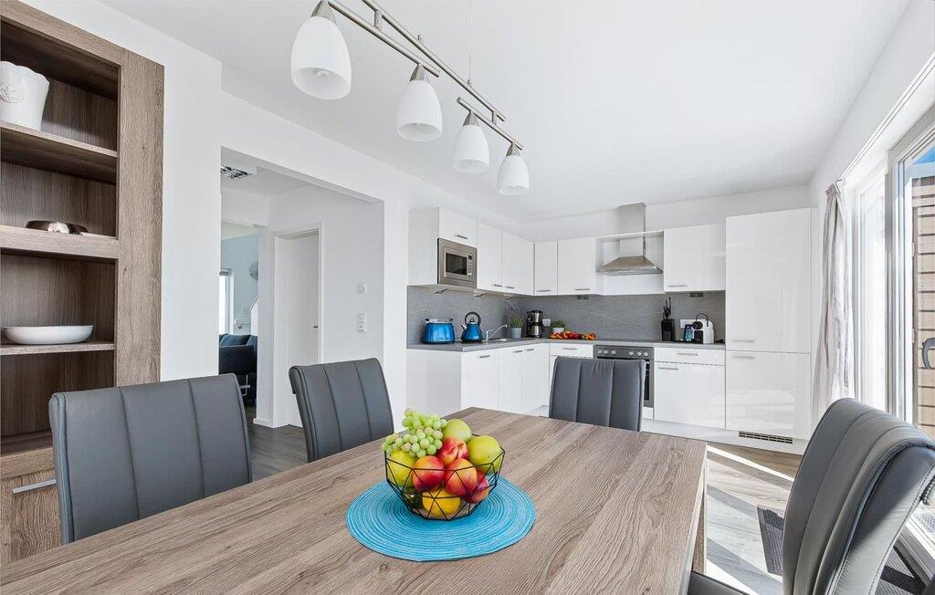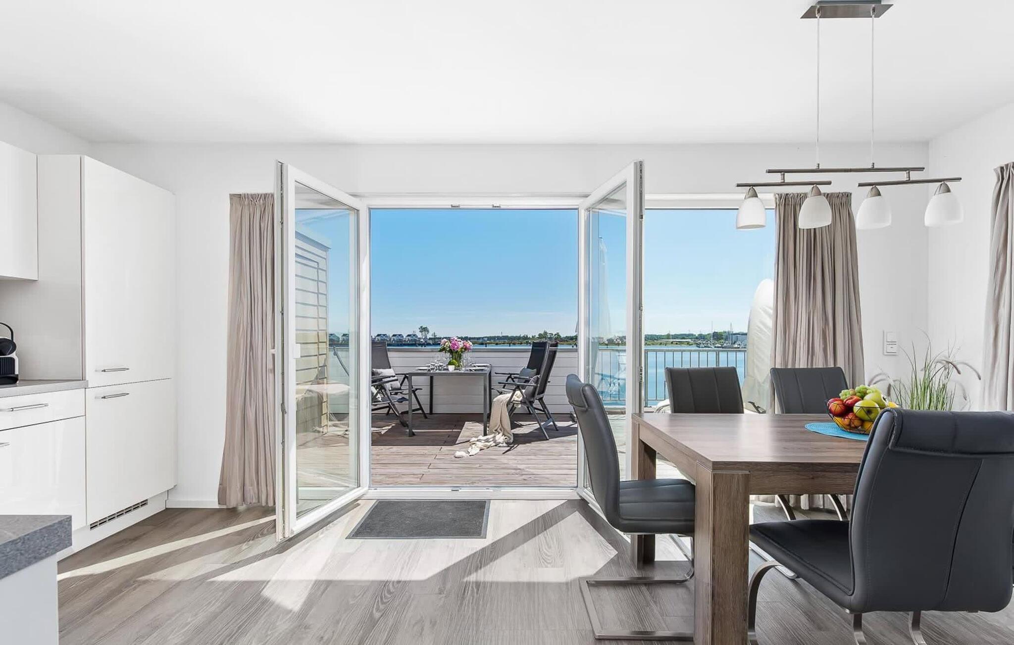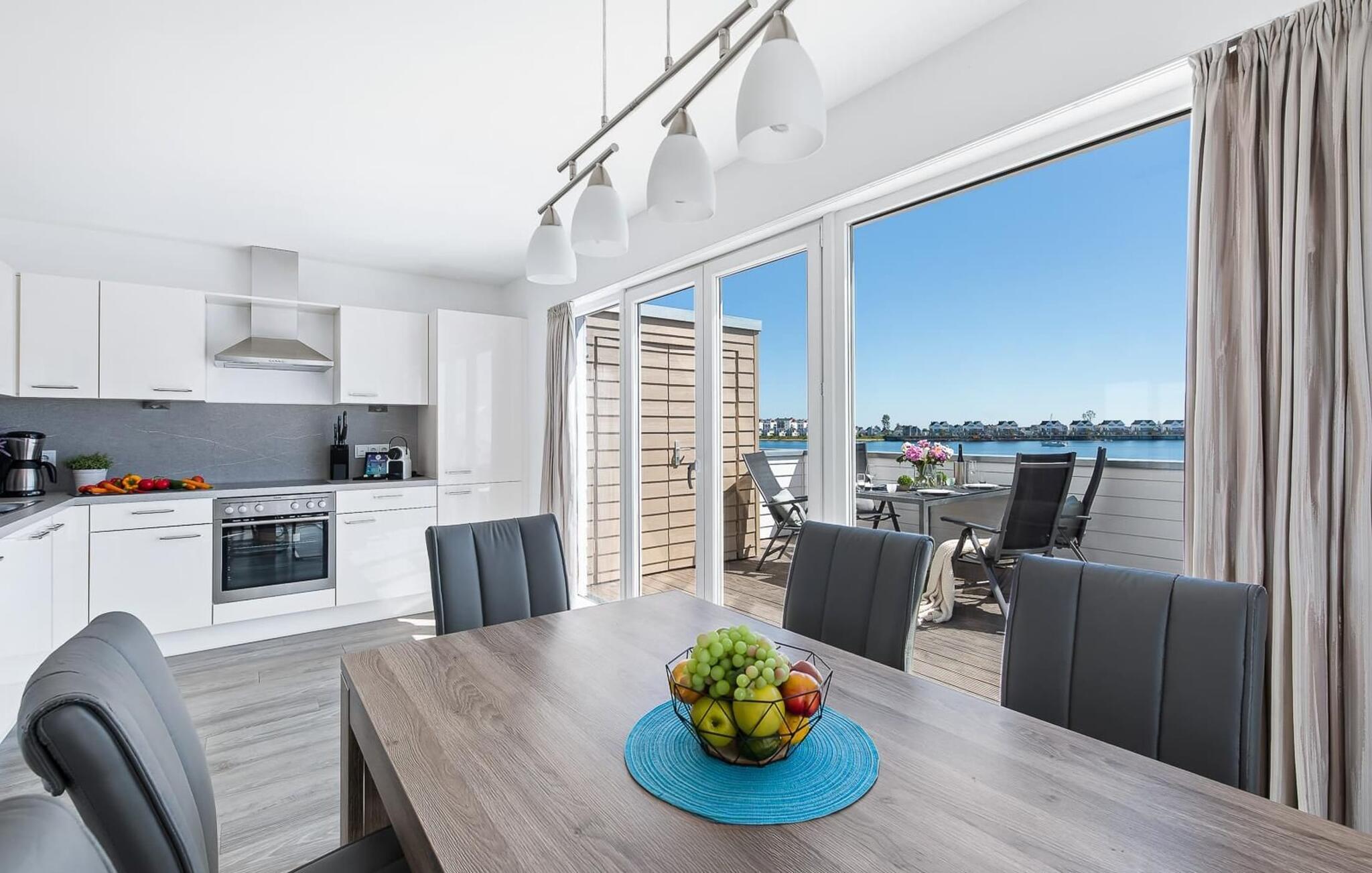 Die voll ausgestattete Wohnküche ist zur Hafenseite hin ausgerichtet und erlaubt einen freien Blick auf das Hafenkino. Vor bodentiefen Fenstern lädt ein massiver Esstisch für sechs Personen zu Urlaubsmahlzeiten ein. Von hier aus gelangt man auf die direkt angrenzende Terrasse mit Süd-Süd-West Ausrichtung.