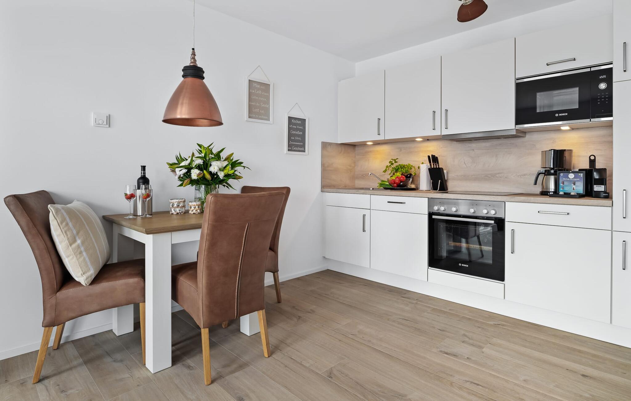 Während ihr im kombinierten, offenen Küchen-Wohn-Essraum kocht, esst, Zeitung lest oder es sich einfach nur gutgehen lasst, begleitet euch unentwegt der Blick über das weite Wasser. Ihr schaut durch die bodentiefen Fenster über den Balkon auf den Segel-Sportboothafen, die schwimmenden Häuser, den Ostseefjord Schlei bis hin zum Leuchtturm von Schleimünde. Ein phänomenaler Ausblick, der ständig in Bewegung ist. Diese besondere Atmosphäre lädt zu einem gemütlichen Grillabend auf dem Balkon ein.