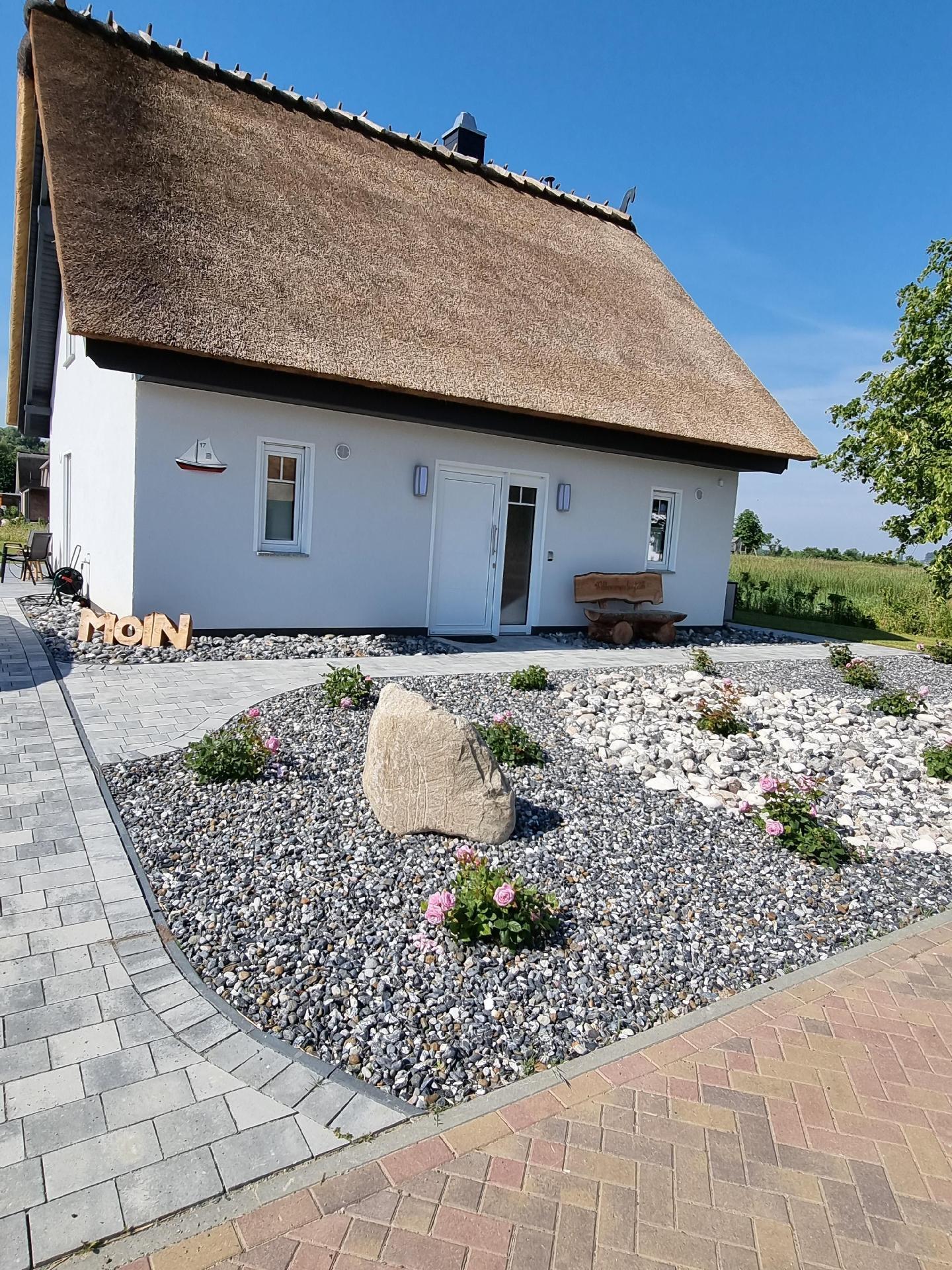 Modernes Ferienhaus unter Reet in ruhiger Natur mit Sauna, großem Garten und Terrasse nahe dem Naturschutzgebiet Üselitzer Wiek.