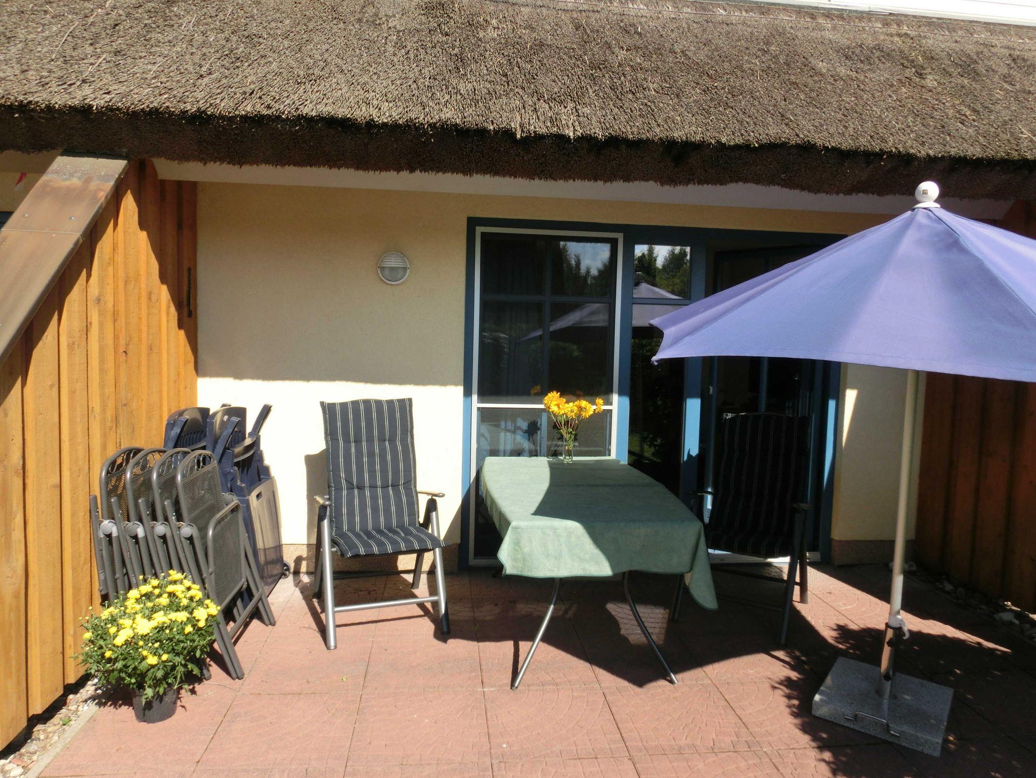Gemütliches Reetdachhaus Malve 3 im Feriendorf Puddeminer Wiek auf Rügen mit Terrasse und Kaminofen.