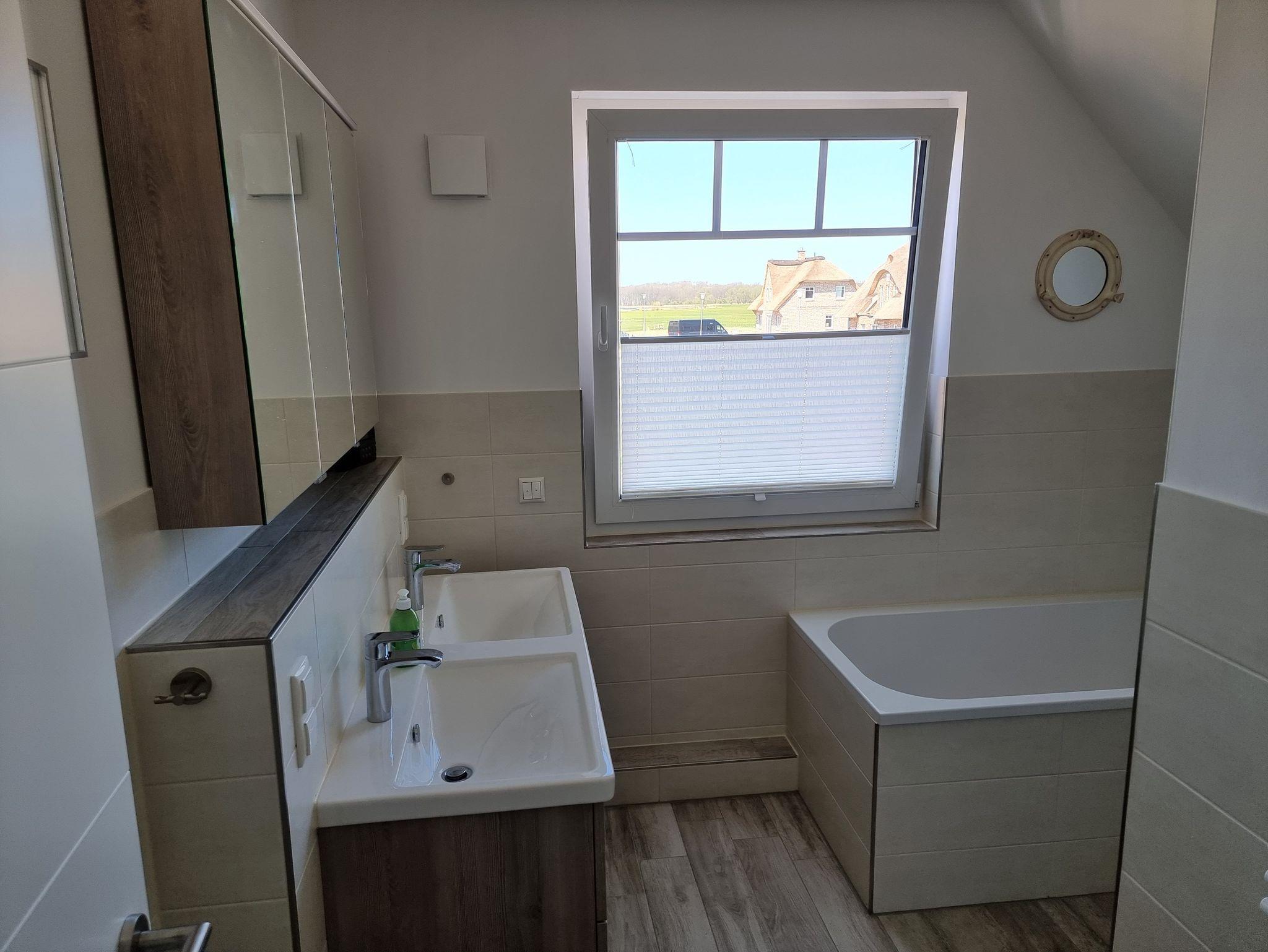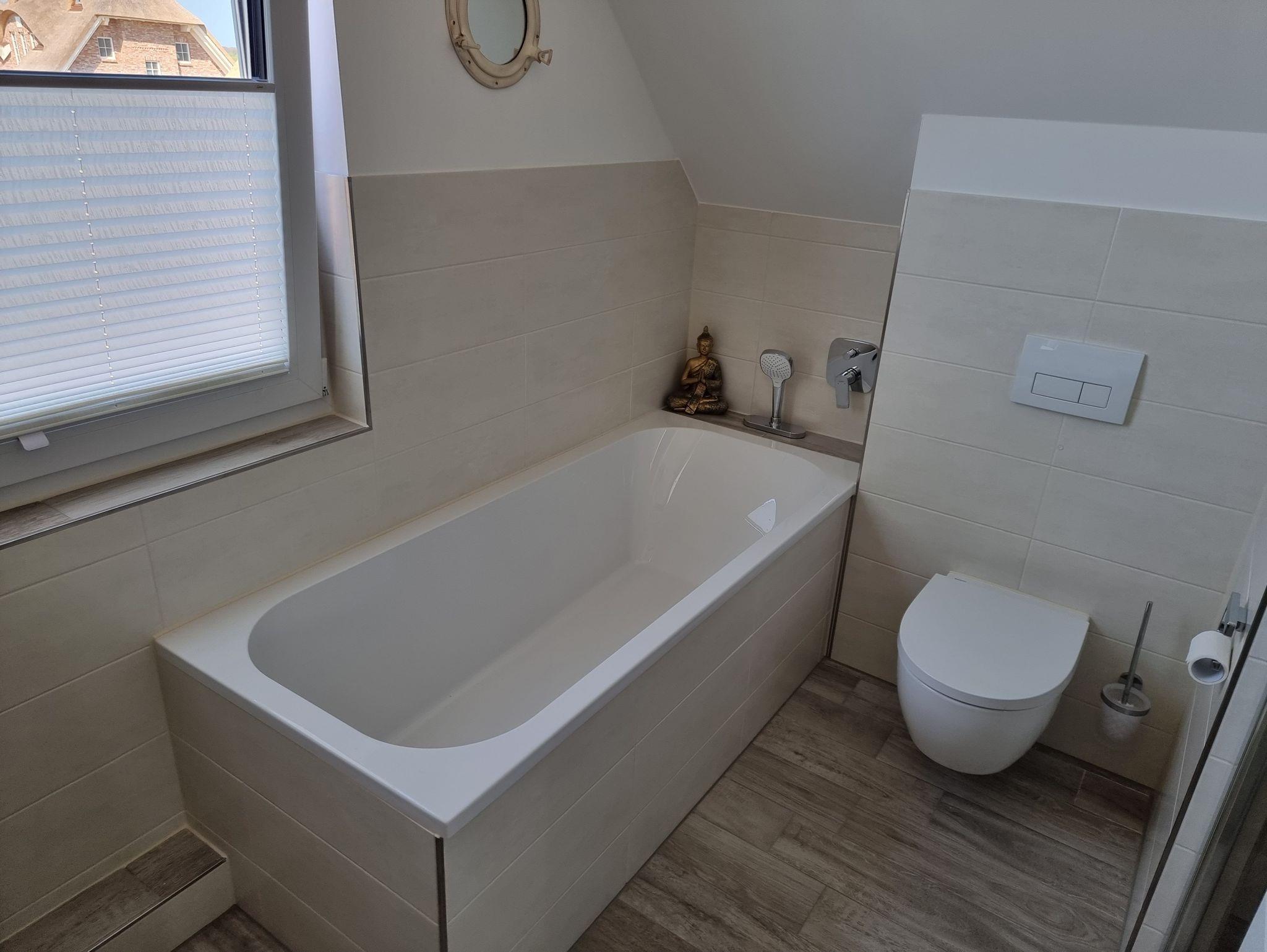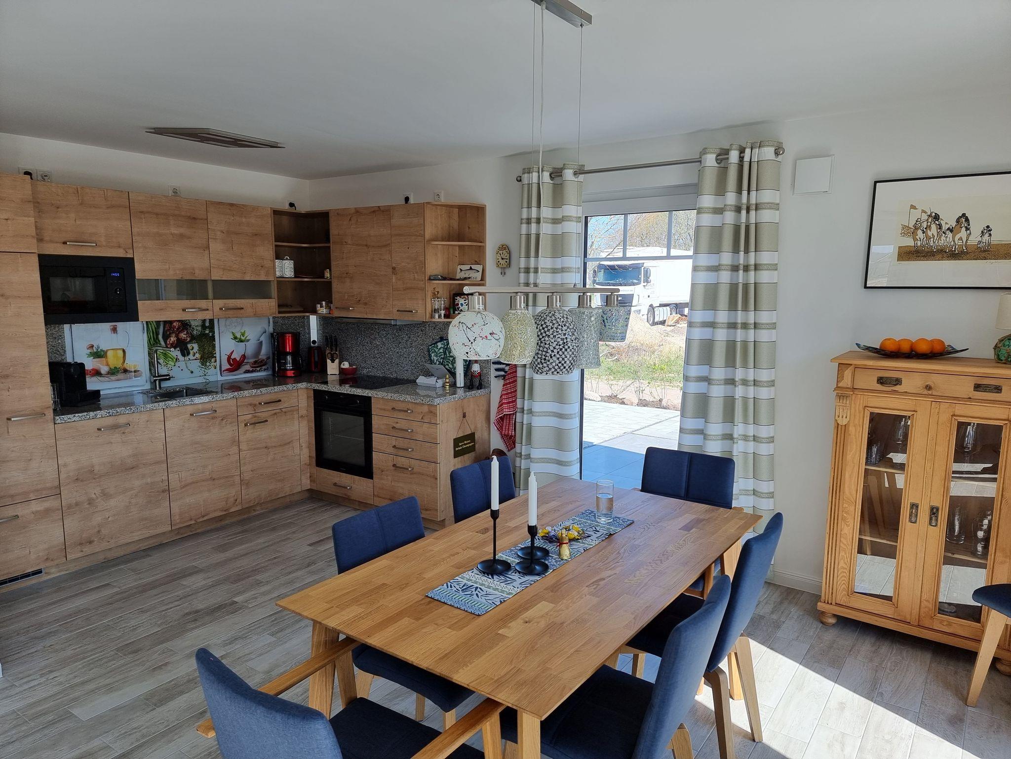 Neu erbautes Komfortferienhaus unter Reet mit großem Wohn-Essbereich, integrierter Küche, Kaminofen, 3 Schlafzimmern für insgesamt 6 Personen, 2 Bädern, jeweils mit bodengleicher Dusche, großem Grundstück (ca. 1000 m²) großer Terrasse, Gasgrill, Gartenhaus mit Sauna, Strandkorb.