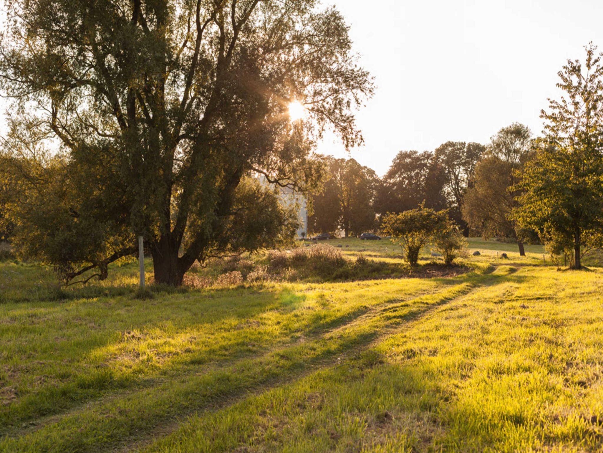 Die Grundmauern der alten Scheunenflächen des ehemaligen landwirtschaftlichen Guts sind wieder sichtbar gemacht worden. Der Ausblick von Haus und Park ist zu allen Seiten geprägt durch die Lage direkt am Wasser.