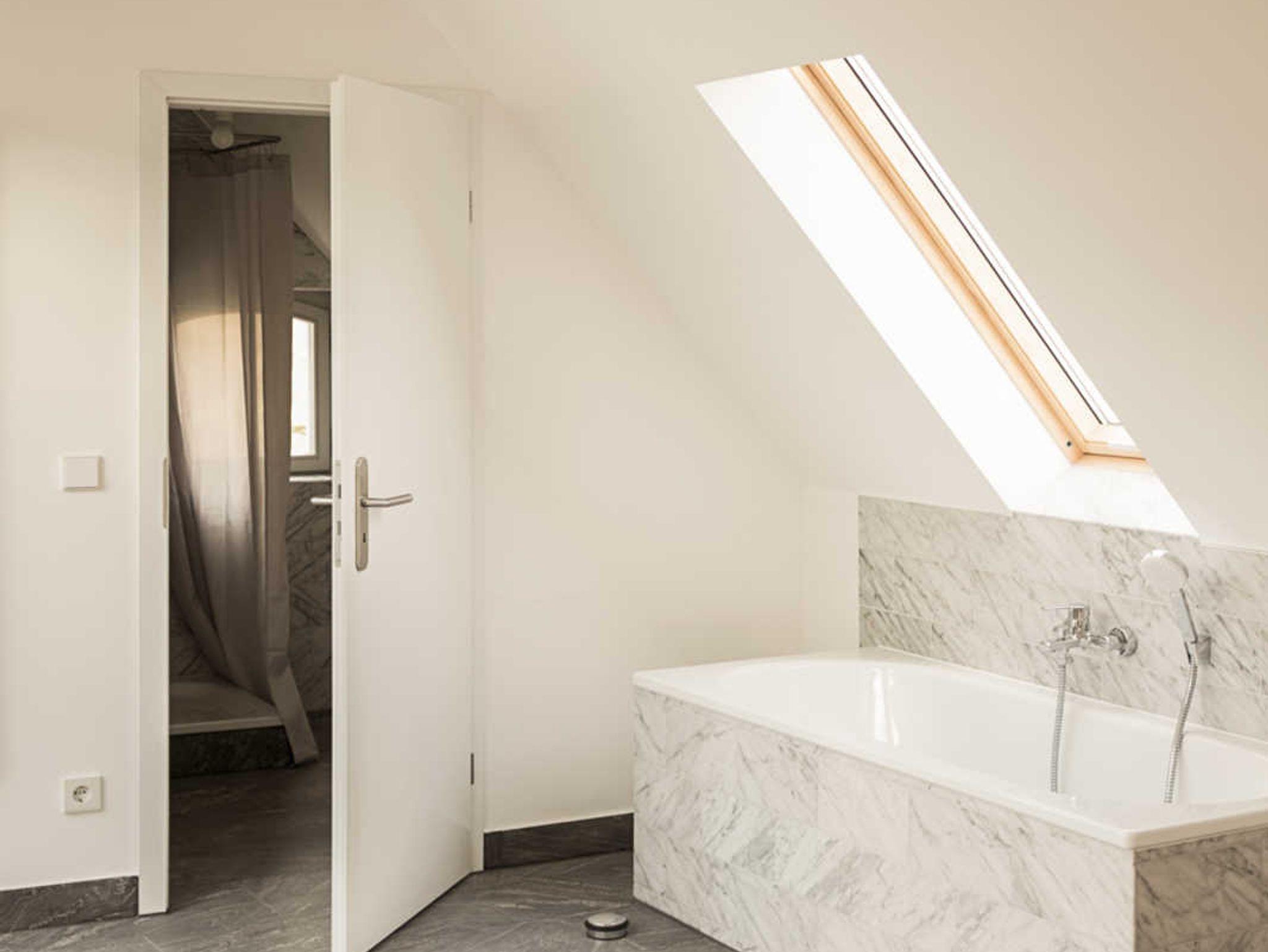 • offener Grundriss mit Schlafbereich, Wohnbereich, Küche und freistehender Badewanne