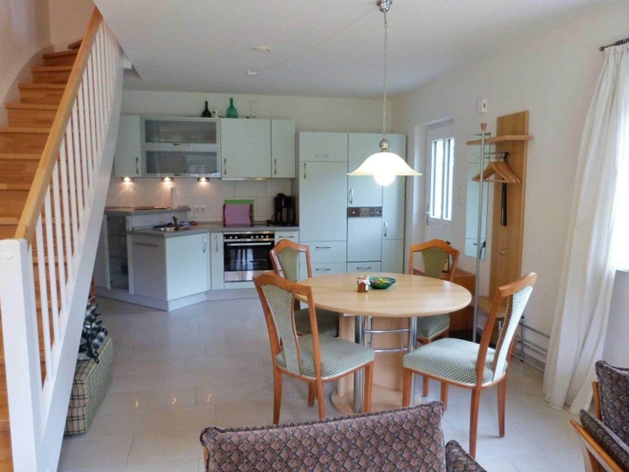Die Ferienwohnung ist ca. 60 qm groß, hat Platz für maximal 4 Erwachsene und wurde modern und hochwertig mit Internetzugang eingerichtet. Im Wohnzimmer befinden sich eine bequeme Sitzcouch mit Tisch und Sesseln und ein Flachbild - TV - Gerät. Hier steht auch ein großer Esstisch mit Stühlen. Die moderne Küchenzeile ist mit einem Herd, Backofen, Spülmaschine, Wasserkocher, Kaffeemaschine, Toaster und Kühlschrank komplett ausgestattet. Über eine Holztreppe gelangt man in den 1. Stock zu den beiden Schlafzimmern und dem Bad. Im ersten Schlafzimmer steht ein bequemes französisches Bett 140cm x 200cm mit Nachttischen und Leselampen. Das zweite Schafzimmer verfügt über ein Etagenbett.
