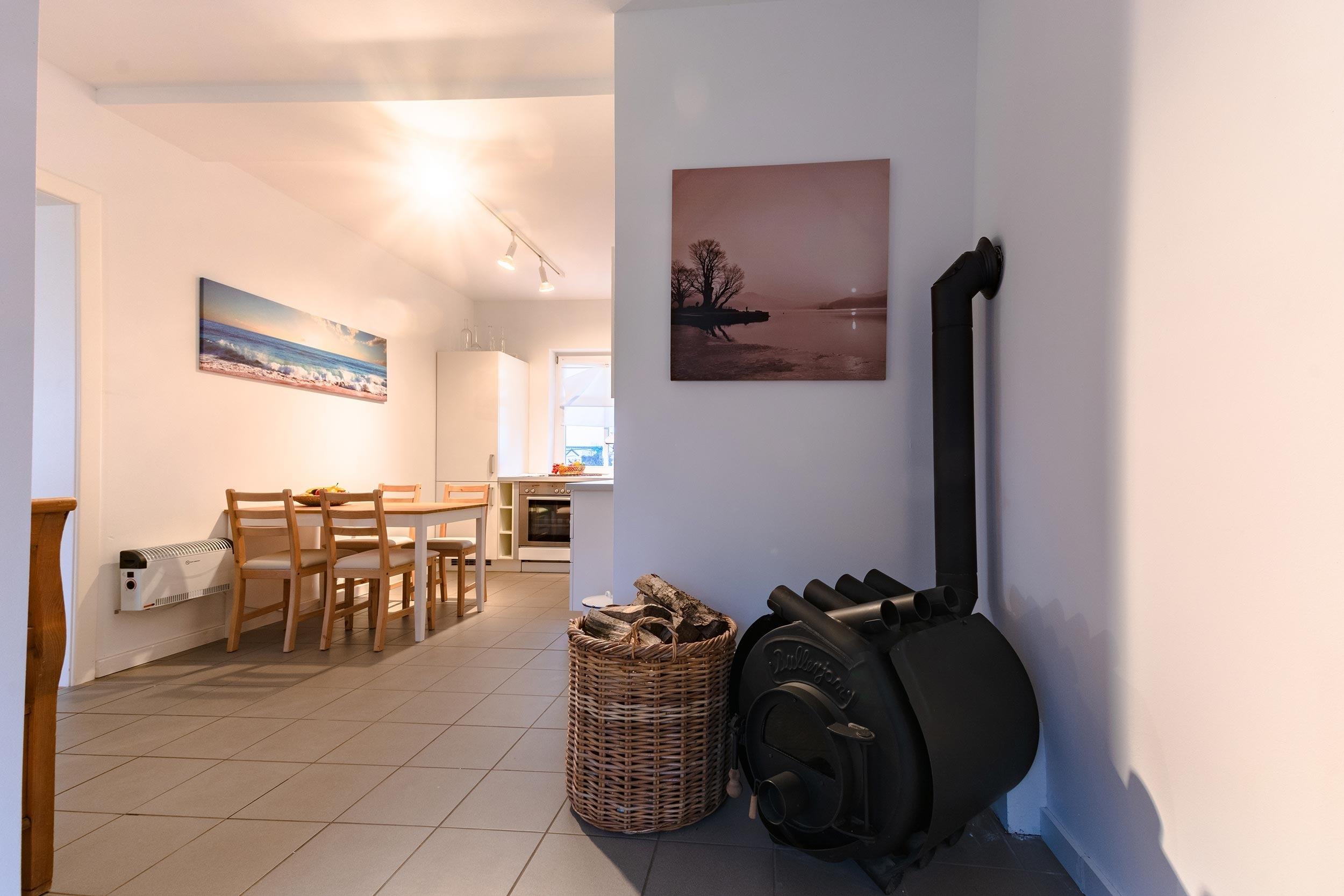Im Loft-ähnlichen Wohnbereich ist der Schlafplatz, optisch getrennt durch eine halbhohe Mauer, direkt vor dem Kaminofen. Hier gibt es ein klassisches Doppelbett und einen großen Schrank. Die geräumige, offene Küche ist komplett ausgestattet. An dem gemütlichen Esstisch können vier Personen bequem sitzen.