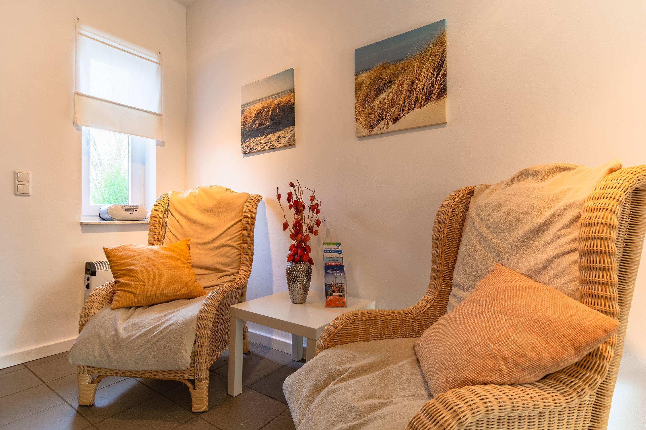 Das Wohnzimmer lädt mit einem Fernseher, einer großen Couch, die man schnell zum Bett für eine weitere Person umbauen kann, zum Entspannen ein. In der Leseecke können Sie in zwei urgemütlichen Ohrensesseln die Zeit vergessen. Im separaten Schlafzimmer finden Sie ein Doppelbett, einen Schrank und einen zusätzlichen kleinen Fernseher.