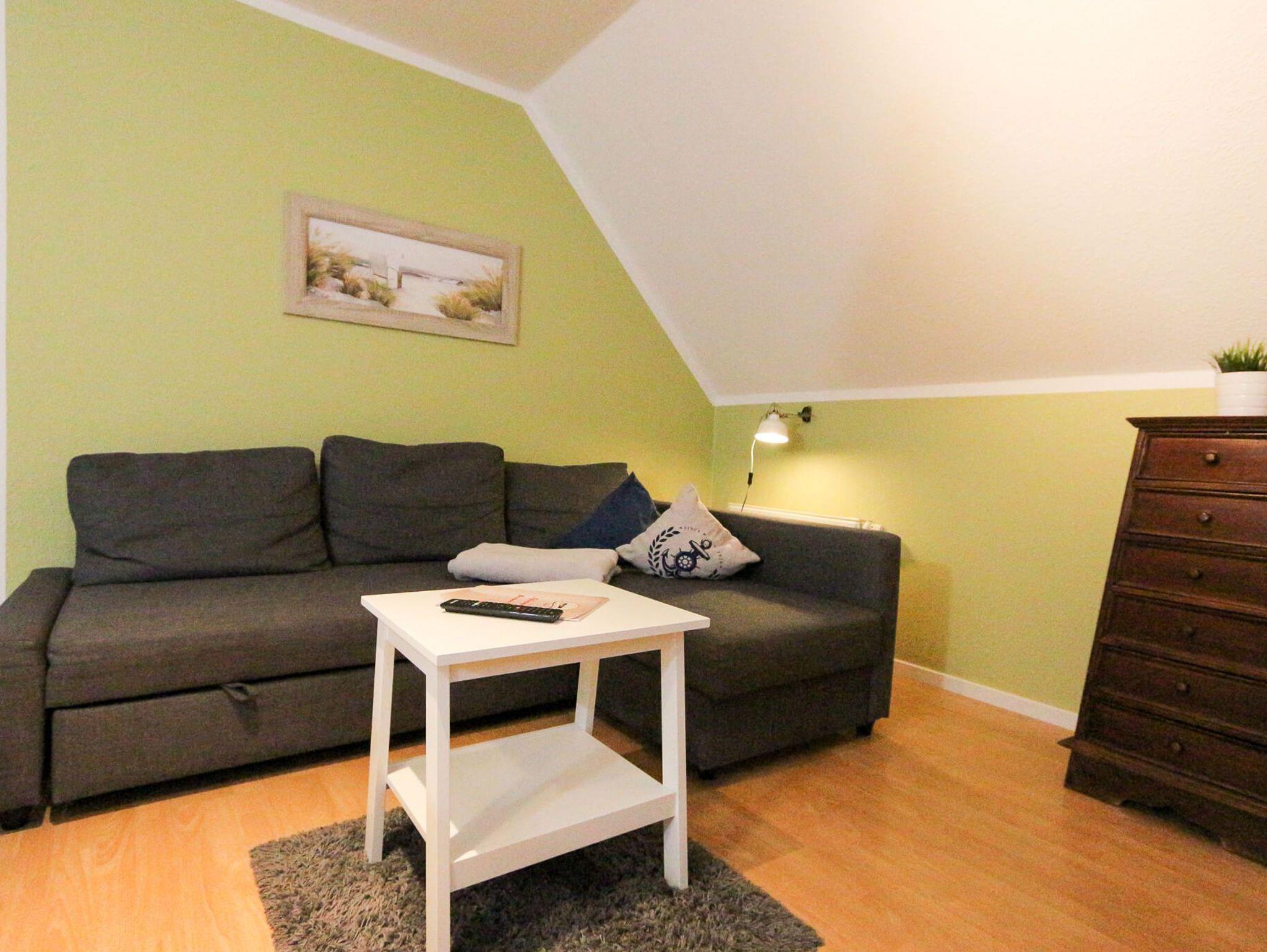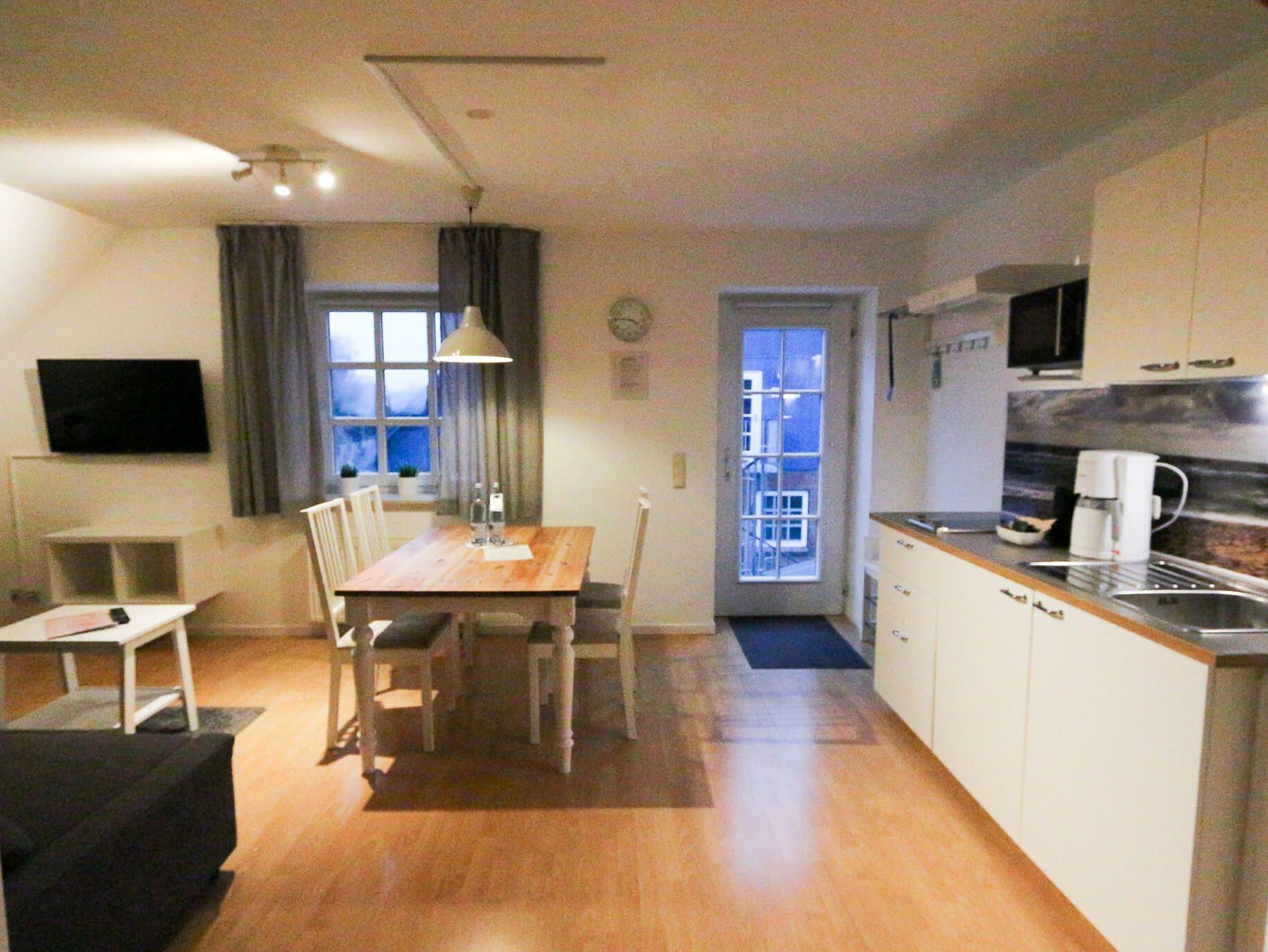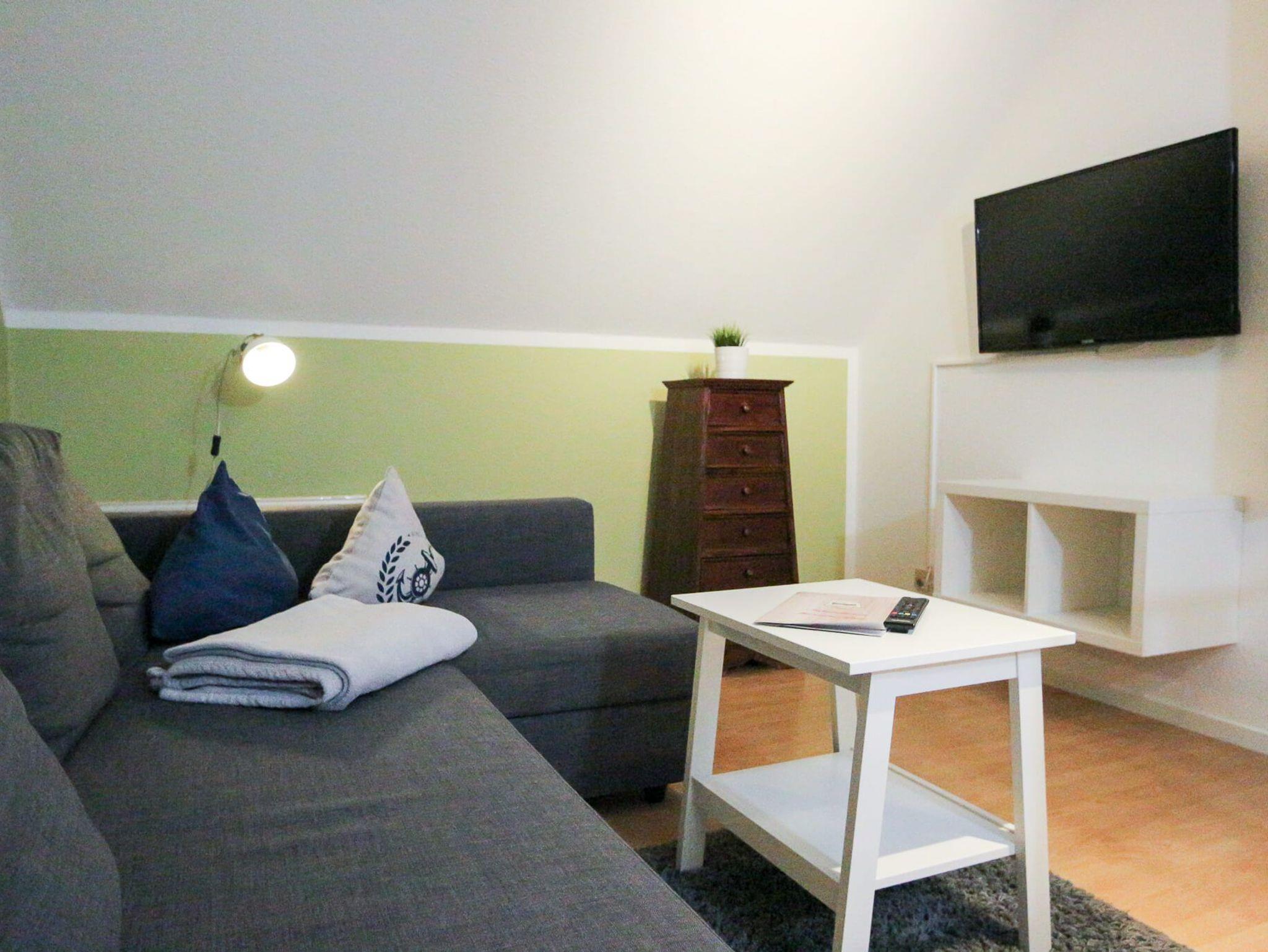 Das Maisonette-Apartment Ankerpunkt im Haus 3 der Ferienanlage Captain Pahlen in Zingst bietet auf zwei Ebenen eine gelungene Kombination aus maritimem Wohngefühl und modernem Komfort. Der offene Wohnbereich im unteren Geschoss ist hell und freundlich gestaltet und verfügt über eine gemütliche Sofaecke, einen Esstisch sowie eine funktional integrierte Küchenzeile. Diese ist mit 2-Platten-Ceranfeld, Kühlschrank mit Gefrierfach, Mikrowelle mit Grillfunktion, Wasserkocher, Toaster und Kaffeemaschine ausgestattet und ermöglicht eine komfortable Selbstversorgung während des Aufenthalts.