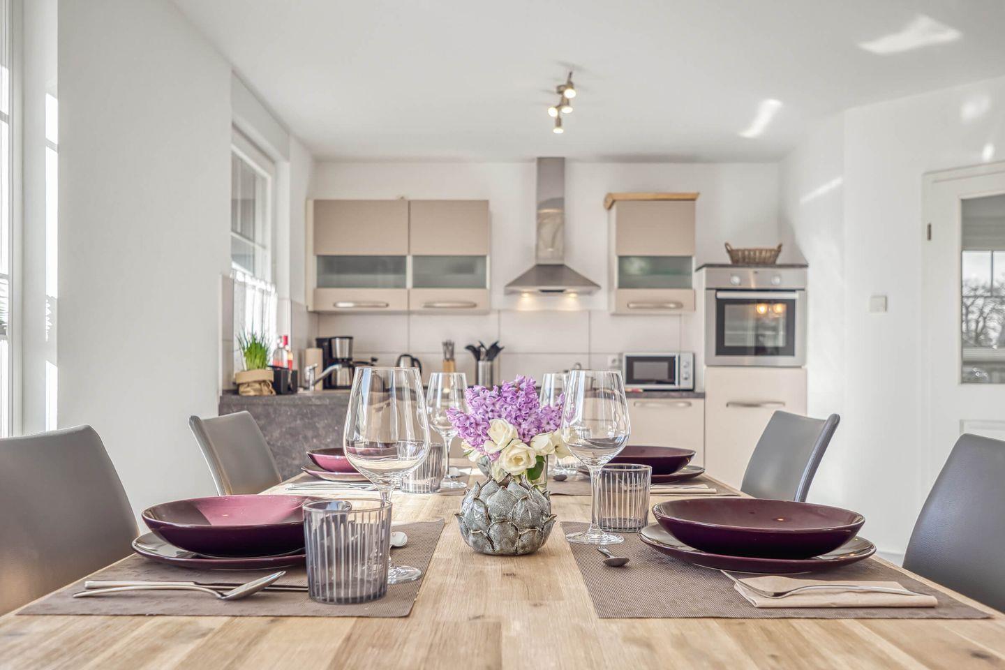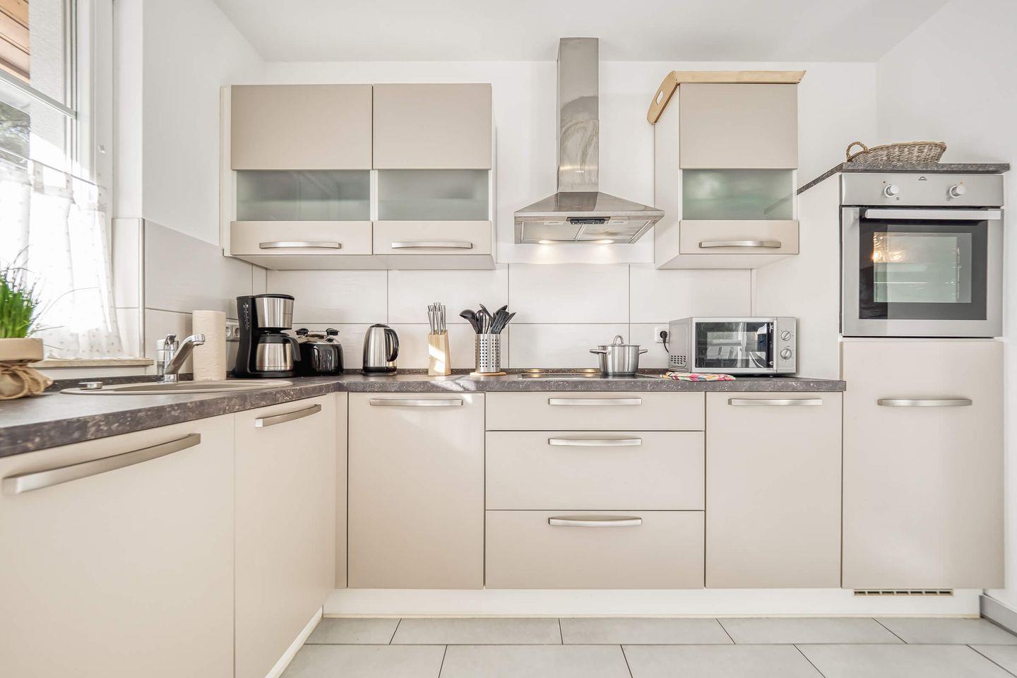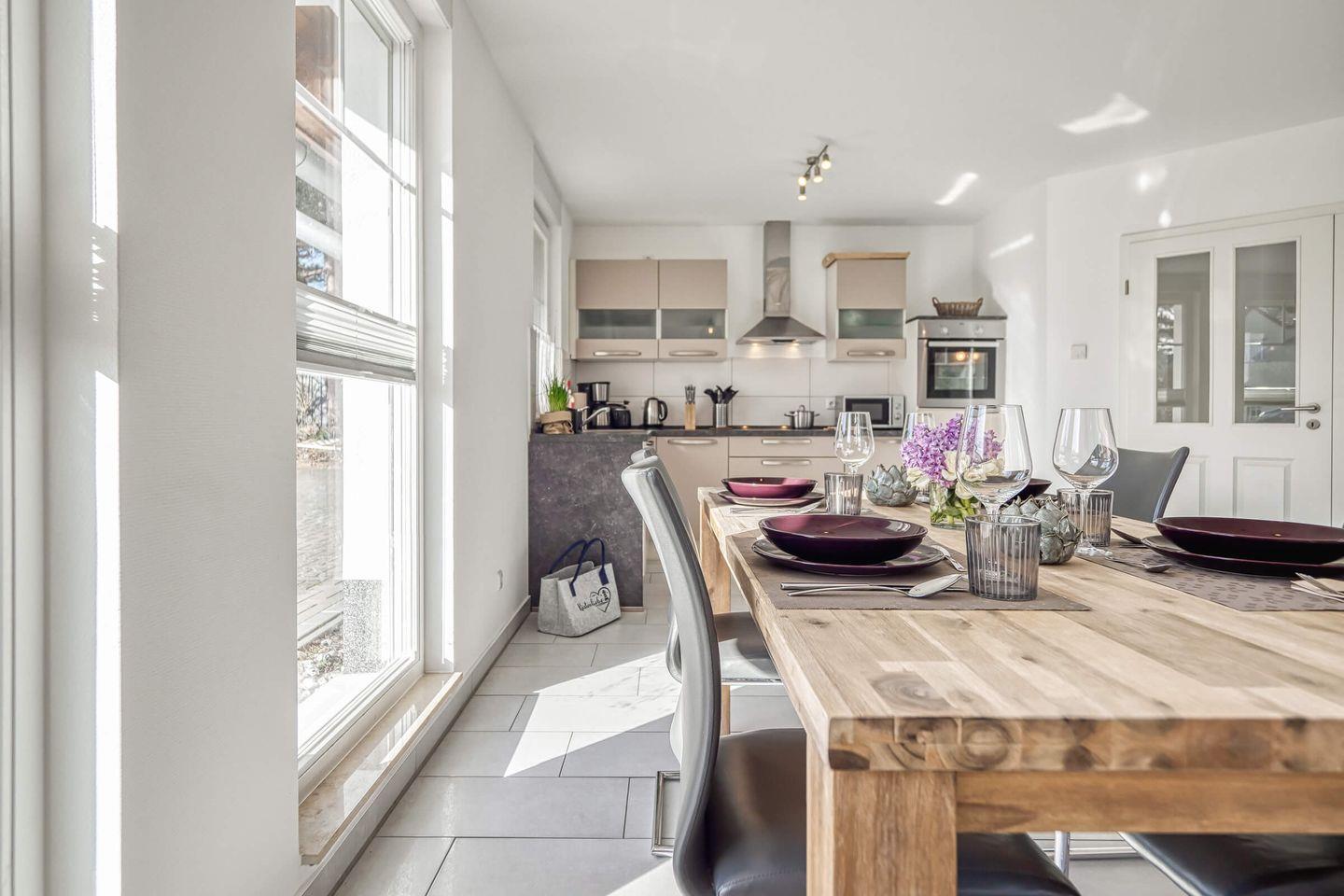 Die Ferienwohnung ist optimal für Paare oder kleine Familien und verfügt über ein geräumiges Wohnzimmer mit Essbereich und voll ausgestatteter Einbauküche inklusive Geschirrspüler, Elektroherd und SAT-TV.