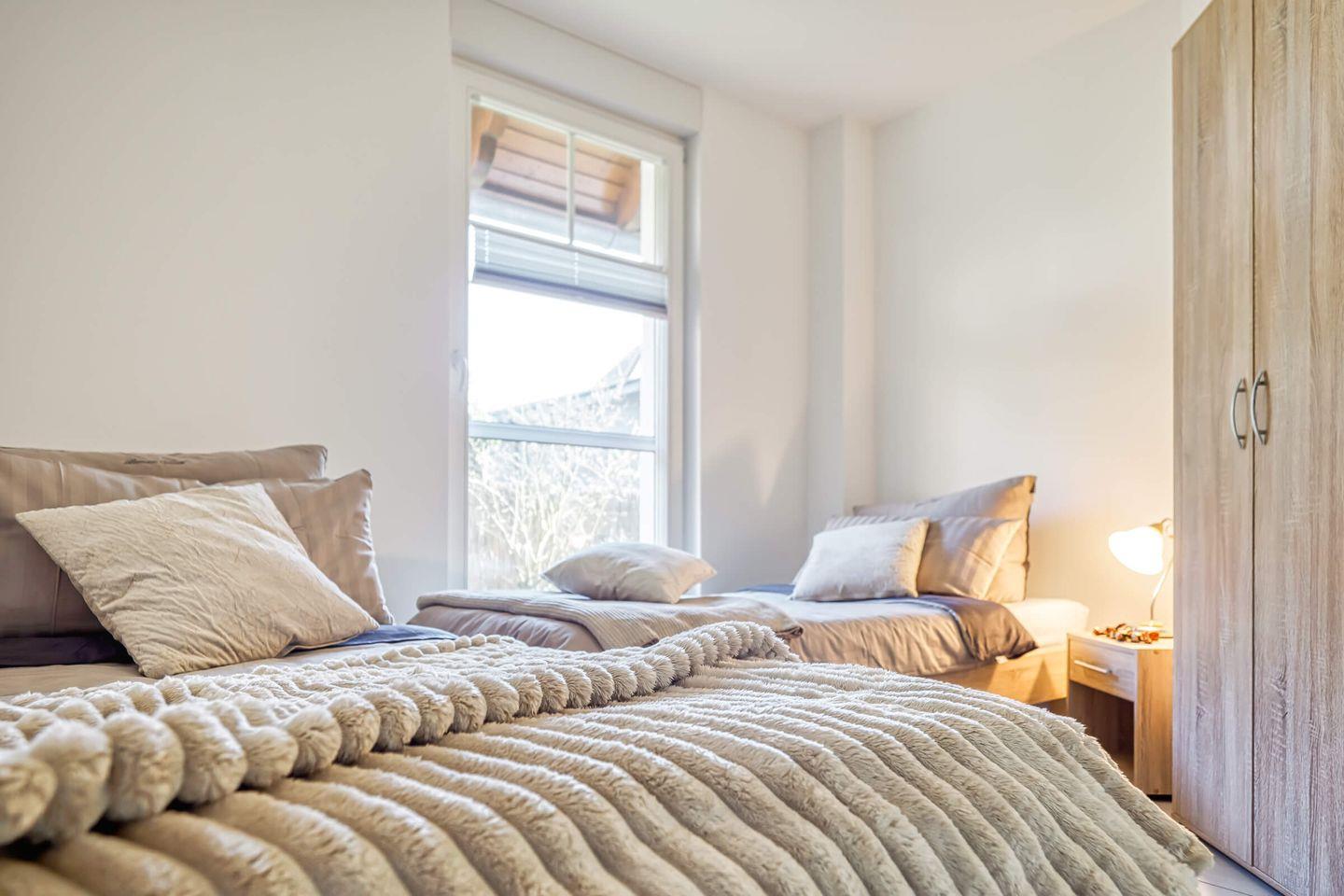 Zwei Schlafzimmer – eines mit Doppelbett, das andere mit zwei Einzelbetten – bieten ausreichend Platz und Stauraum.