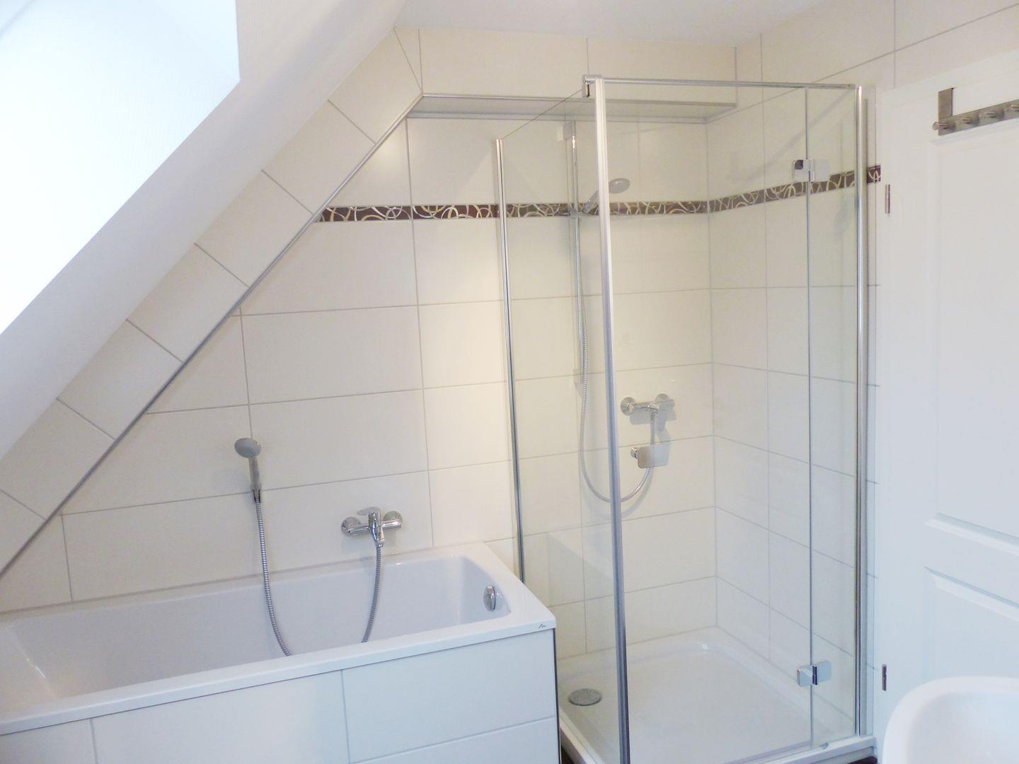 Im Badezimmer stehen eine Dusche, eine Badewanne, ein WC und zwei Waschbecken zur Verfügung.