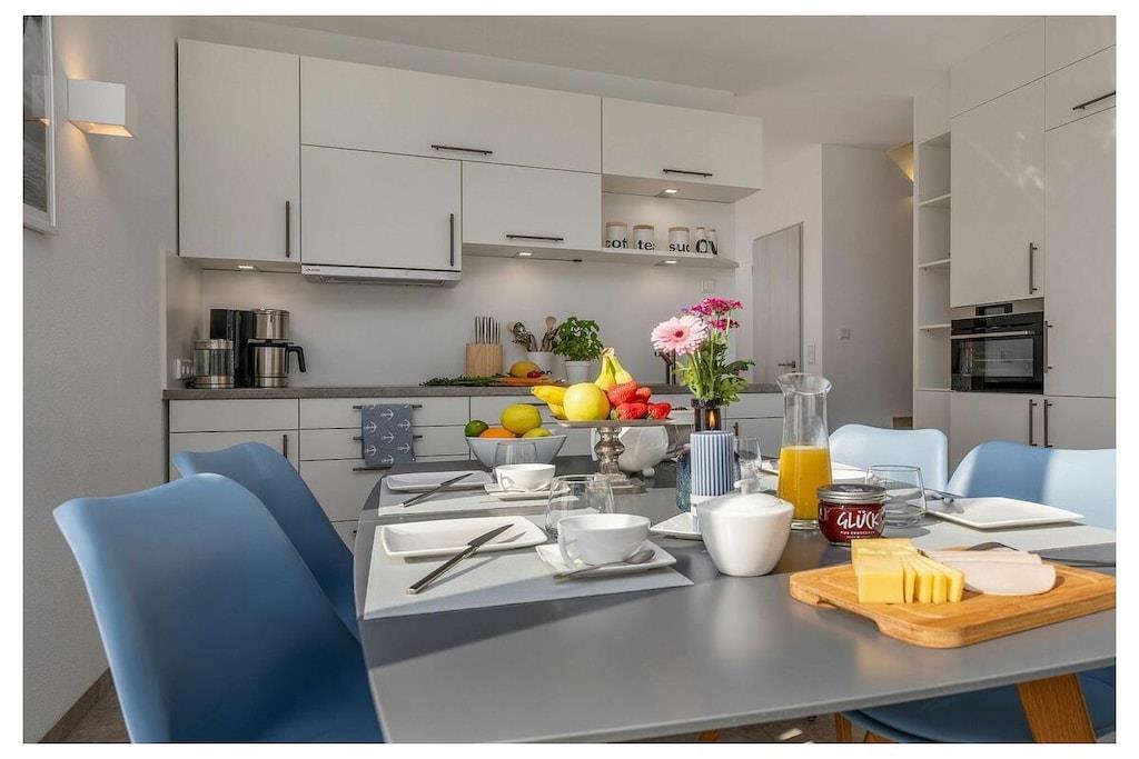 , Wohnzimmer(, TV, Radio), Küche(Wasserkocher, Toaster, Kaffeemaschine, Spülmaschine), Schlafzimmer(Einzelbett, Einzelbett, Doppelbett, Kinderbett), Schlafzimmer(Einzelbett, Einzelbett, Doppelbett, Kinderbett), Badezimmer(Dusche, Föhn), Internet, Terrasse, Parkplatz