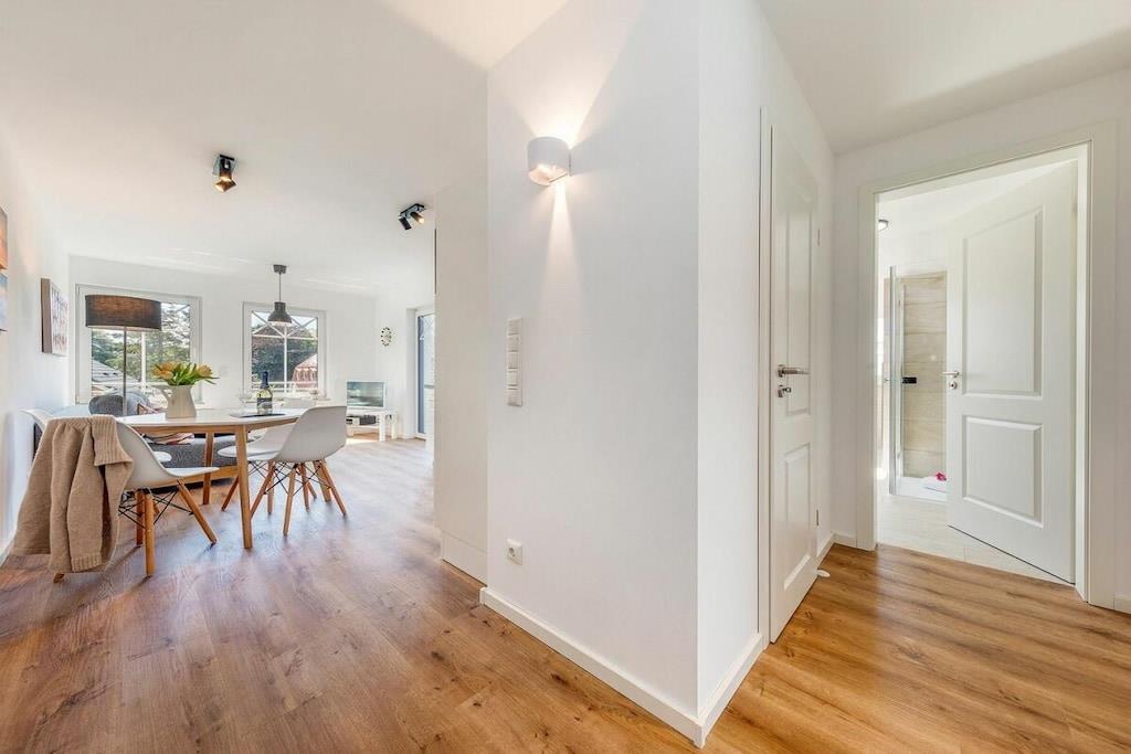 Das Appartement Wellenspiel ist ein Neubau der im Mai 2020 fertig gestellt wurde. In der Ferienwohnung erwartet Sie eine moderne, offene Küche, sowie ein gemütlicher Wohnbereich mit Sofa und Flatscreen-TV. Das Schlafsofa bietet zwei weiteren Gästen eine Übernachtungsmöglichkeit (160x200m) und im Schlafzimmer ein modernes Boxspringbett (180 x 200cm). Angrenzend befindet sich ein begehbarer Kleiderschrank, ein modernes Bad mit ebenerdige Dusche, WC und Waschmaschine. Schuppen mit Lademöglichkeit für E-Bikes Wundervoller Neubau in einer ruhigen Einbahnstraße von Prerow.