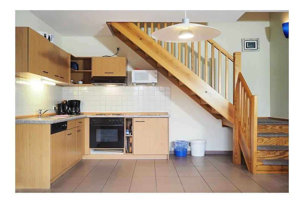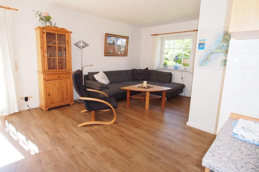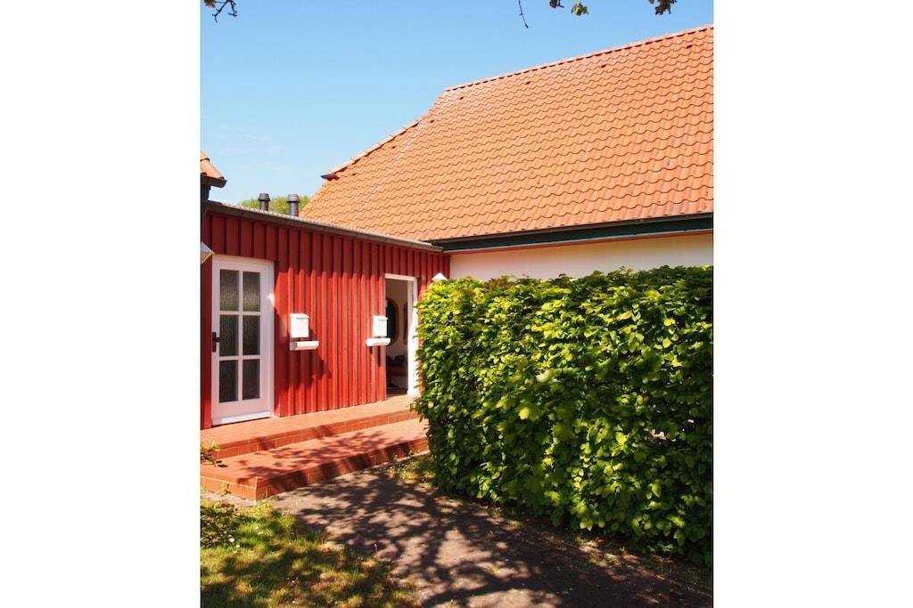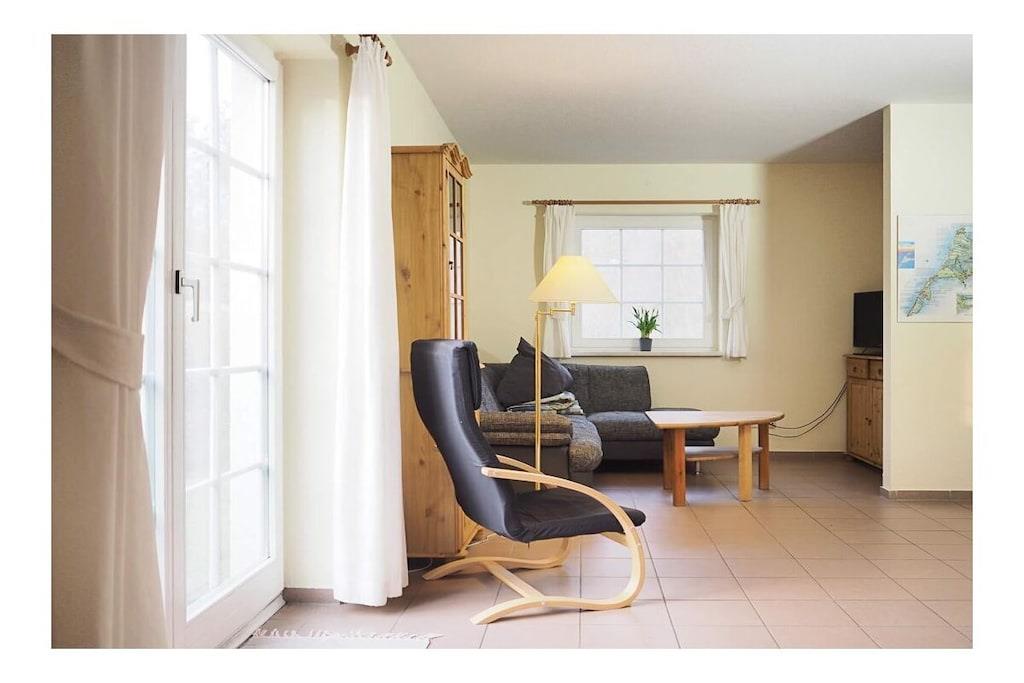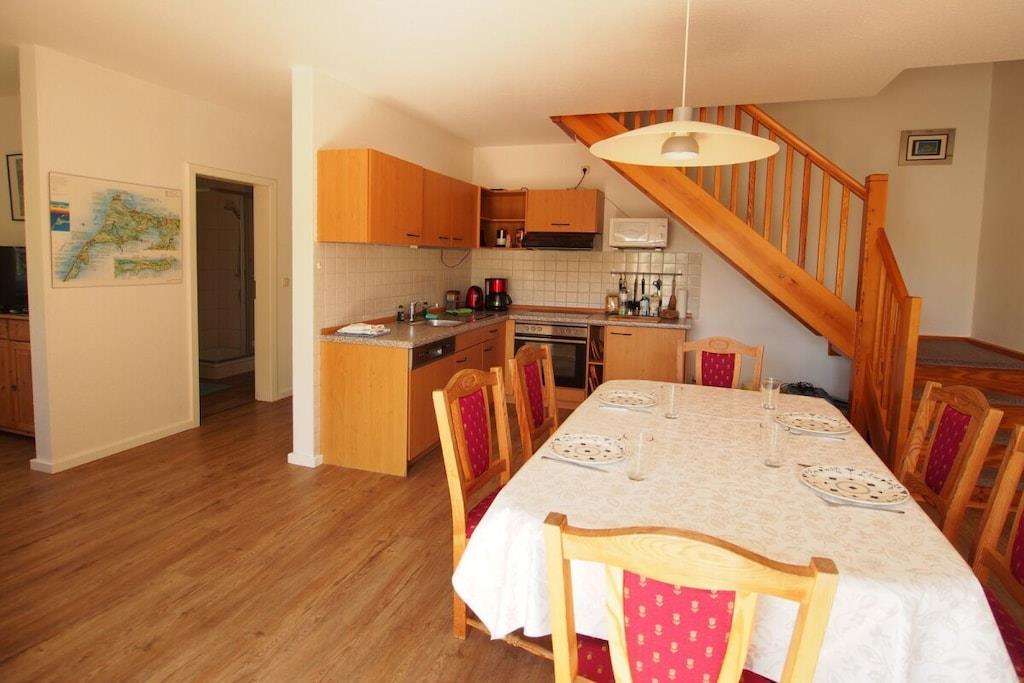 Das Ferienhaus "Strandkorb" - DHH 9 in Prerow ist ein geräumiges Haus für bis zu 4 Personen. Es befindet sich in der Ferienanlage "Im Wiesengrund" und ist nur wenige Fahrradminuten vom Strand und Wald entfernt. Das Haus verfügt über eine Wohnfläche von ca. 72 m² und ist auf zwei Etagen verteilt. Im Erdgeschoss befindet sich ein großzügiger Wohnraum mit Küchenzeile, Couchgarnitur, Esstisch und SAT-TV. Von der Terrasse im Südwesten hat man einen schönen Blick in die Umgebung. Im Obergeschoss befinden sich zwei Schlafzimmer, eines mit Doppelbett und eines mit zwei Einzelbetten. Zusätzlich zum Haus gehören ein Fahrradstellplatz und ein Parkplatz in der Anlage. Haustiere sind auf Anfrage gegen Gebühr erlaubt. Die Ferienhäuser DHH 4 und DHH 7 in derselben Anlage sind ähnlich ausgestattet und bieten ebenfalls Platz für bis zu 4 Personen. Das Ferienhaus "Strandkorb" ist eine gute Wahl für einen Urlaub mit der Familie oder Freunden in Prerow. Das Haus ist geräumig, komfortabel und liegt in einer schönen Lage.