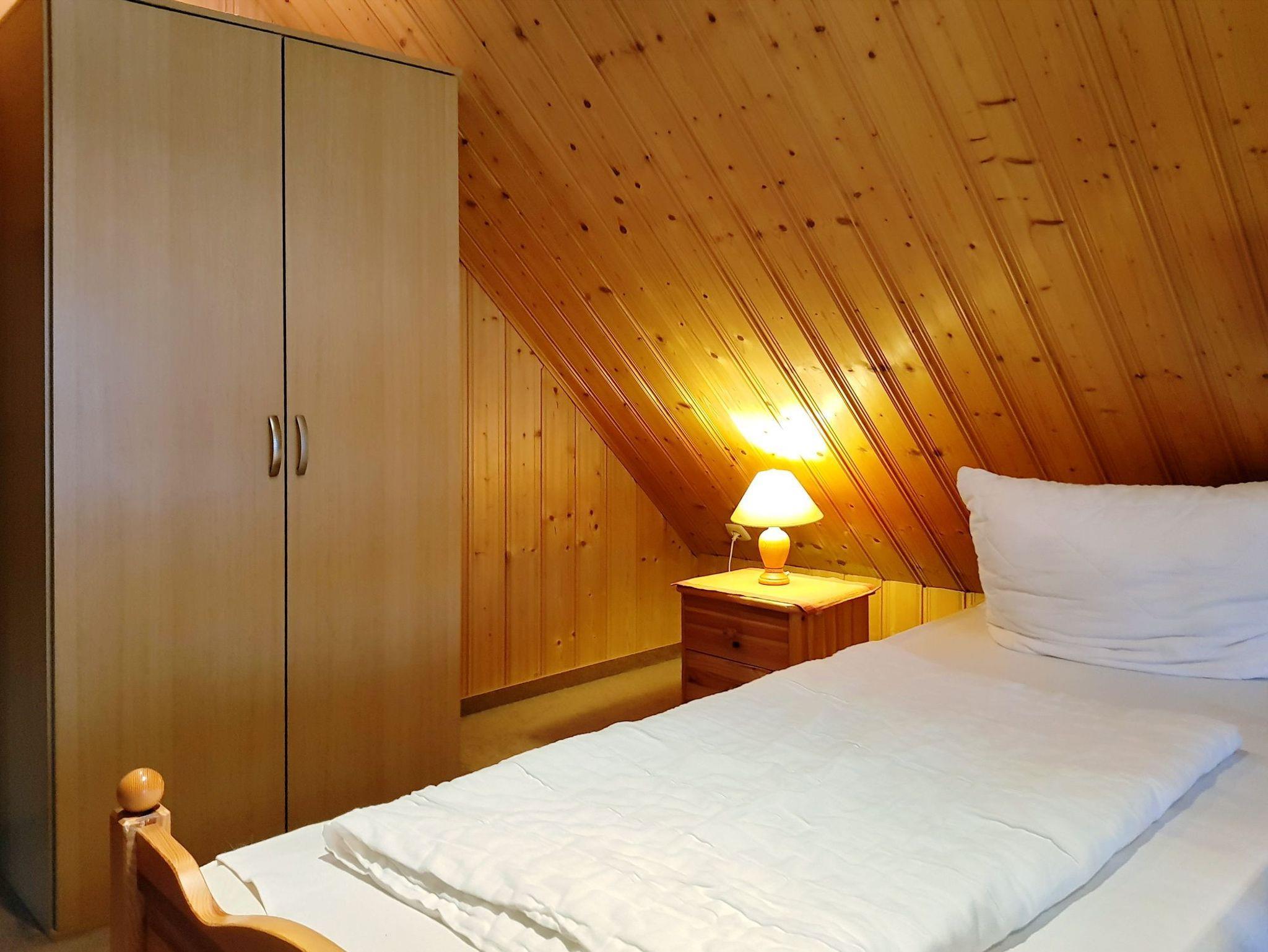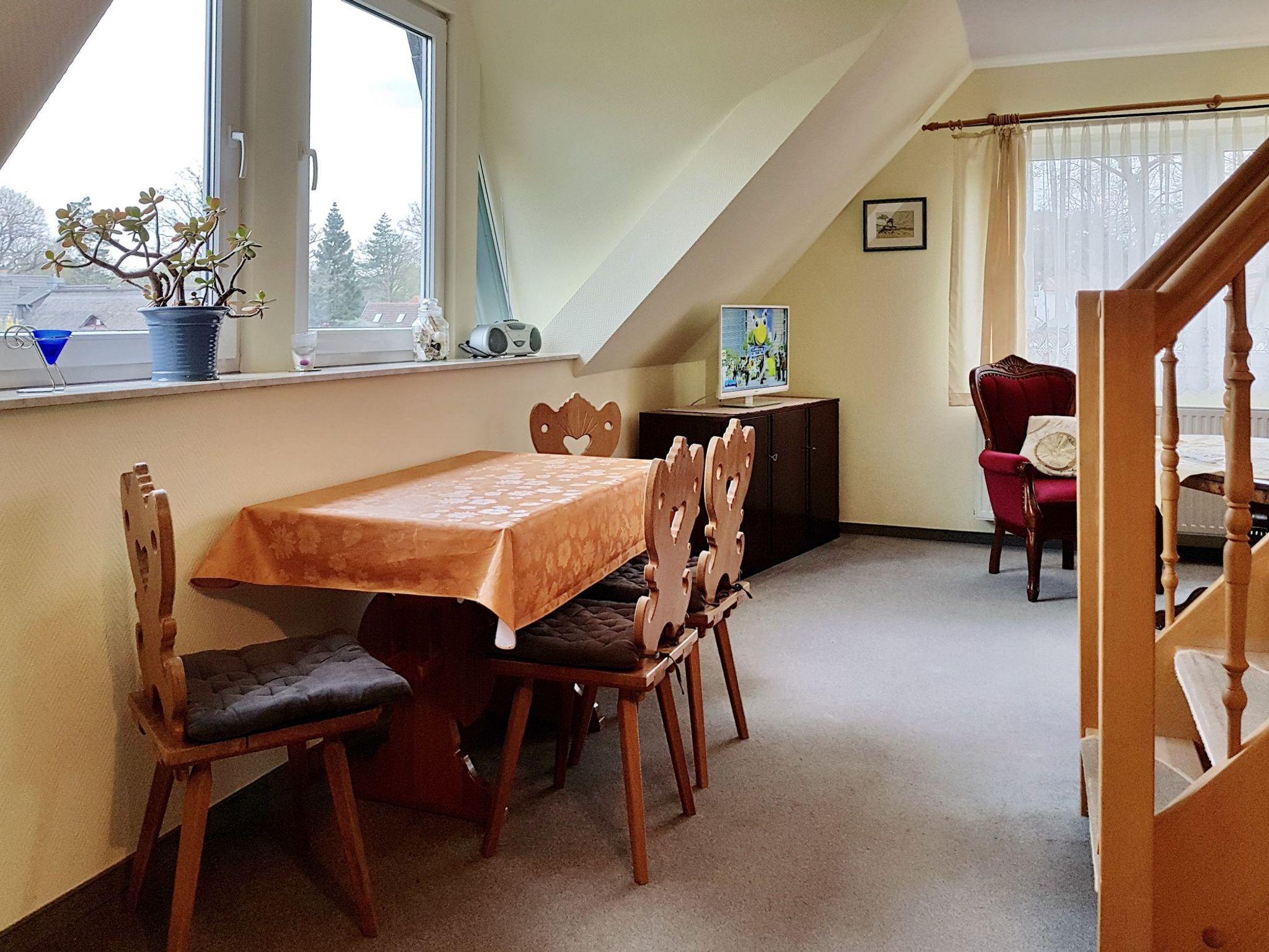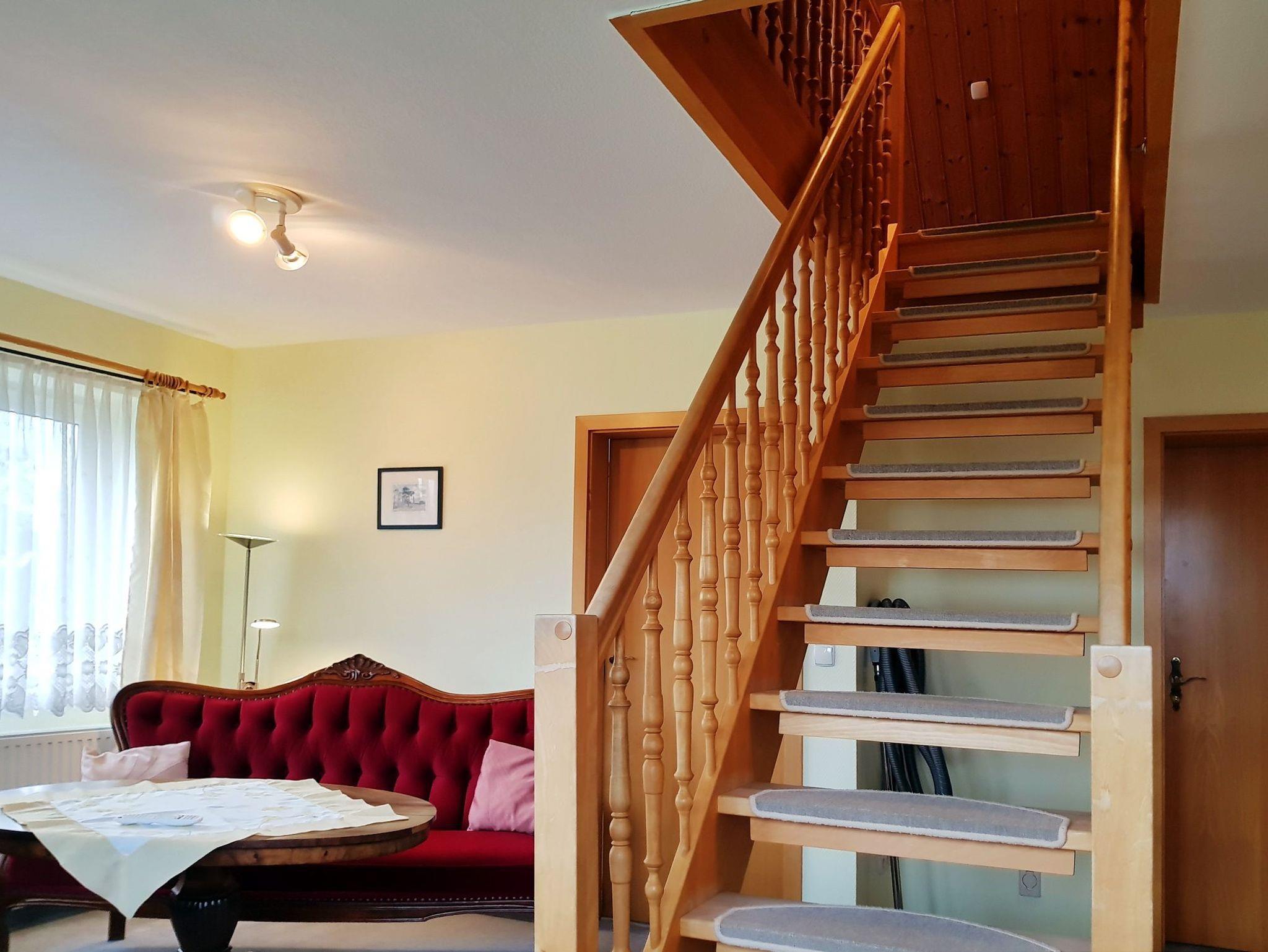 Die gut ausgestattete Ferienwohnung im 1. OG bietet Platz für bis zu 5 Personen. Ein Schlafraum, der Wohnraum mit Küche und das Bad sind im 1.OG. Der 2. Schlafraum ist im DG und über eine zum Wohnraum offene Treppe erreichbar. Vom oberen Schlafraum geht eine Schlafkammer ab, die wie eine kleine Höhle ist und daher bei den meisten Kindern sehr beliebt ist. Diese Schlafhöhle ist mit einer 1,60 x 2m großen Matratze ausgelegt.