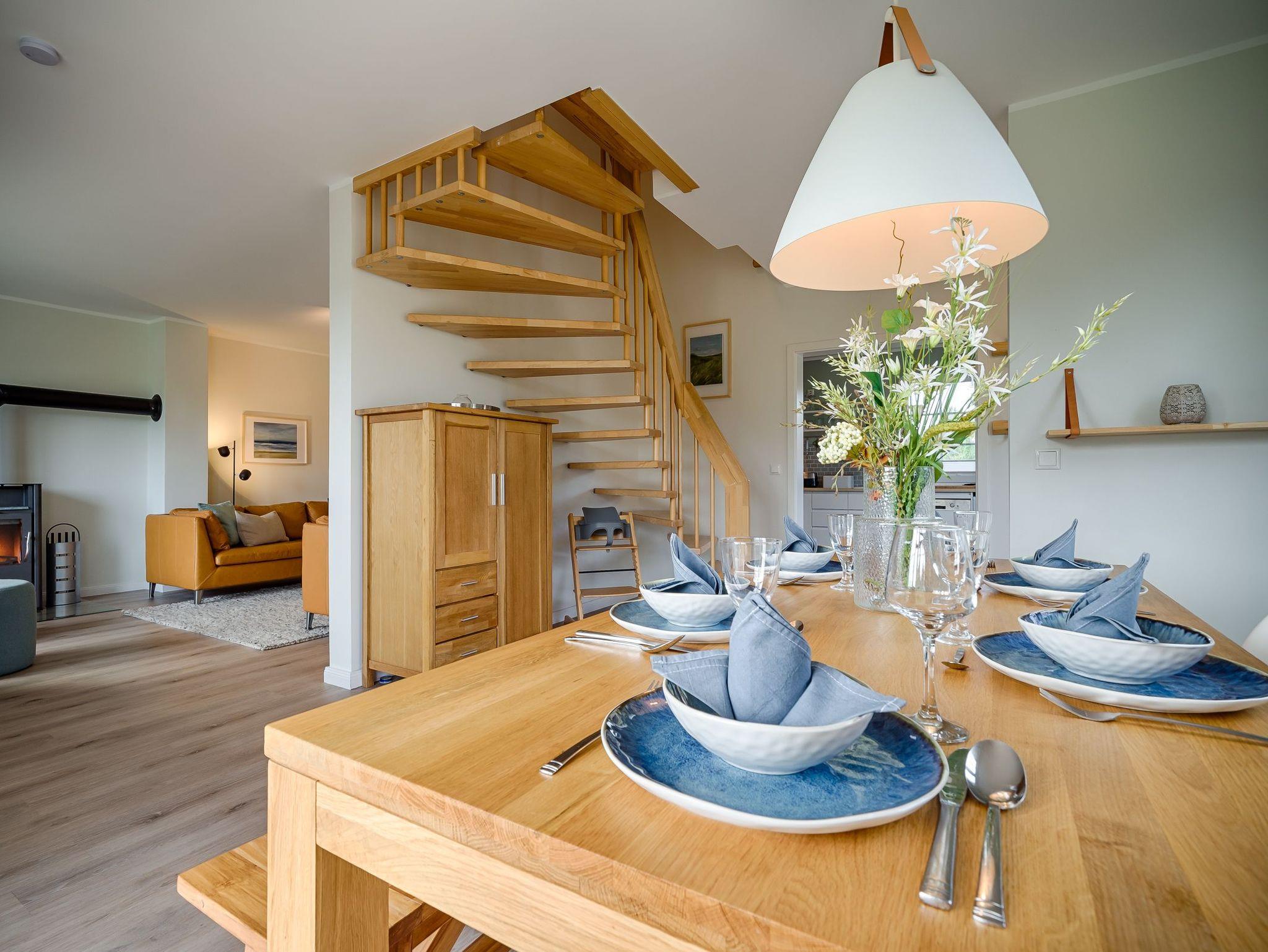 Wohnraum mit 2 Ledersofa, Leseecke mit 2 Ohrensesseln, Schreibtisch mit Lampe (USB-C Anschluss und direkte Handylademöglichkeit), Samsung The Frame TV, Bluetooth-Box, Kaminofen, Esstisch für 8 Personen