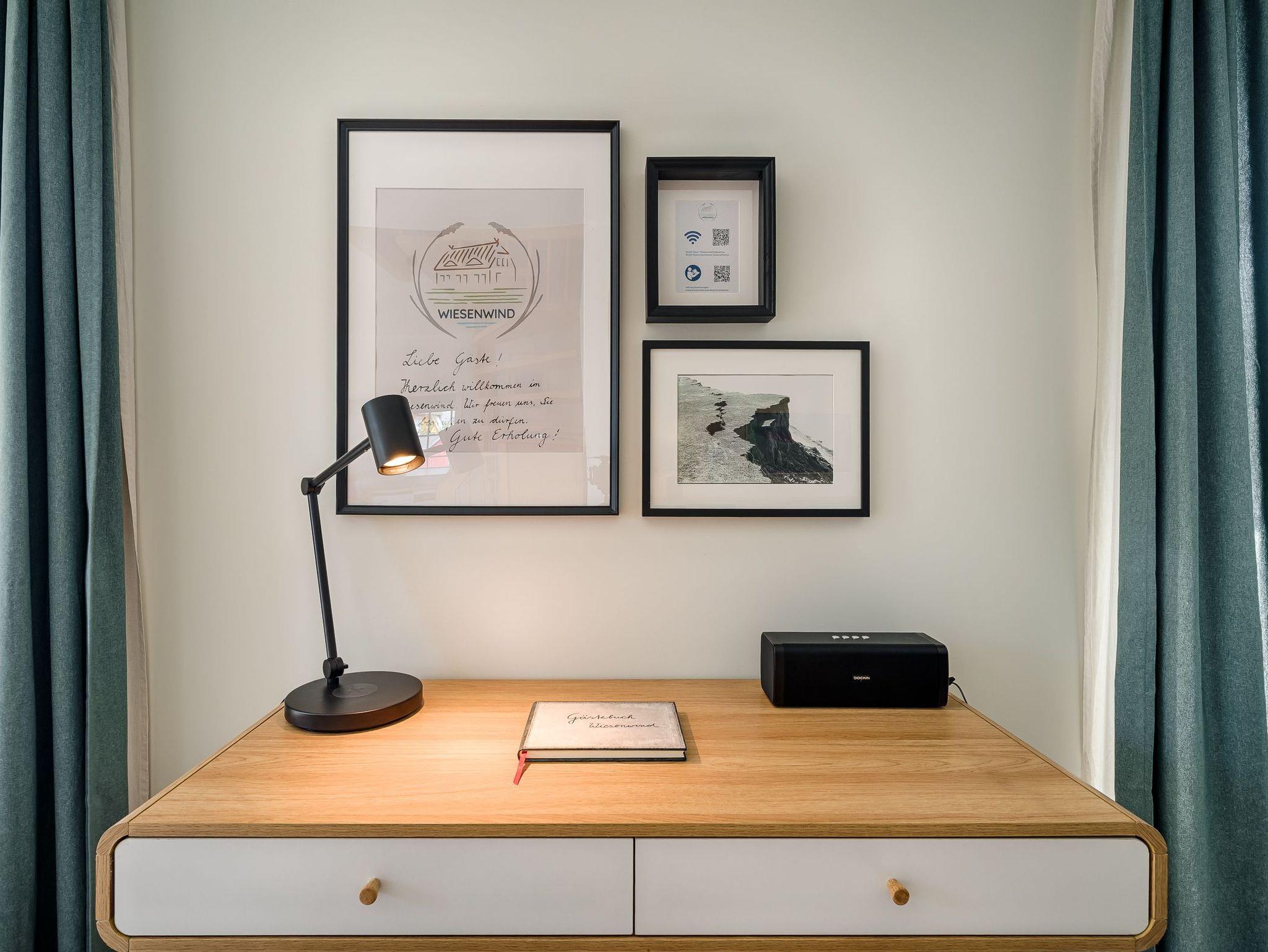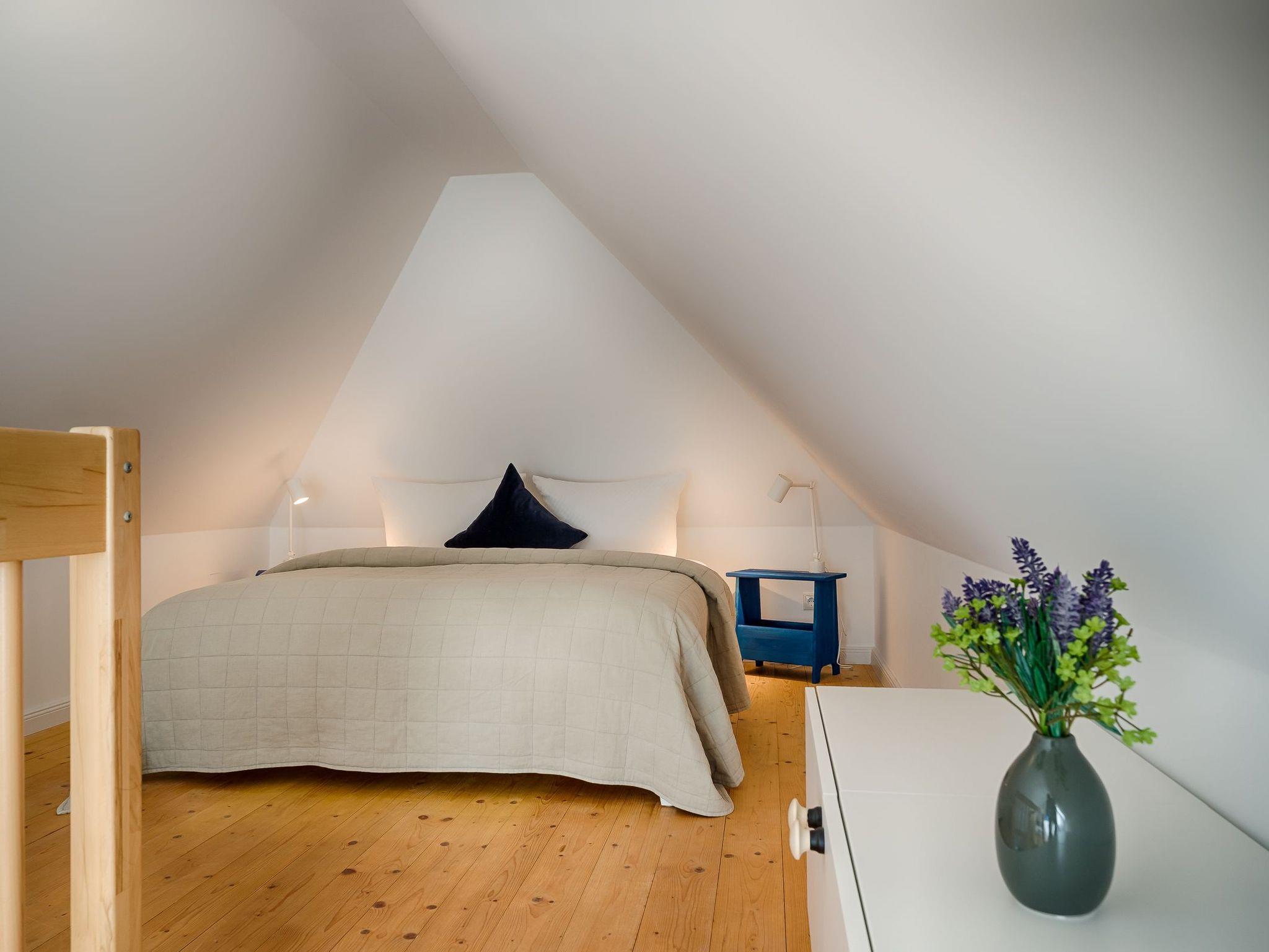 1 Schlafzimmer mit 1 Doppelbett (1,80x2,00m), Schrank, Kommode, Samsung The Frame TV, Durchgang zum Dachgeschoss mit offener Galerie
