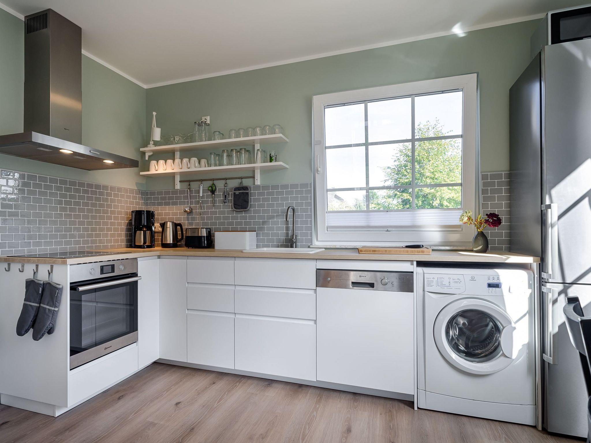 Einbauküche mit Herd/Induktionsfeld und Backofen, Mikrowelle, Spülmaschine, Kühl- und Gefrierkombination (separates Fresh- und Dairy- Fach), Kaffeemaschine, Milchschäumer, Wasserkocher, Waschmaschine, Sitzgelegenheit mit 2 Barhockern