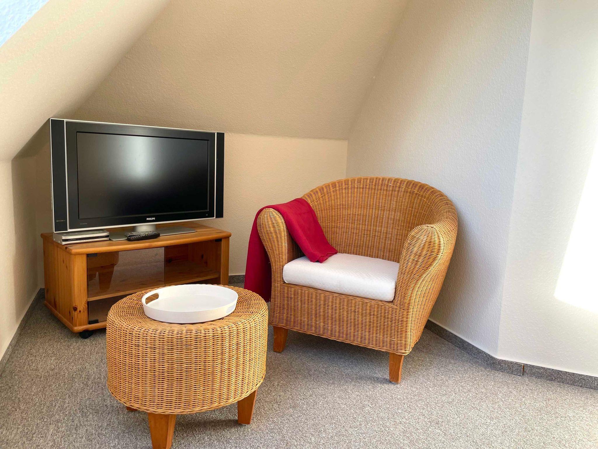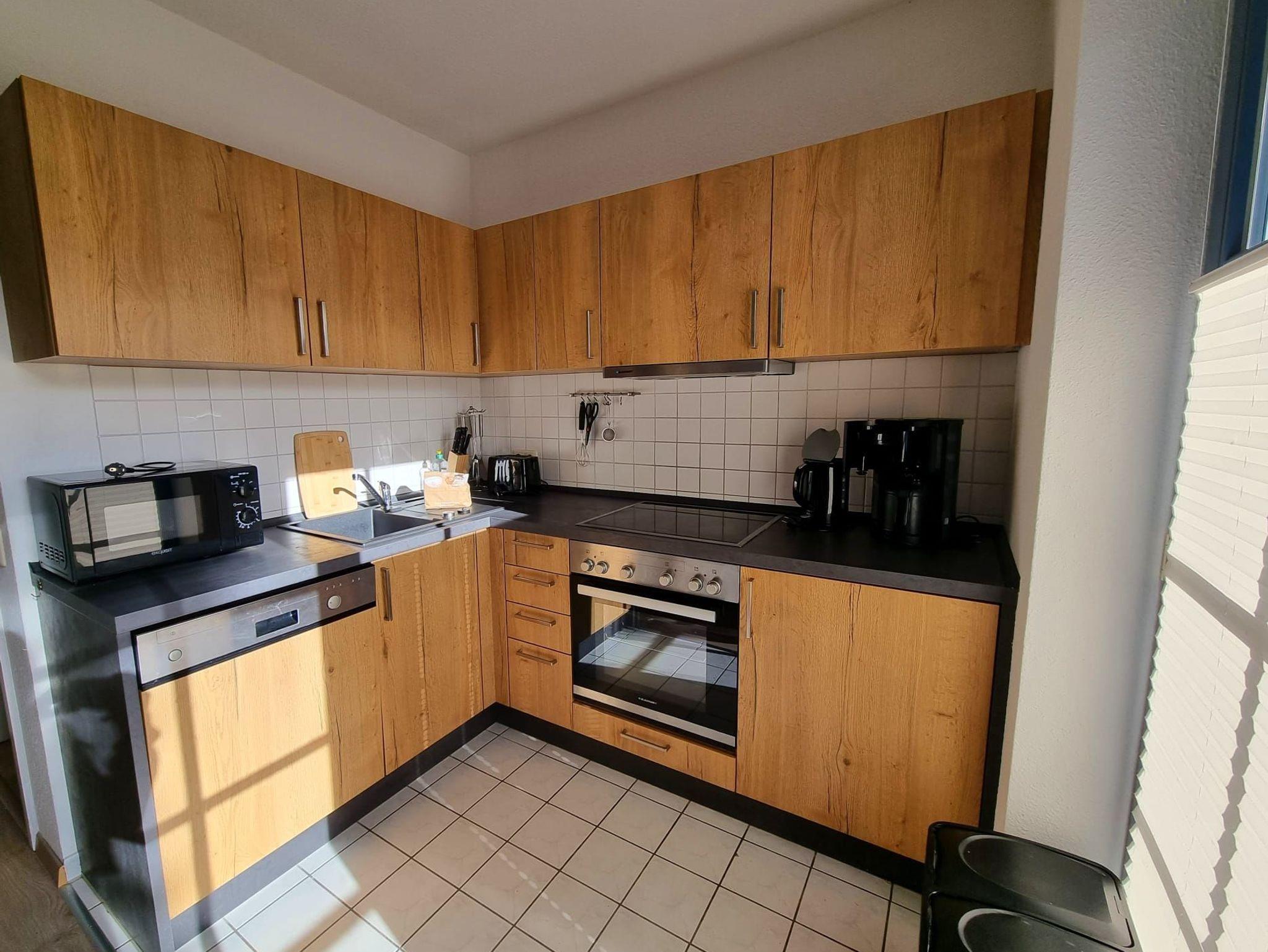 Die Ferienwohnung Seeigel erstreckt sich über 2 Etagen des Hauses. Das helle Wohnzimmer mit Küchenzeile, Eßtisch, der Sitzecke und TV befindet sich in der 1 Etage. Von hier aus gelangen Sie auf den Südbalkon. Die vollausgestattete Küchenzeile mit Herd und Geschirrspüler bietet alles was Sie zum Kochen im Urlaub benötigen.