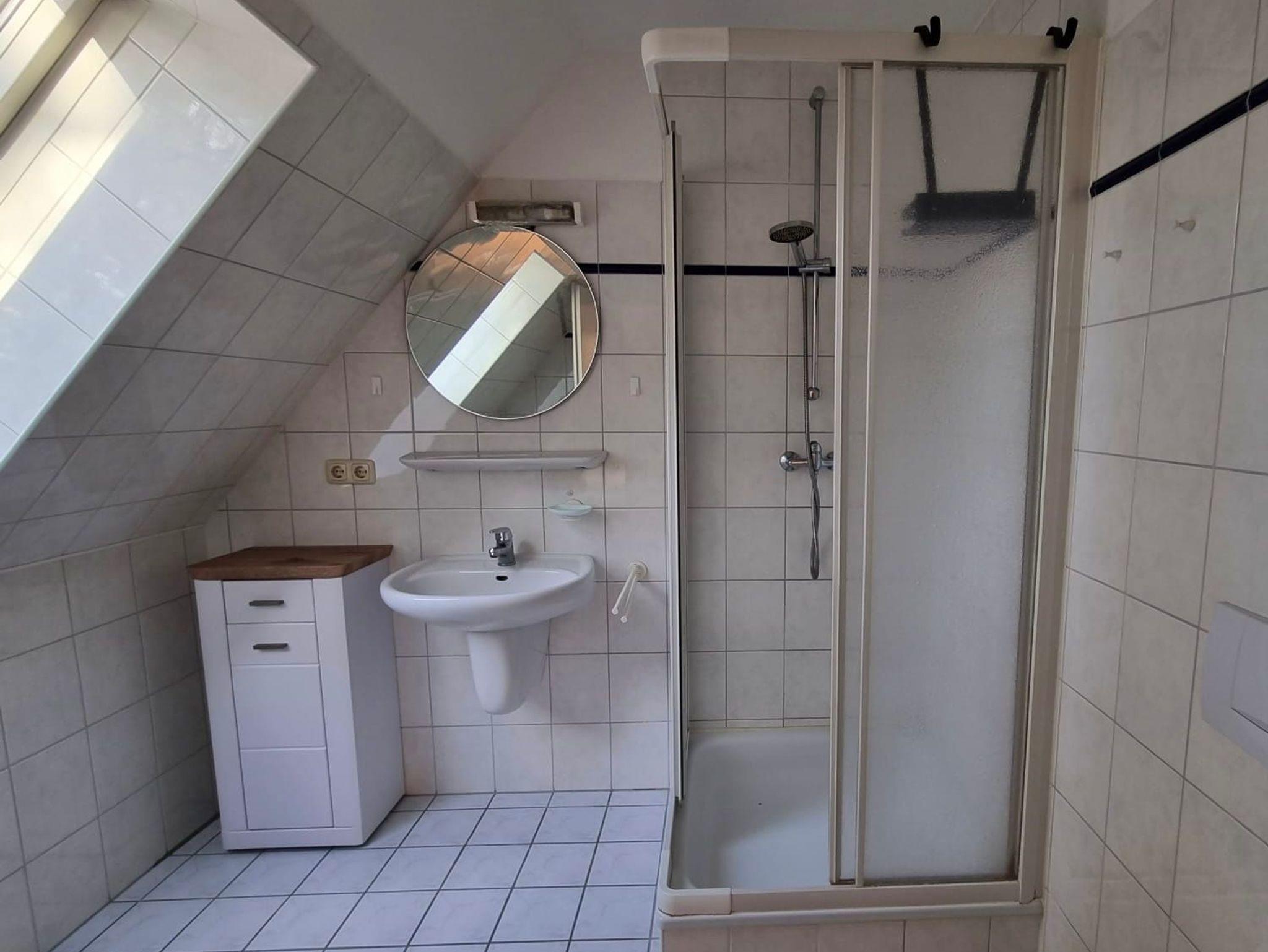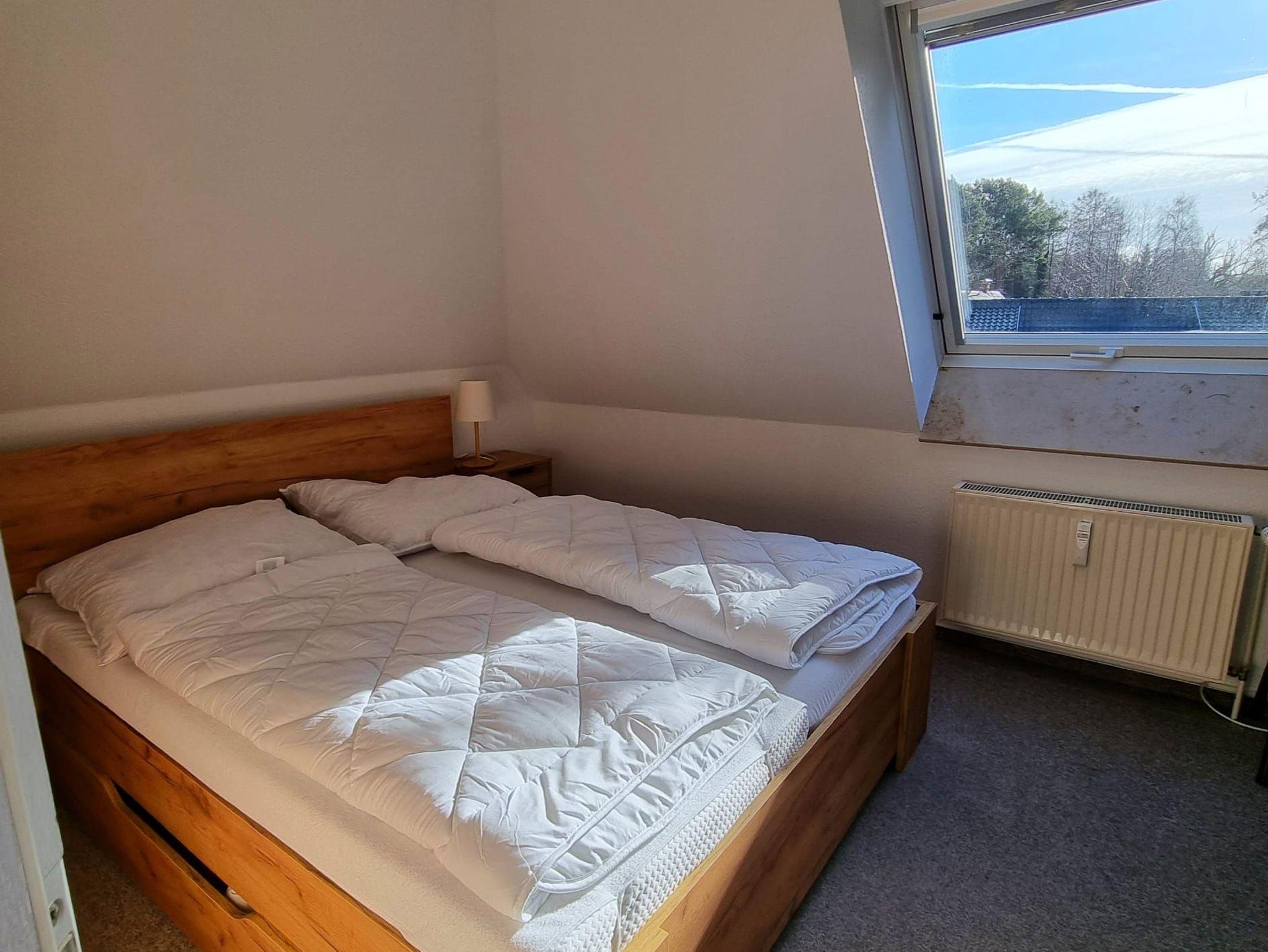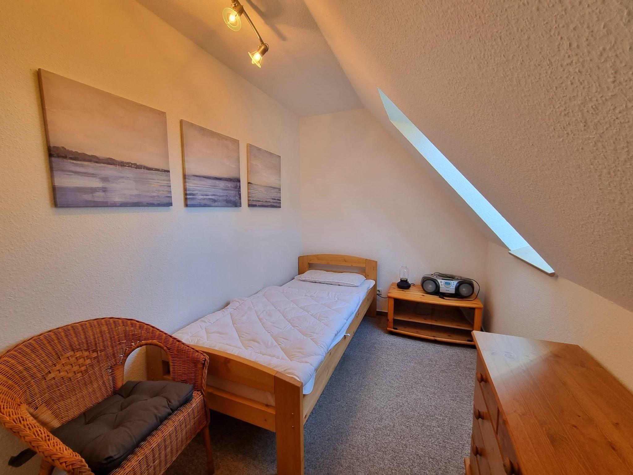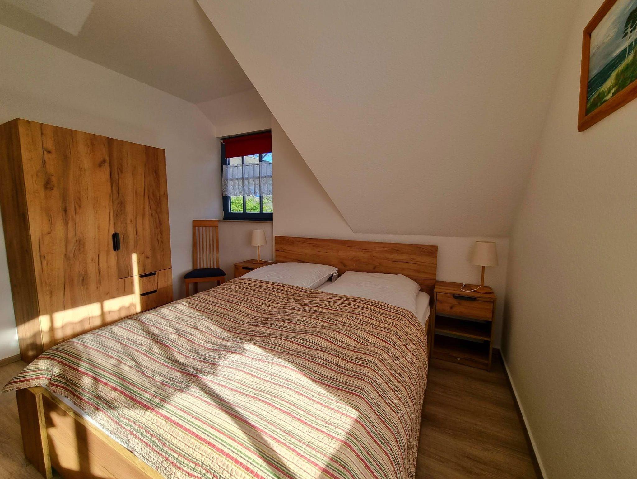Das Schlafzimmer in der 1. Etage ist mit einem Doppelbett, Nachtischen und einem Kleiderschrank eingerichtet. Die Wohnung verfügt praktischer Weise über zwei Duschbäder, eins auf jeder Etage. In die 2. Etage gelangen Sie über eine offene Treppe. Dort befindet sich neben dem Duschbad ein Schlafzimmer mit Doppelbett und TV auch ein Schlafzimmer mit einem Einzelbett.
