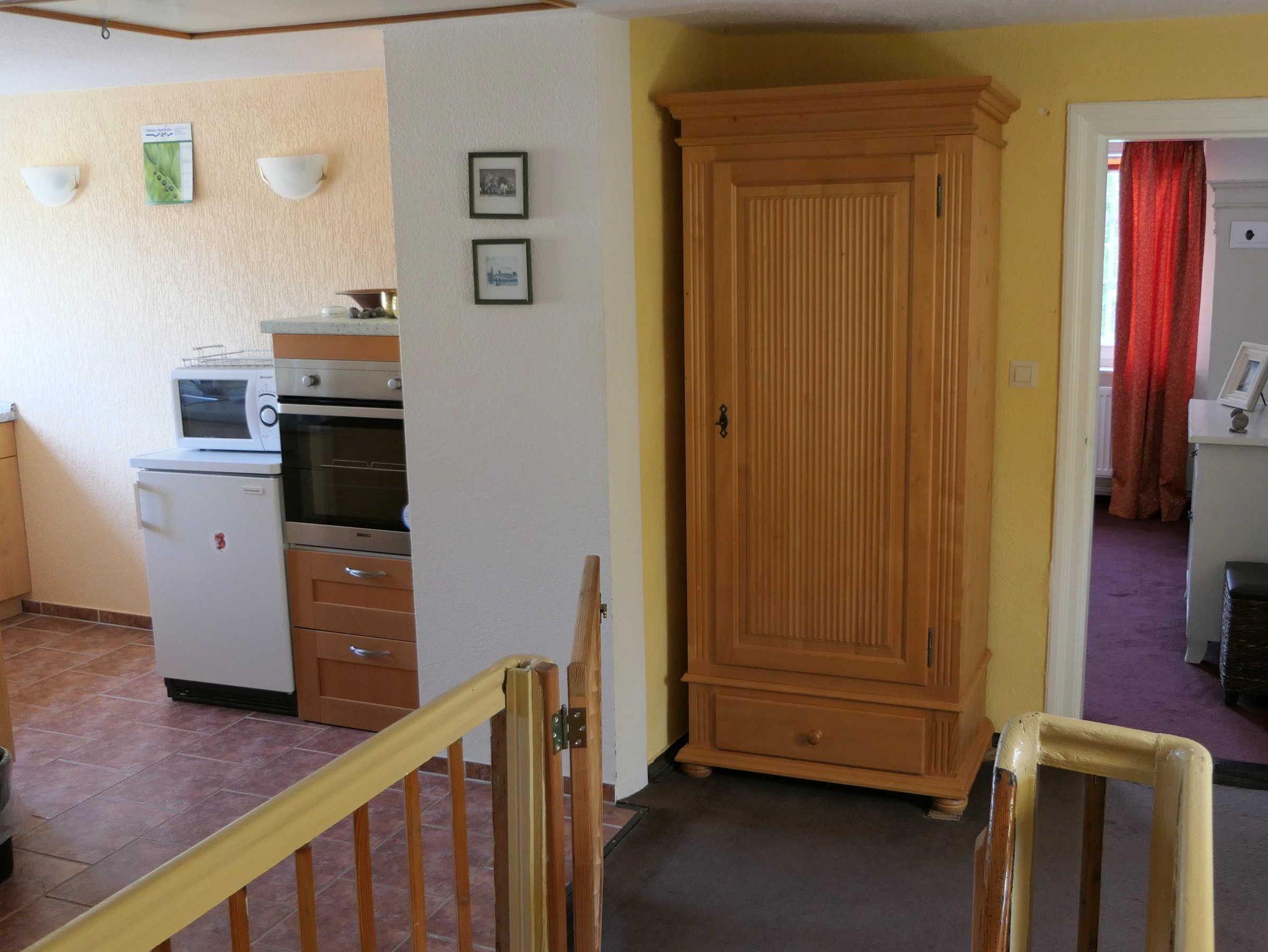 Die Ferienwohnung ist wegen der relativ steilen Treppe erst für Kinder ab 5-6 Jahren geeignet. Sitz- und Kochecke, sowie der Treppenaufgang sind offen gestaltet.