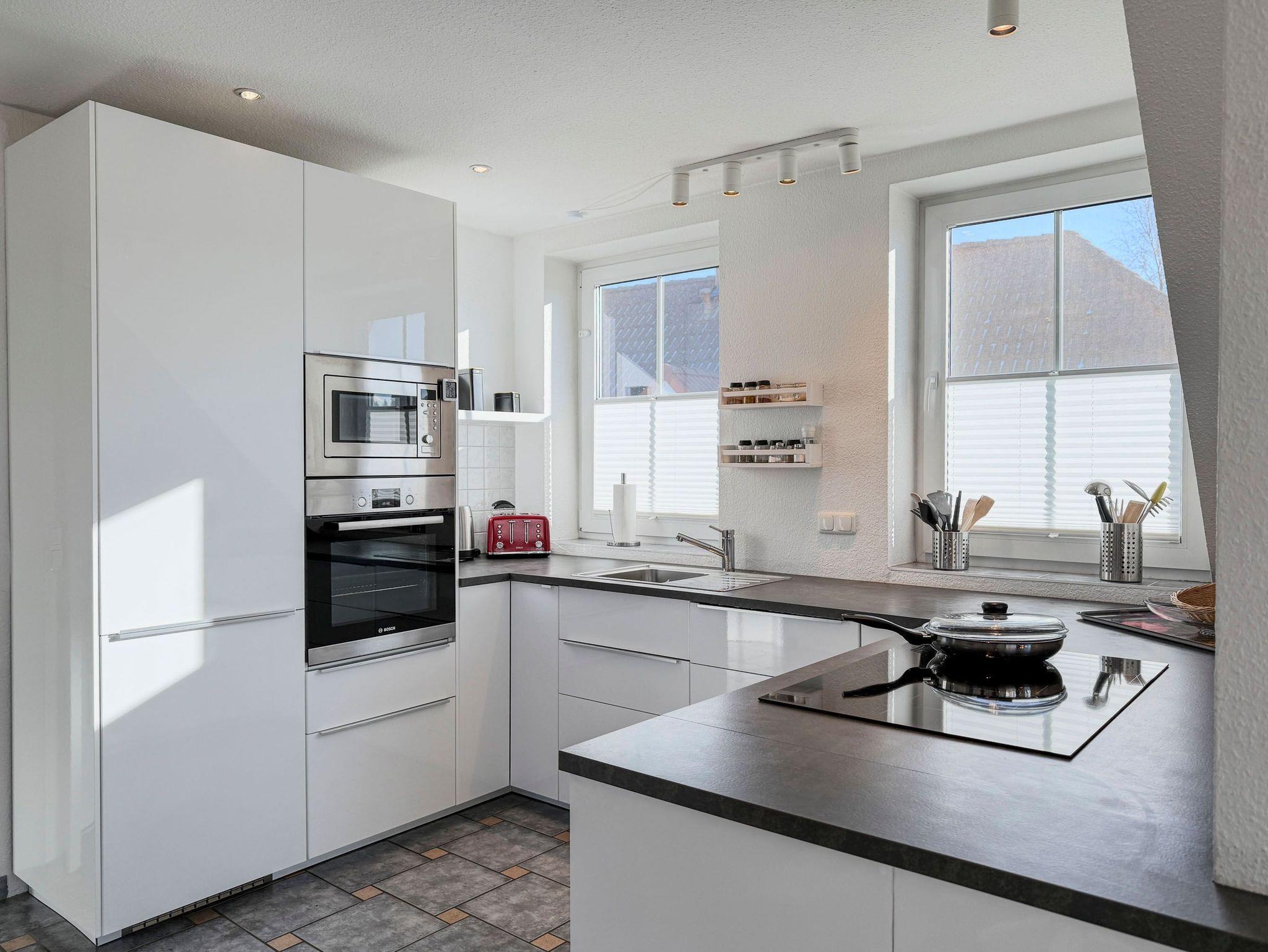 • Küche: Voll ausgestattete Küchenzeile mit Backofen, Kochfeld, Mikrowelle, Kühlschrank mit Gefrierfach, Geschirrspüler, Filterkaffeemaschine, Toaster und Wasserkocher