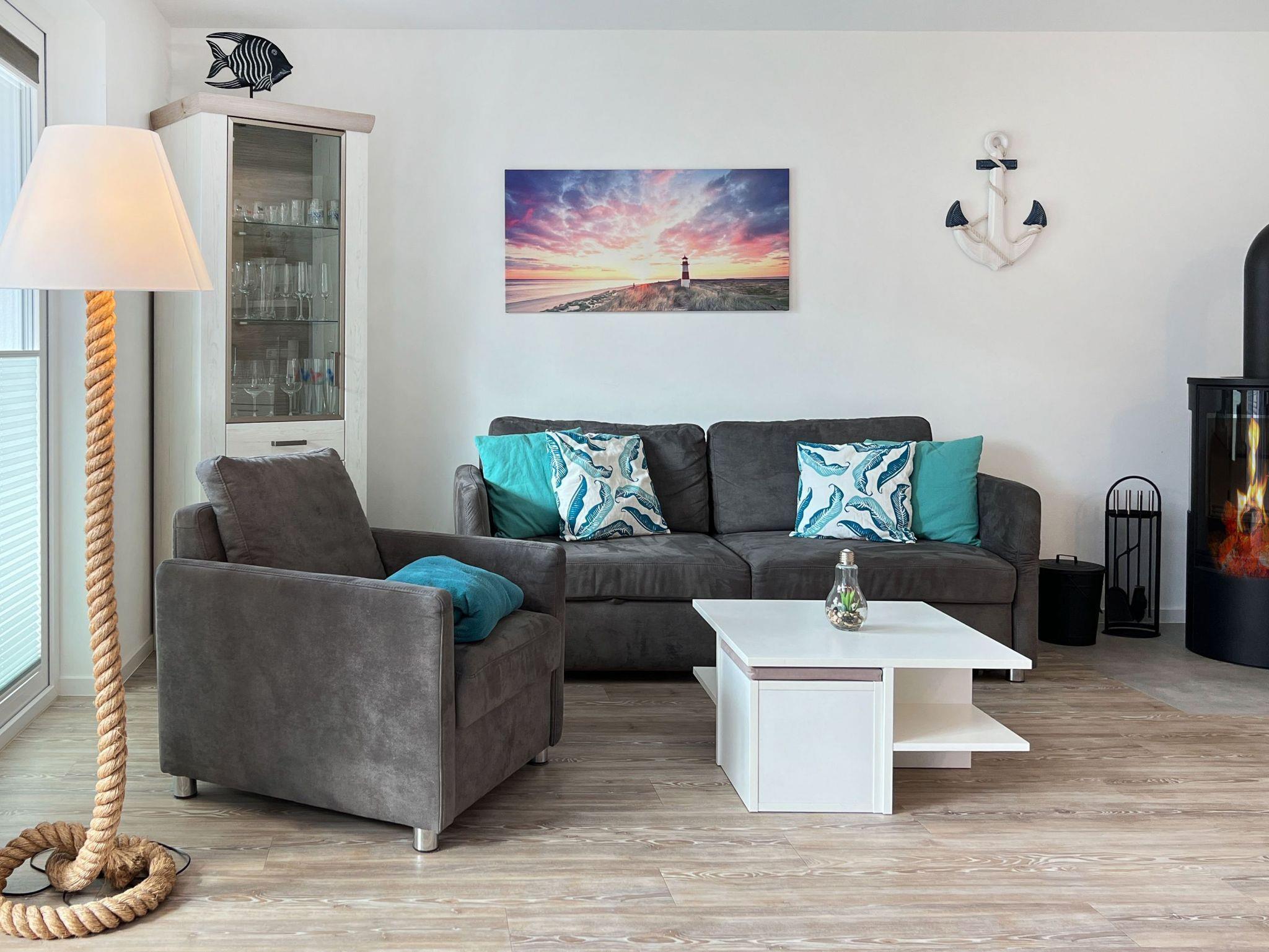 Die Ferienwohnung Tordalk, Whg. 01 empfängt Sie mit einer harmonischen Kombination aus modernem Komfort und maritimem Ambiente. Der helle Wohnbereich mit Kamin lädt zu entspannten Stunden ein, während die voll ausgestattete Küchenzeile keine Wünsche offenlässt. Genießen Sie Ihre Mahlzeiten auf der westlich ausgerichteten Terrasse und lassen Sie den Tag in gemütlicher Atmosphäre ausklingen. Das moderne Badezimmer und das komfortable Schlafzimmer bieten zusätzlichen Komfort für erholsame Nächte.