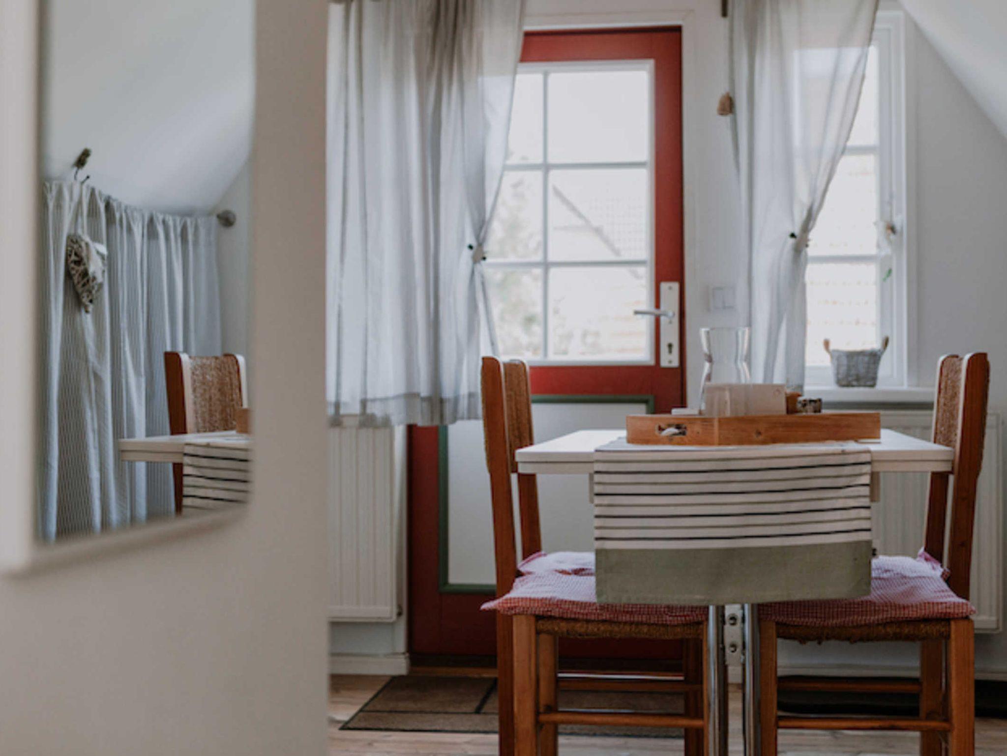 Die moderne Küche ist großzügig ausgestattet, für alles Frische, was aus dem Meer direkt auf den Tisch kommen soll. Vom Esstisch genießen Sie durch die verglaste Darsser Tür die Morgensonne und den Blick auf Prerow´s Grün. Hier erwartet Sie außerdem etwas ganz Typisches: 2 Alkoven ? in die Dachschräge eingebaute Schlafnischen dienen Ihnen oder Ihren Kindern als eine besondere Schlafgelegenheit.