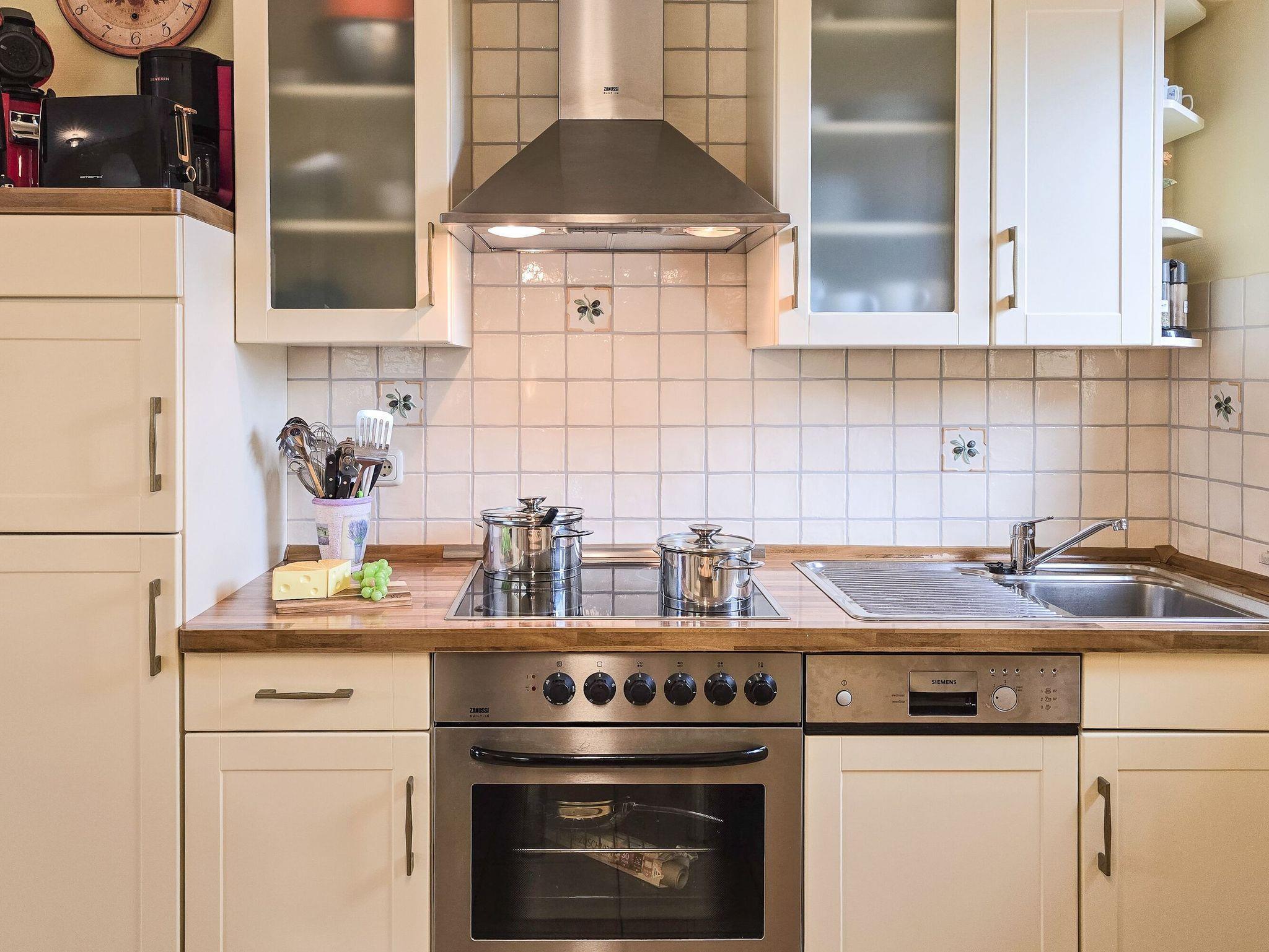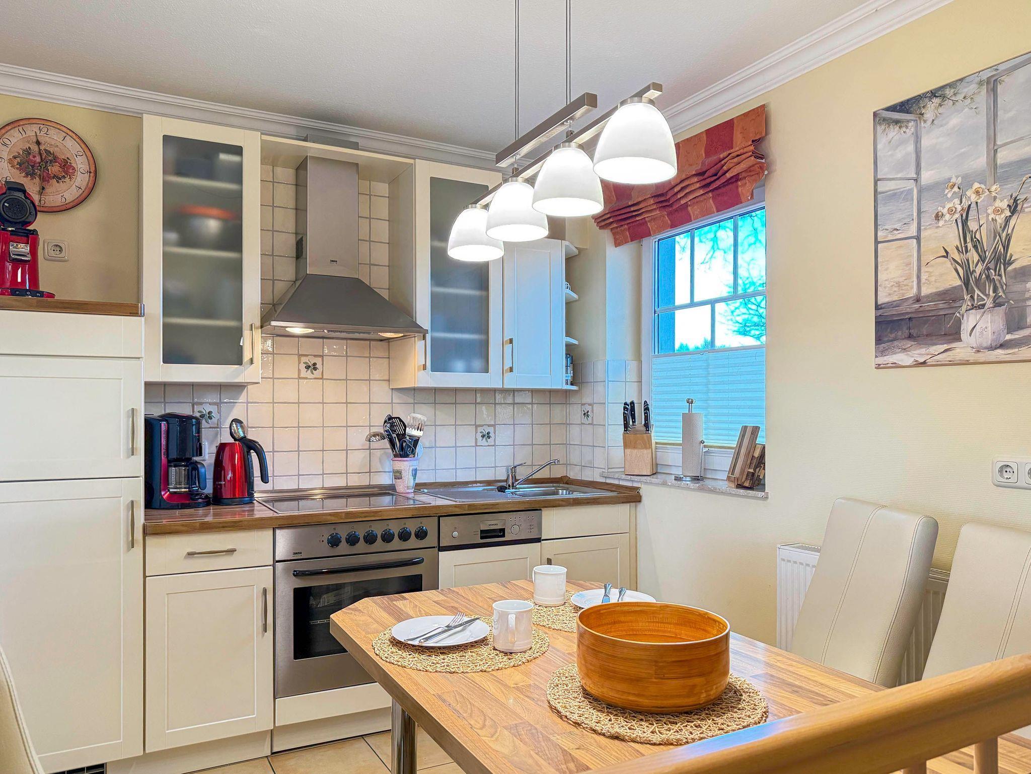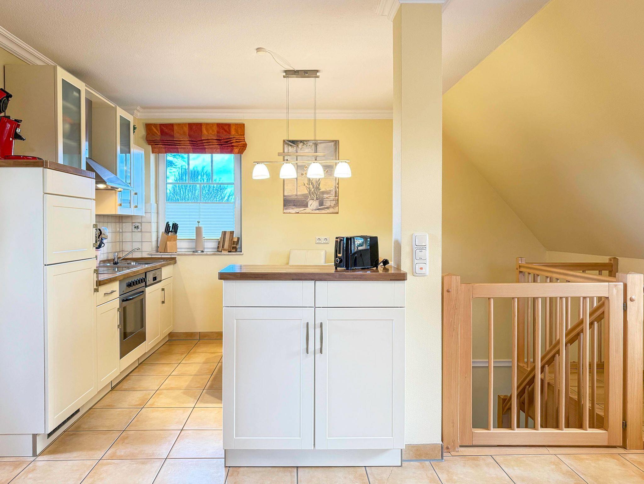 • Küche: Voll ausgestattete Küchenzeile mit Spülmaschine, Backofen, Kochfeld, Kühlschrank, Filterkaffeemaschine und Pad-Kaffeemaschine