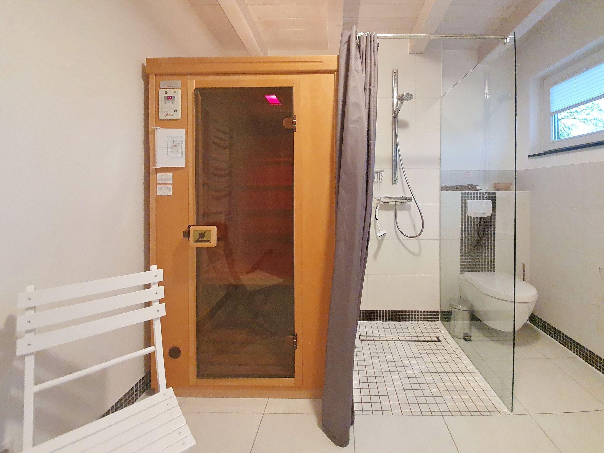 Die westliche Ferienhaushälfte wird hier zur Vermietung angeboten, die andere Haushälfte wird zeitweise vom Eigentümer selbst genutzt. In der ca. 58 qm großen Ferienwohnung können bis zu 3 Personen und 1 Kleinkind einen entspannten Urlaub genießen. Die Ferienwohnung ist modern und[nbsp] stilvoll eingerichtet. Hierzu trägt neben dem gemütlichen Wohnzimmer mit Couch Sat-TV, Musikanlage mit Radio und CD, auch ein Kaminofen und im Bad eine Infrarot-Wärme-Kabine bei. An den Wohnraum schließt sich eine komfortabel ausgestatte Küche mit Backofen, Geschirrspüler, Kühlschrank (ohne Gefrierfach), Mikrowelle, Filterkaffeemaschine, Wasserkocher, Toaster und reichlich Geschirr an. Eine große gemütliche Sitzecke befindet sich direkt neben der Küche.