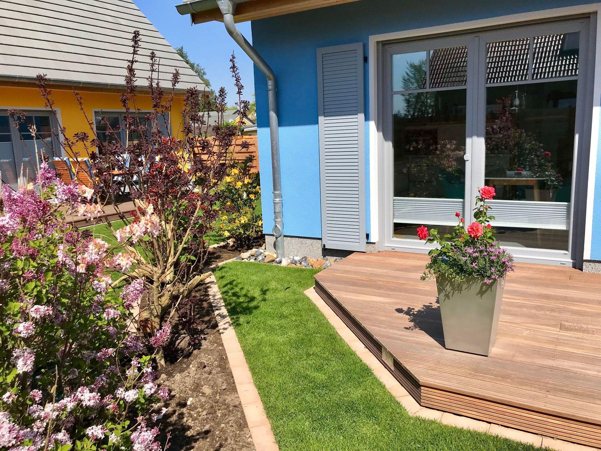 Rund um das Wohnzimmer zieht sich eine große Holzterrasse und Sie haben ein eigenes Stück Garten, der blickgeschützt eingezäunt wurde. Für Ihre E-Bikes gibt es Lademöglichkeit direkt am überdachten Fahrradständer.
