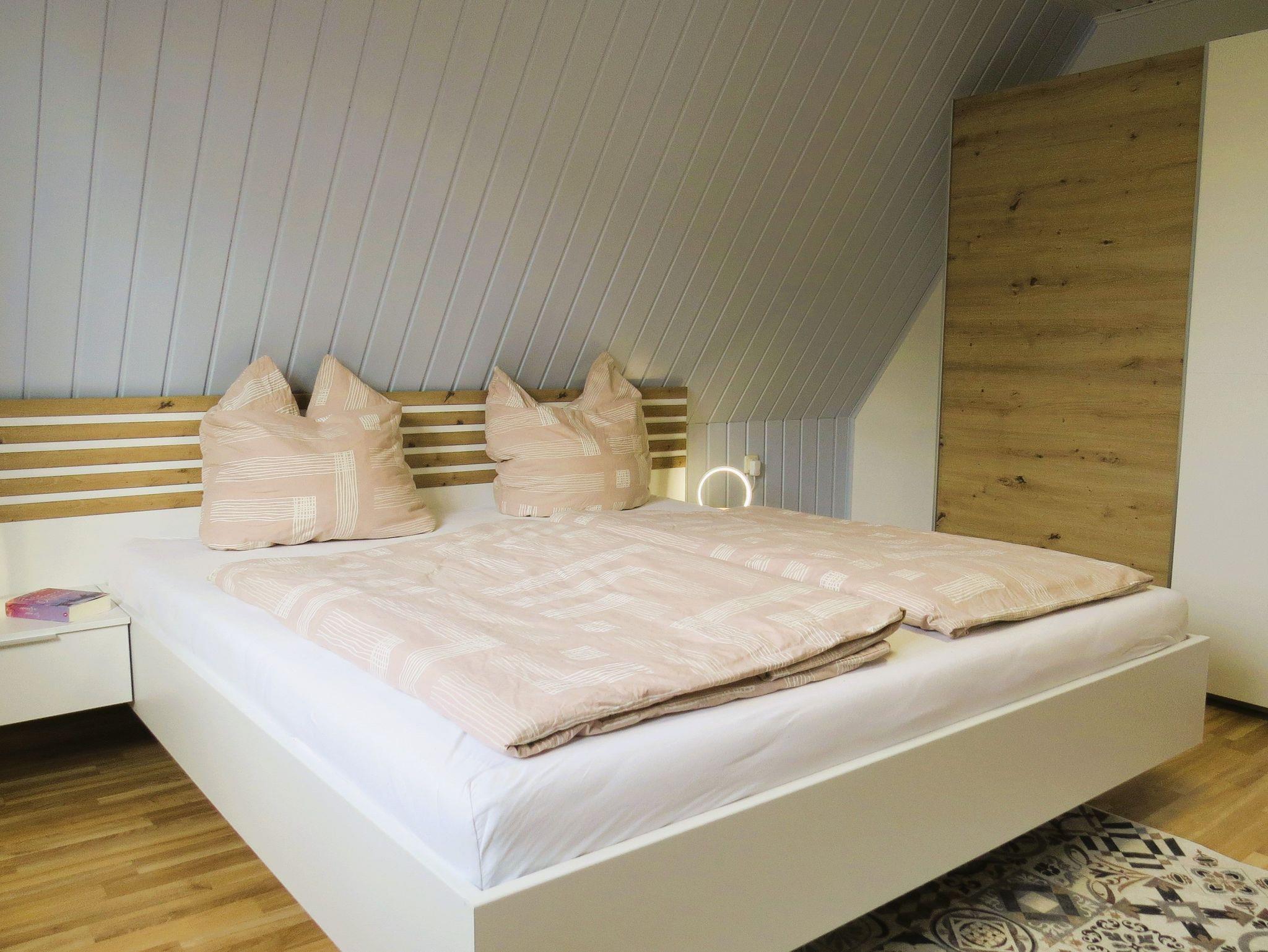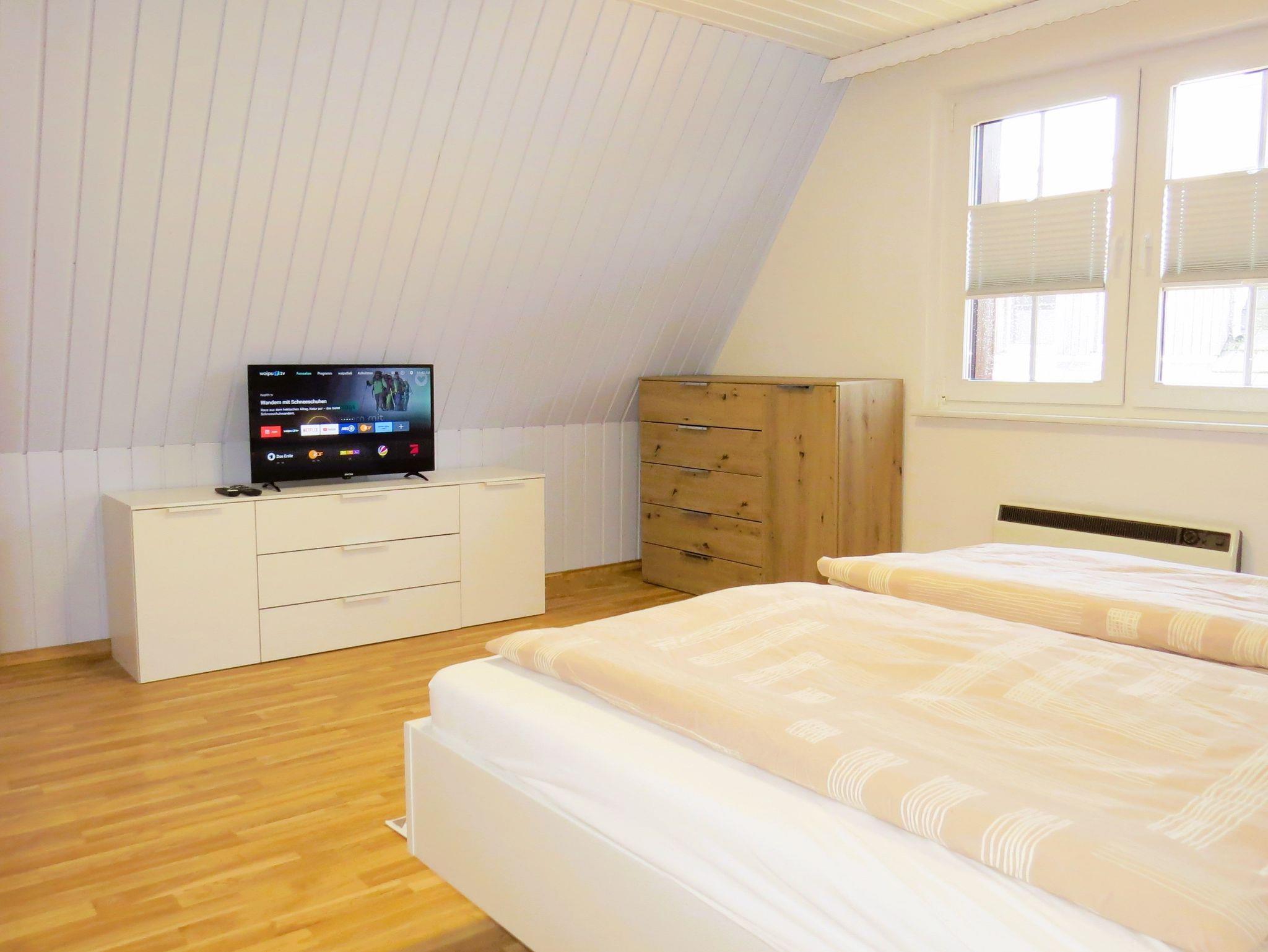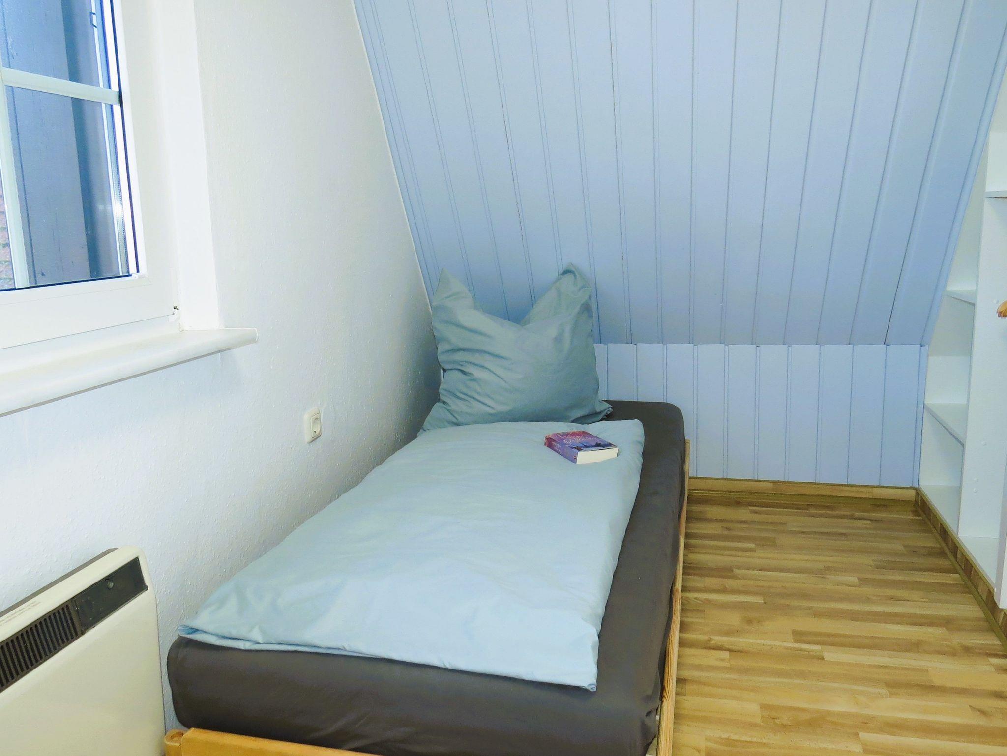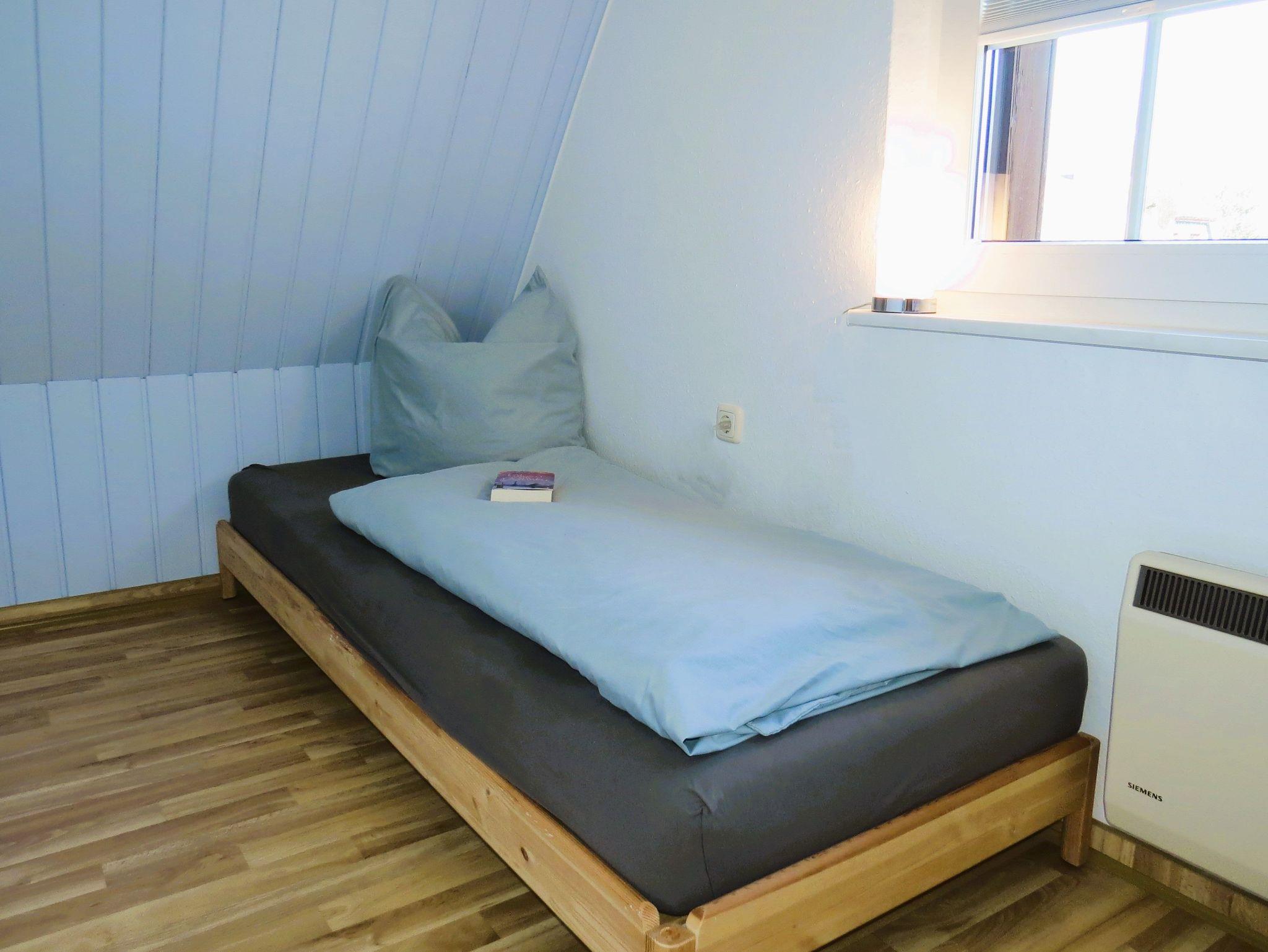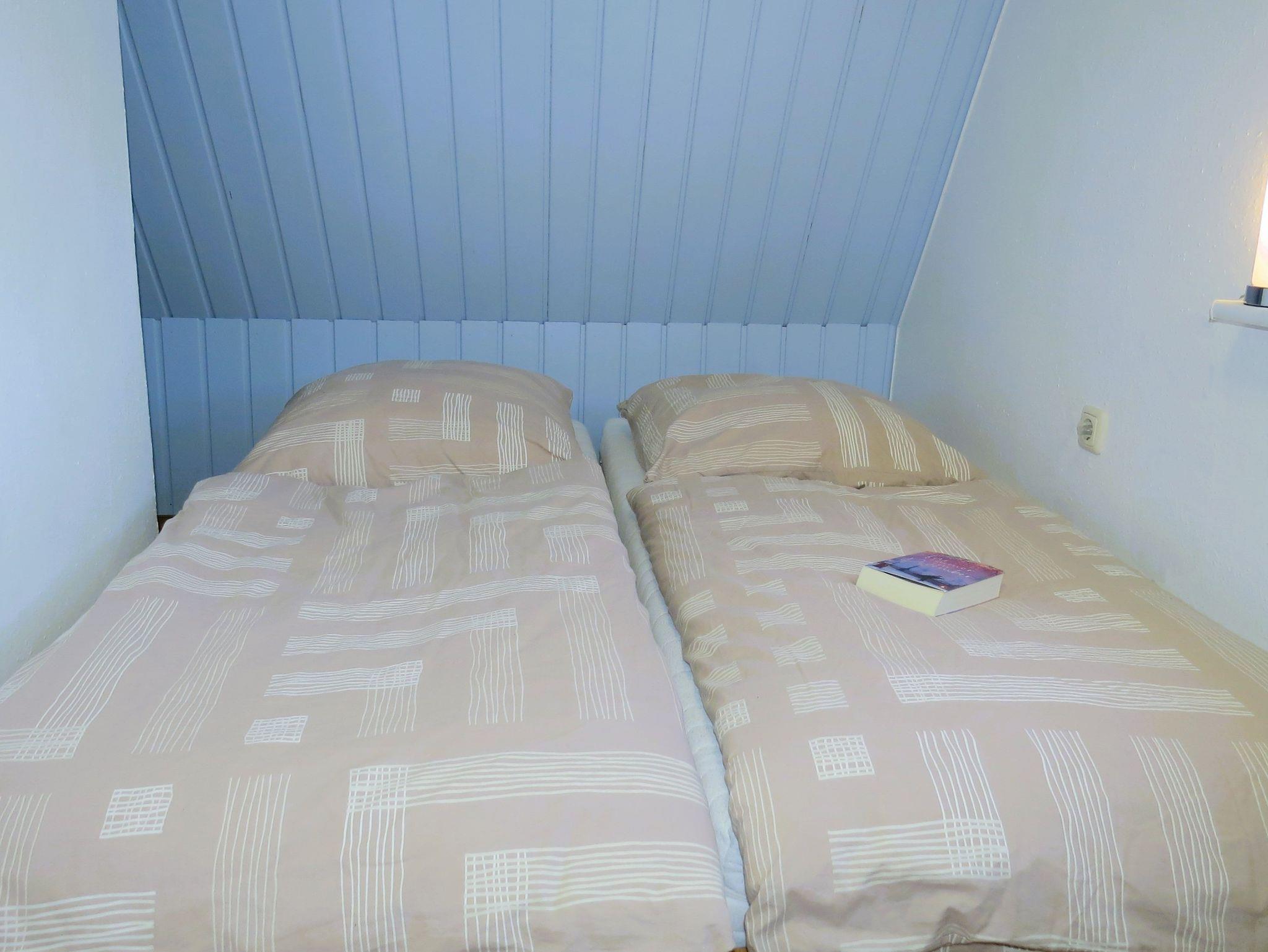 Im Obergeschoss liegen zwei separate Schlafzimmer. Ein Kinderbett für Kleinkinder kann gerne auf Wunsch aufgestellt werden. Im kleinen Schlafzimmer können Sie zwischen zwei Einzelbetten oder einem Doppelbett wählen.