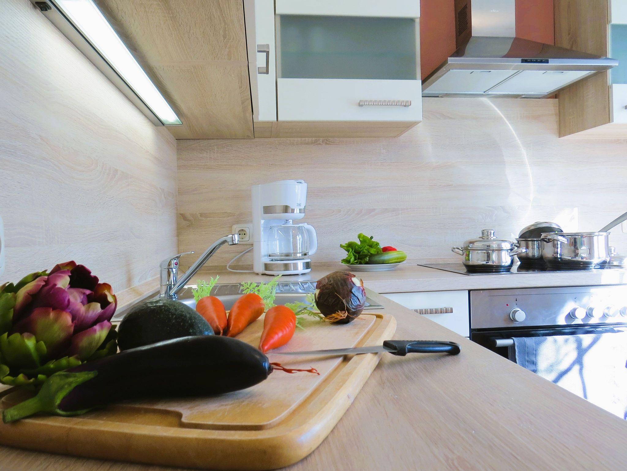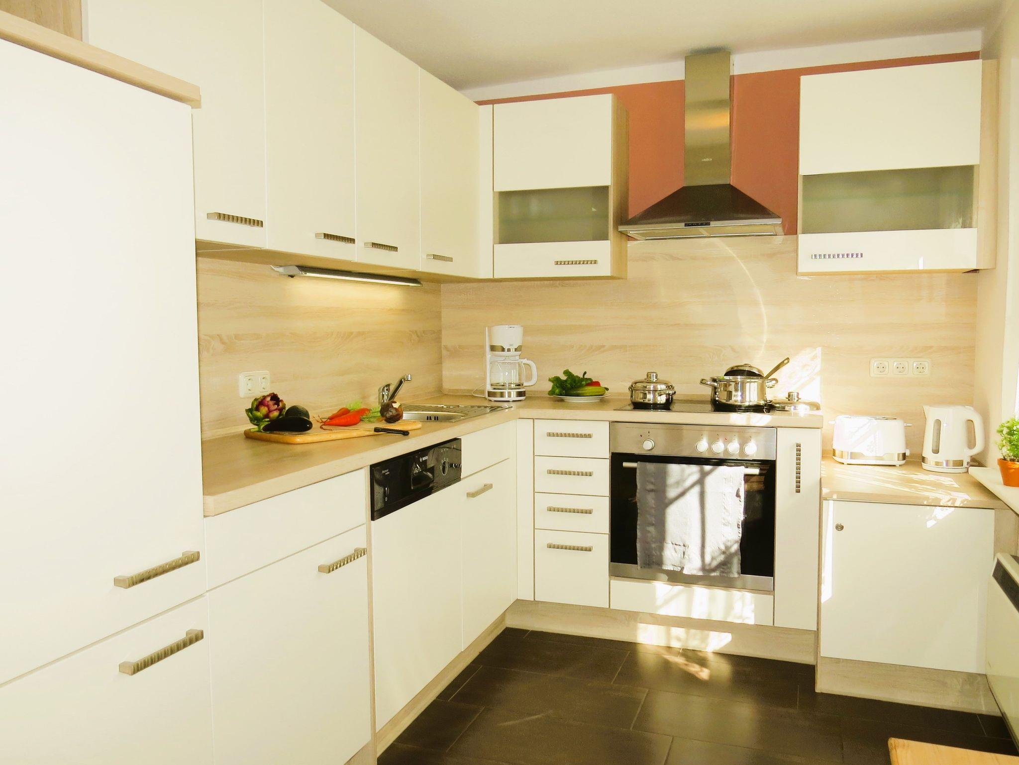 Im Untergeschoss befindet sich das Wohn- und Esszimmer mit offener Küche. Die Küche ist mit Cerankochfeld, Backofen, Geschirrspüler, Toaster, Kaffeemaschine, Kühlschrank und notwendigem Geschirr und Töpfen komplett ausgestattet.