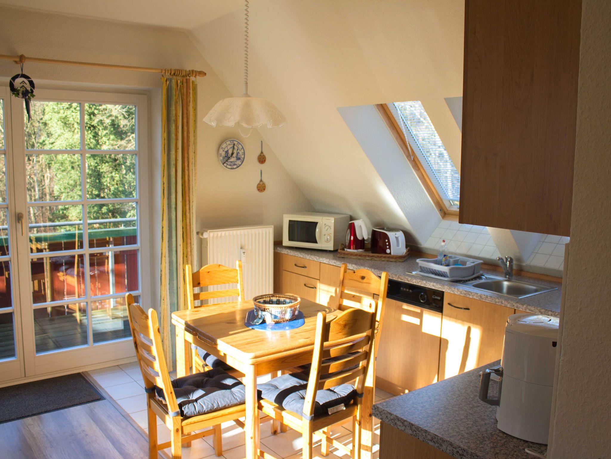 mit einer komplett ausgestatteten Küchenzeile mit Esstisch,