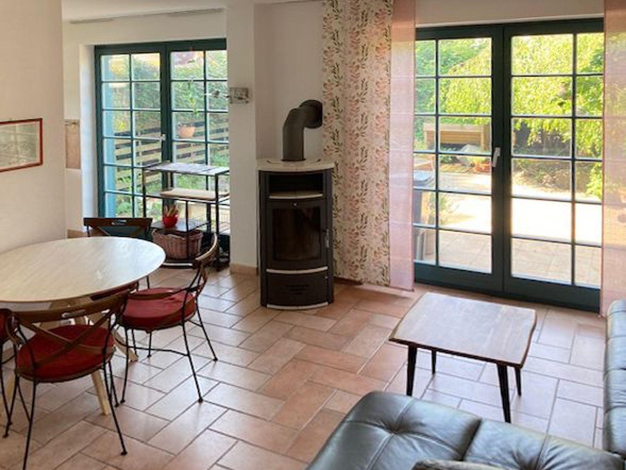 Das Lütt Klönhus in Prerow bietet eine helle Wohnküche, Kaminofen und eine blickgeschützte Terrasse für erholsame Tage.