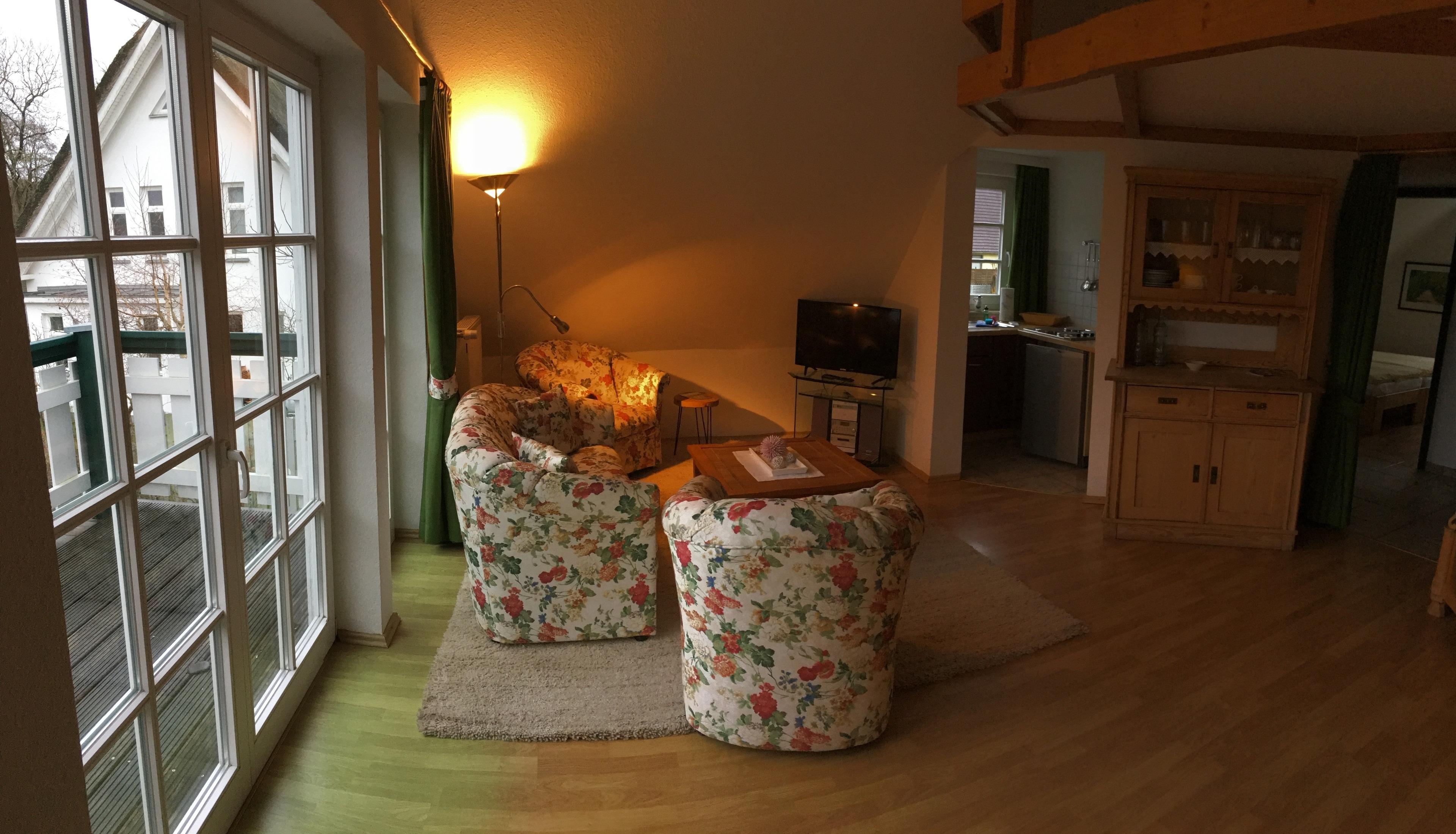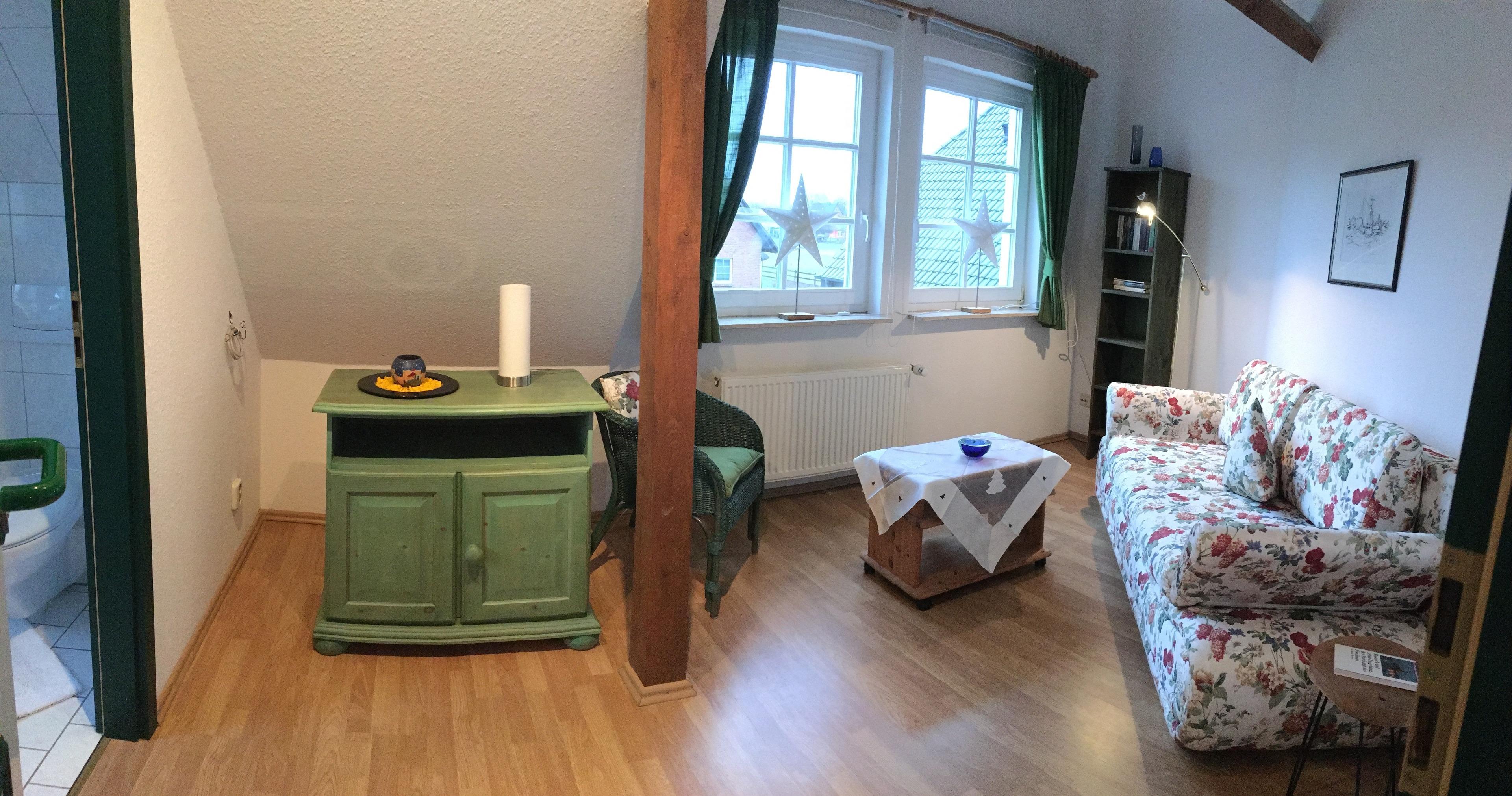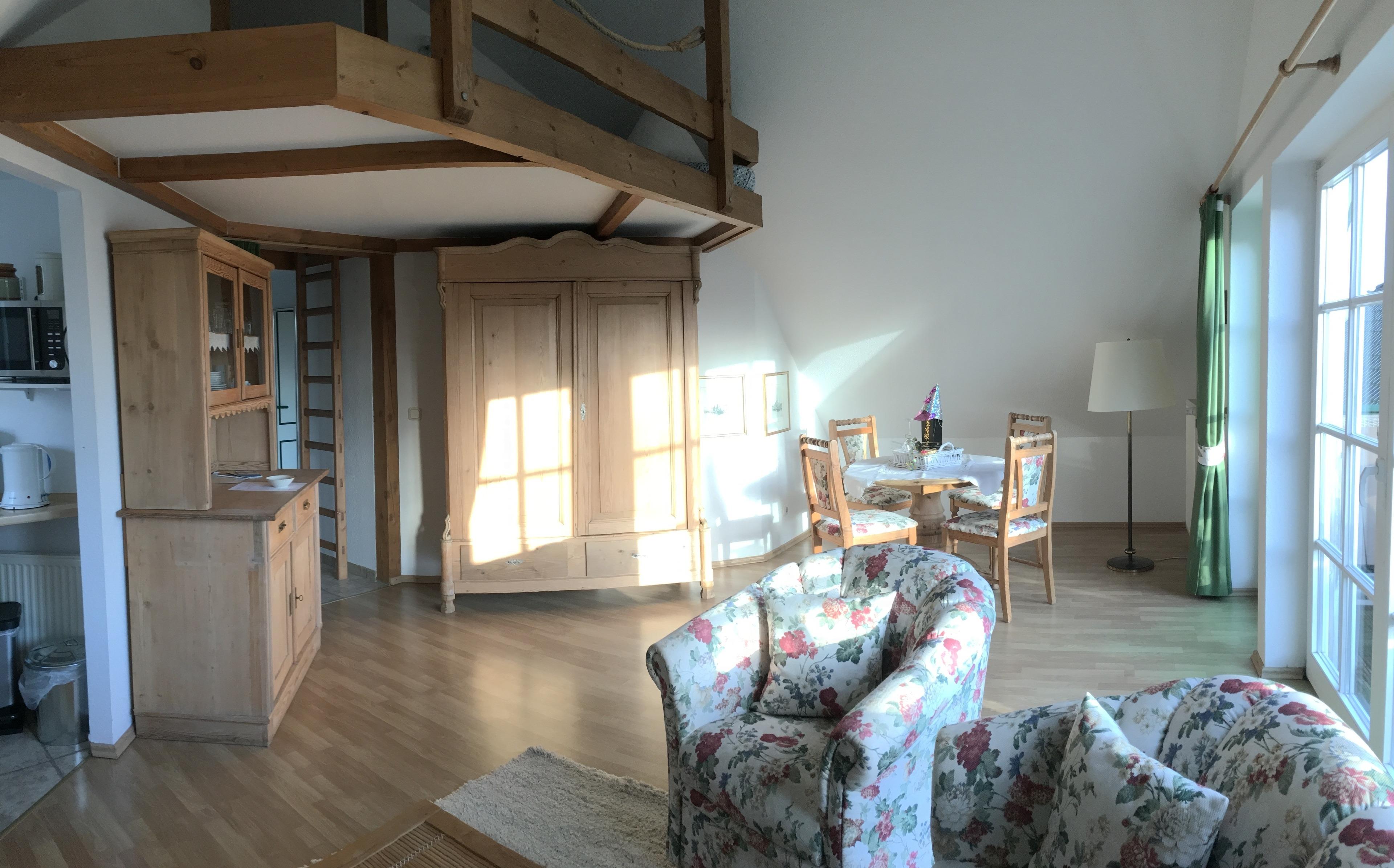 Der bis ins Dach hinein offene Wohnraum der Ferienwohnung \"über Deck\" ist mit seiner sehr gemütlichen Sitzecke und den antiken Weichholzmöbeln im Landhausstil gehalten. Erreichbar über eine separate Außentreppe, ausgestattet mit funktionaler Küche und einem großzügigen Balkon, bietet die Wohnung Platz für bis zu 4 Personen. Durch die zwei gut getrennten Schlafbereiche ist die Ferienwohnung auch für Pärchen oder Eltern mit großen Kindern geeignet. Bitte beachten Sie, dass ein Wäschepaket mit Handtüchern und Bettwäsche optional angeboten wird, sprechen Sie uns an.