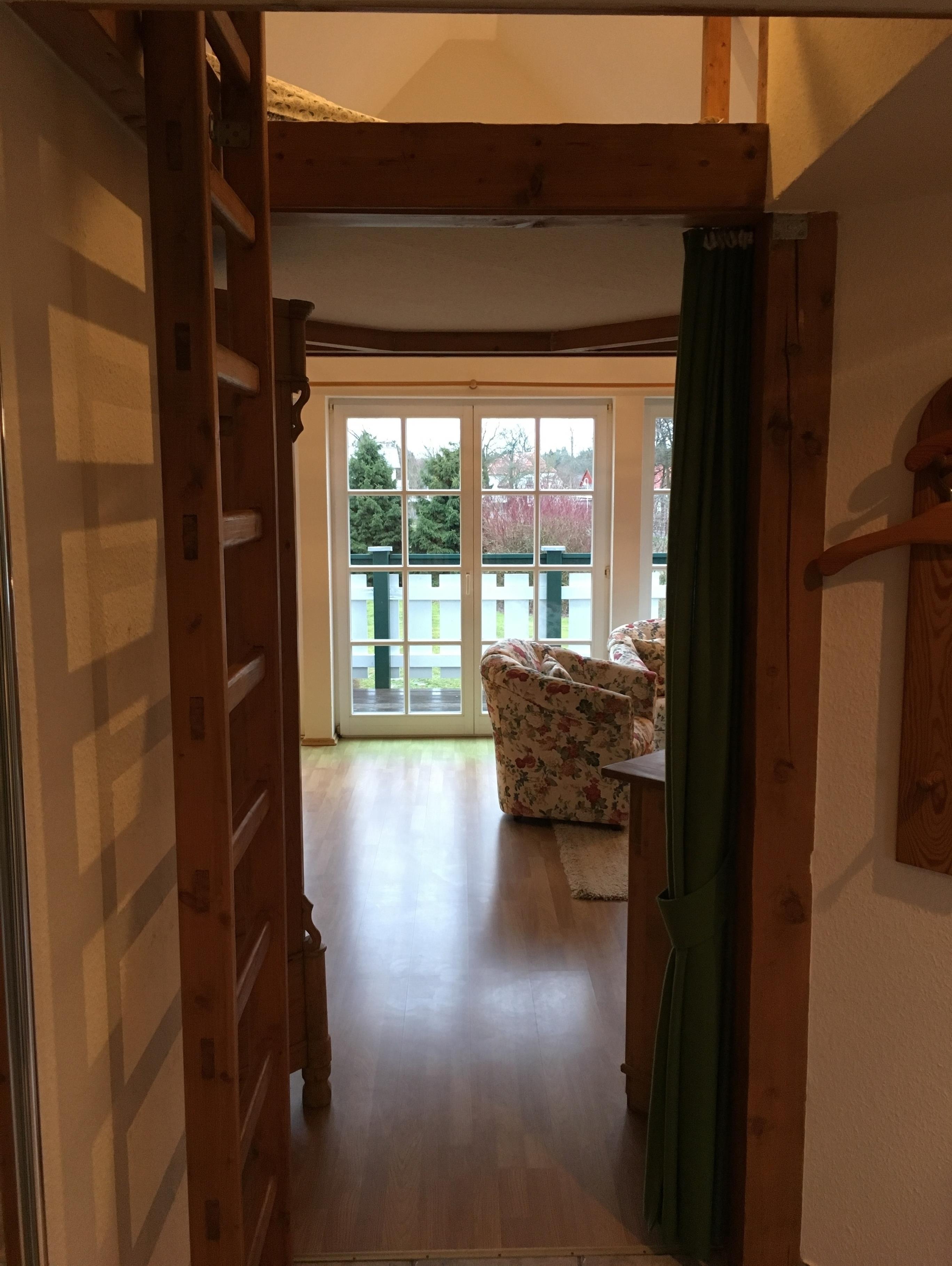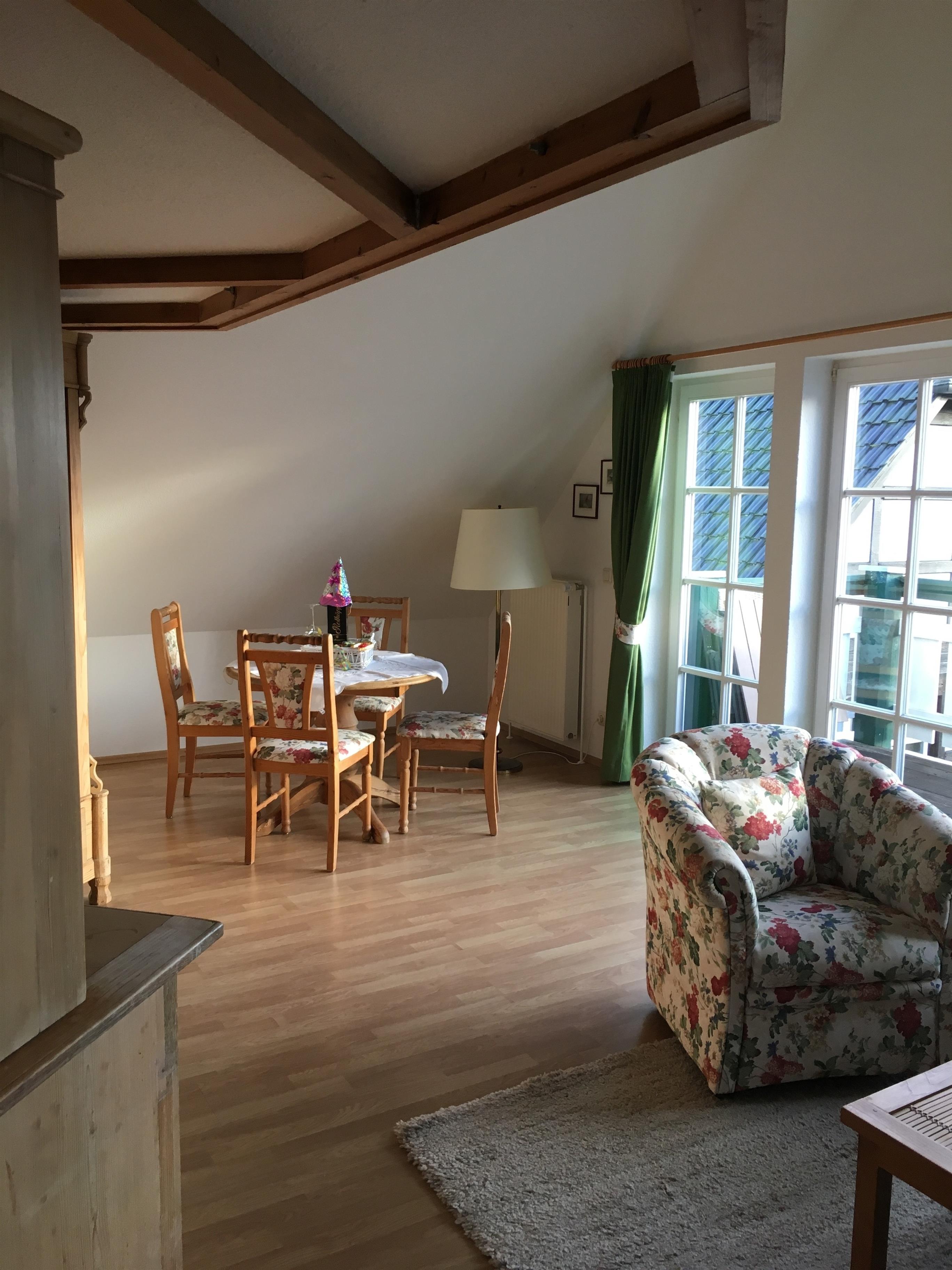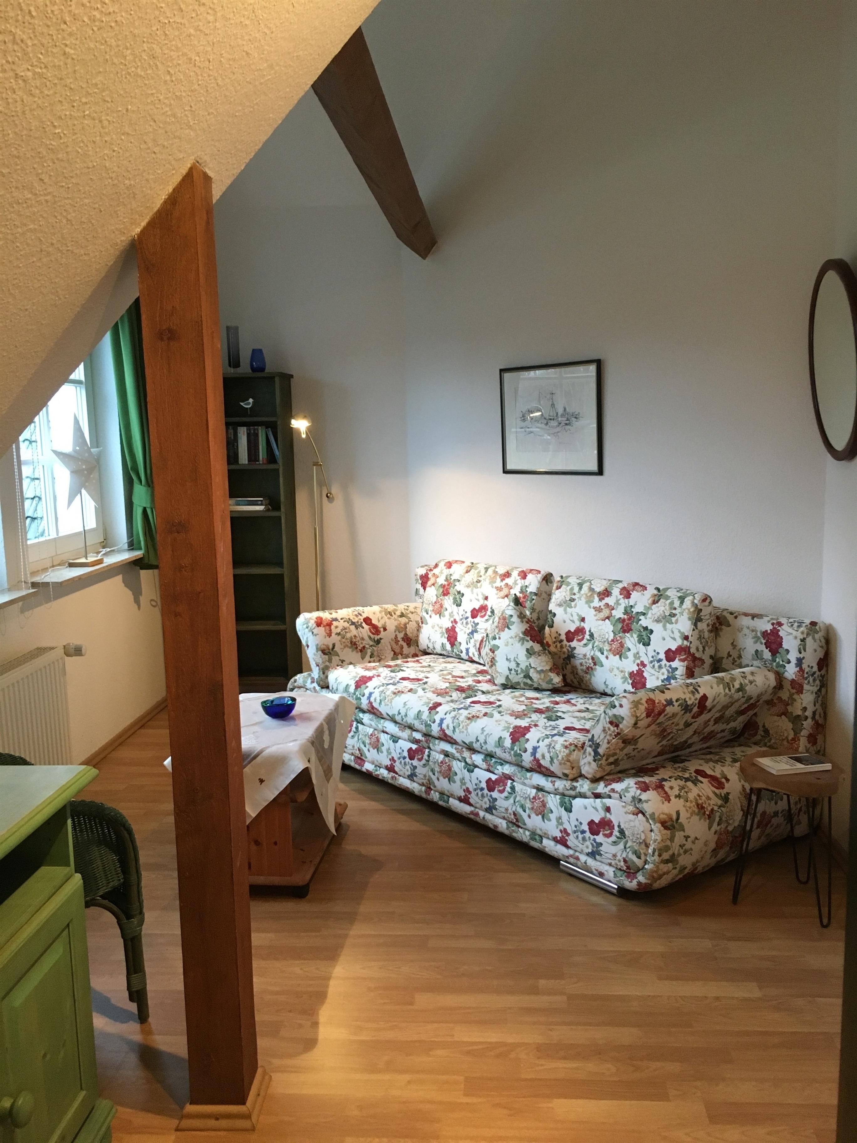 Der bis ins Dach hinein offene Wohnraum der Ferienwohnung \"über Deck\" ist mit seiner sehr gemütlichen Sitzecke und den antiken Weichholzmöbeln im Landhausstil gehalten. Erreichbar über eine separate Außentreppe, ausgestattet mit funktionaler Küche und einem großzügigen Balkon, bietet die Wohnung Platz für bis zu 4 Personen. Durch die zwei gut getrennten Schlafbereiche ist die Ferienwohnung auch für Pärchen oder Eltern mit großen Kindern geeignet. Bitte beachten Sie, dass ein Wäschepaket mit Handtüchern und Bettwäsche optional angeboten wird, sprechen Sie uns an.