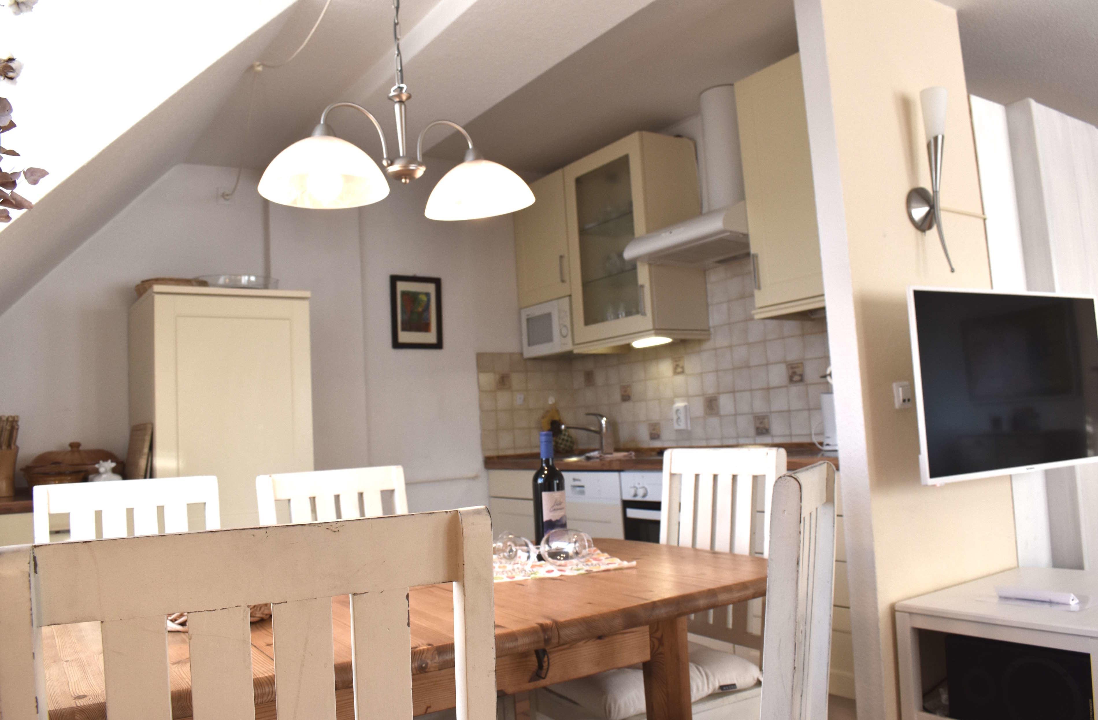 3 Zimmer-Maisonette ca. 75 qm für 2-6 Personen, Haus A in der Residenz Kormoran, Grüne Straße 45A-R, Ostseebad Prerow. 1.OG: Wohnzimmer mit Schlafcouch, Sitzgarnitur, Kleiderschrank, SAT-TV/Radio, WLAN, Duschbad/WC, Balkon, Essecke mit Küchenzeile (Spülmaschine). 2.OG: 2 Schlafzimmer, 1x Doppelbett, 1x 2 Einzelbetten, Dusche/WC