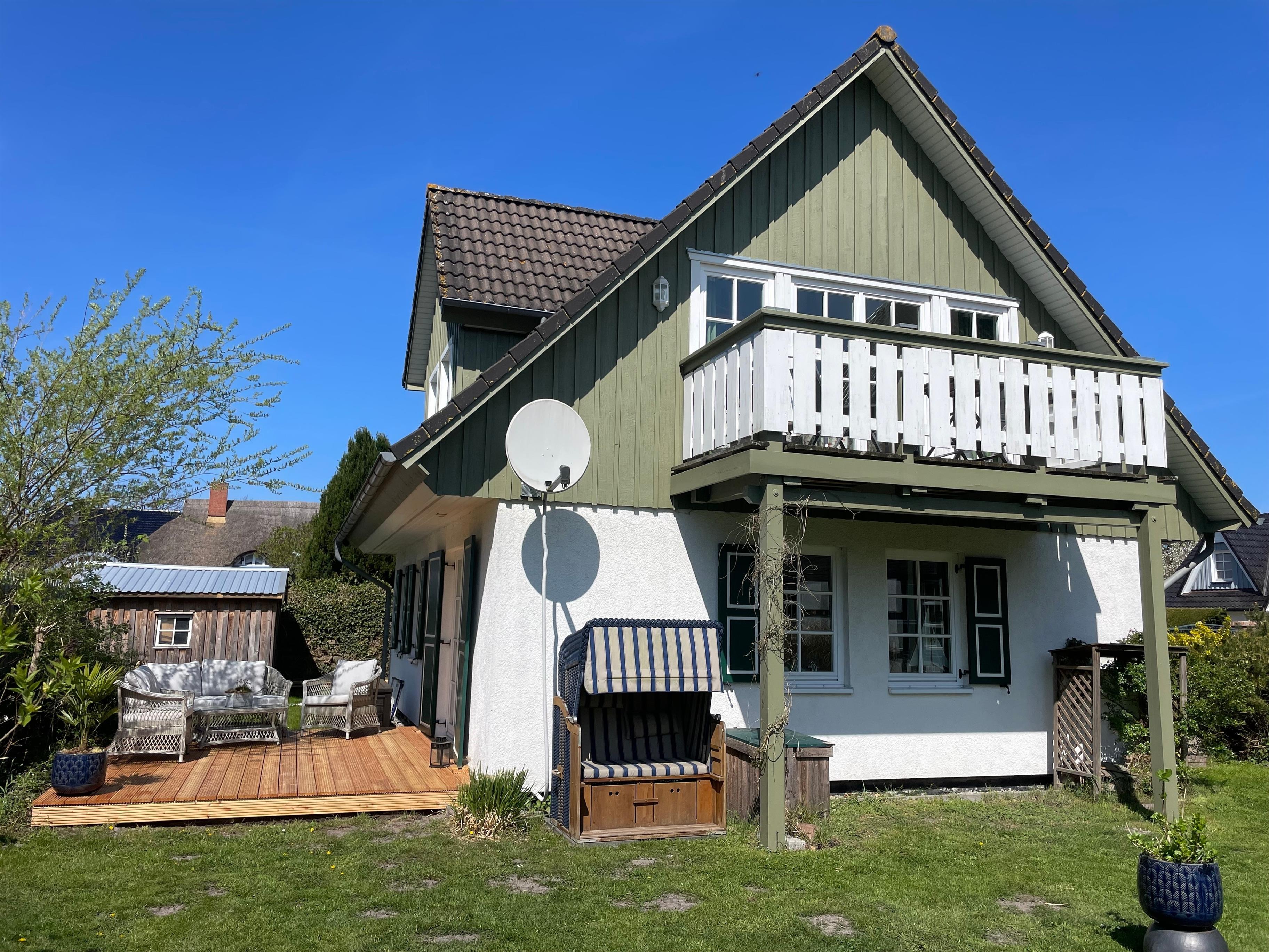 Sonnige Terrasse im grünen. Absolute Ruhe durch Endlage am Privatweg. Kein Verkehr vor der Tür(!). Keine Ferienanlage \"dicht an dicht\". Sie wohnen mitten zwischen den Prerowern. Antike Möbel kombiniert mit moderner Einrichtung. Typisches Darßer Leben. Tipp: Reisen Sie mir 6 oder 8 Personen, mieten Sie das ganze Ferienhaus Schiffen... \"An Deck und Unter Deck\".