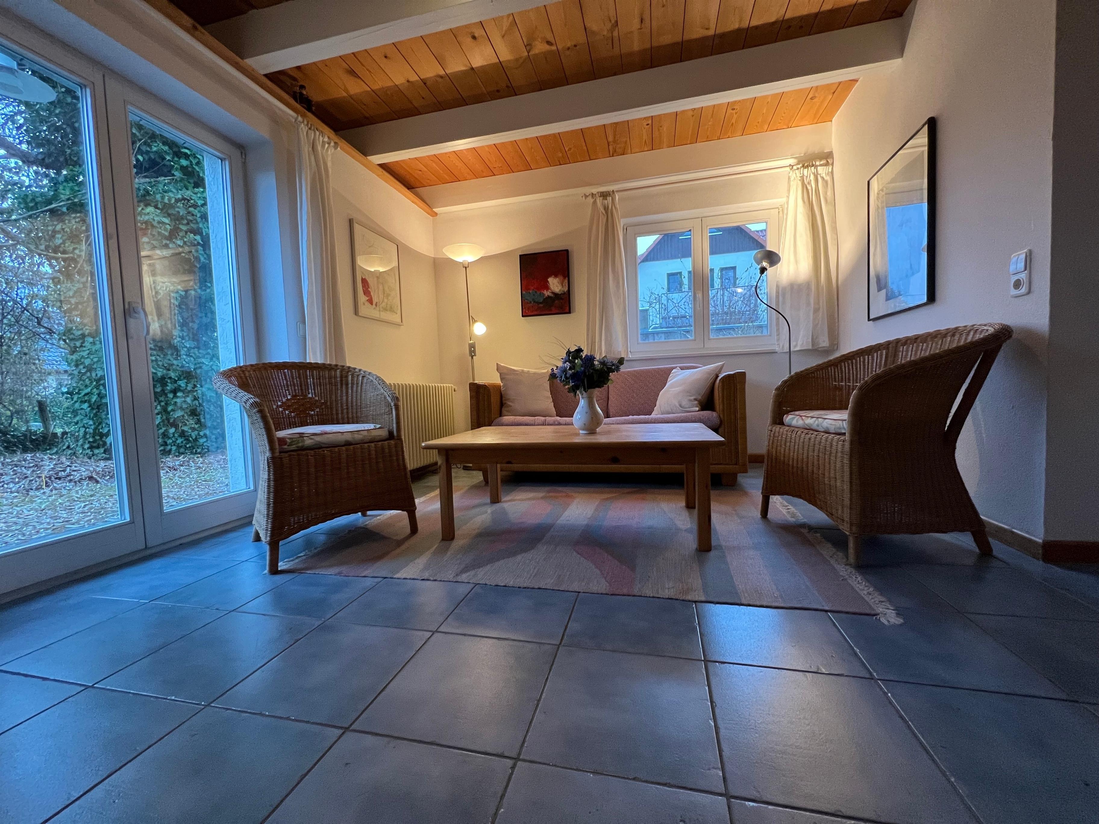 Garderobe im Flur, Wohnzimmer mit Schwedenofen, Couch, Sessel, Truhe. TV, Radio, CD´s, Bücher und Spiele. Bad mit WC, Waschtisch und Dusche mit transparenter Trennwand (keine Vorhänge).